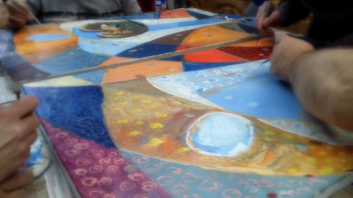 Pensjonariusze Domu Pomocy Społecznej, z pomocą terapeutów, i moją, przygotowują obrazy na dużą wystawę. Posługujemy się techniką olejną… i puszczamy wodze fantazji.