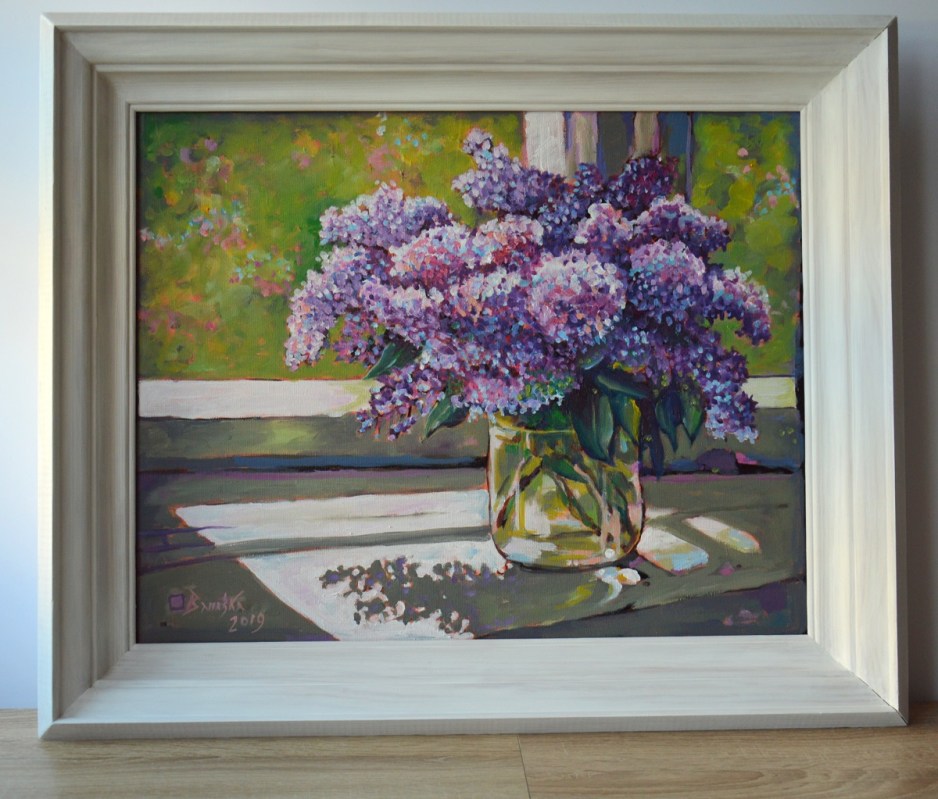 oprawiony w drewnianą, malowaną na biało ramę o wymiarach zewnętrznych 50x60cm