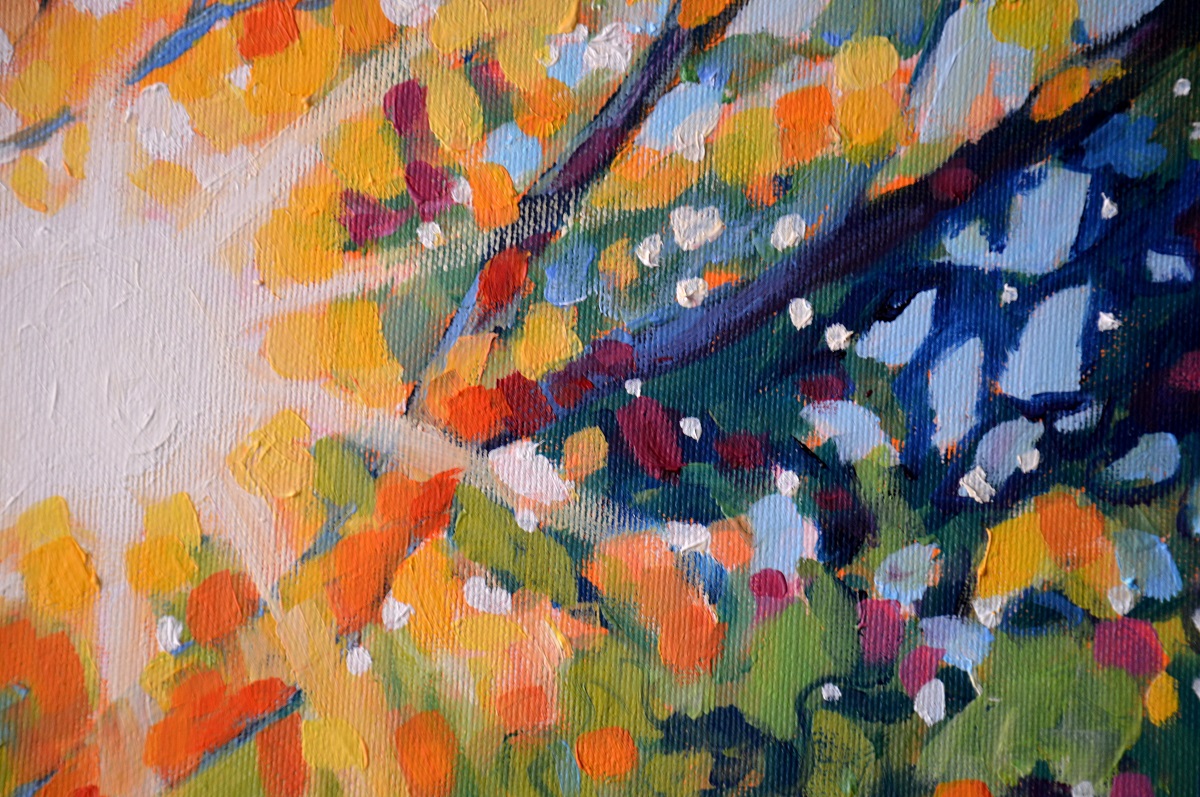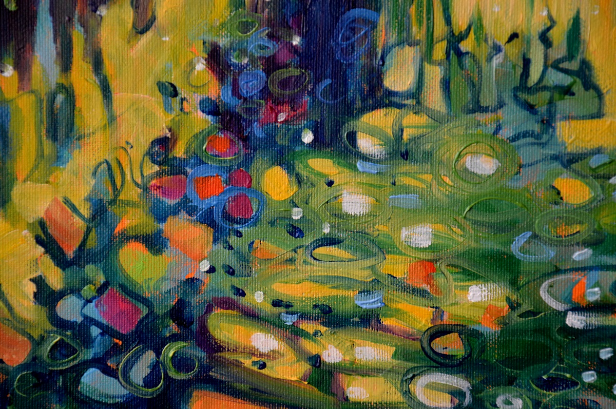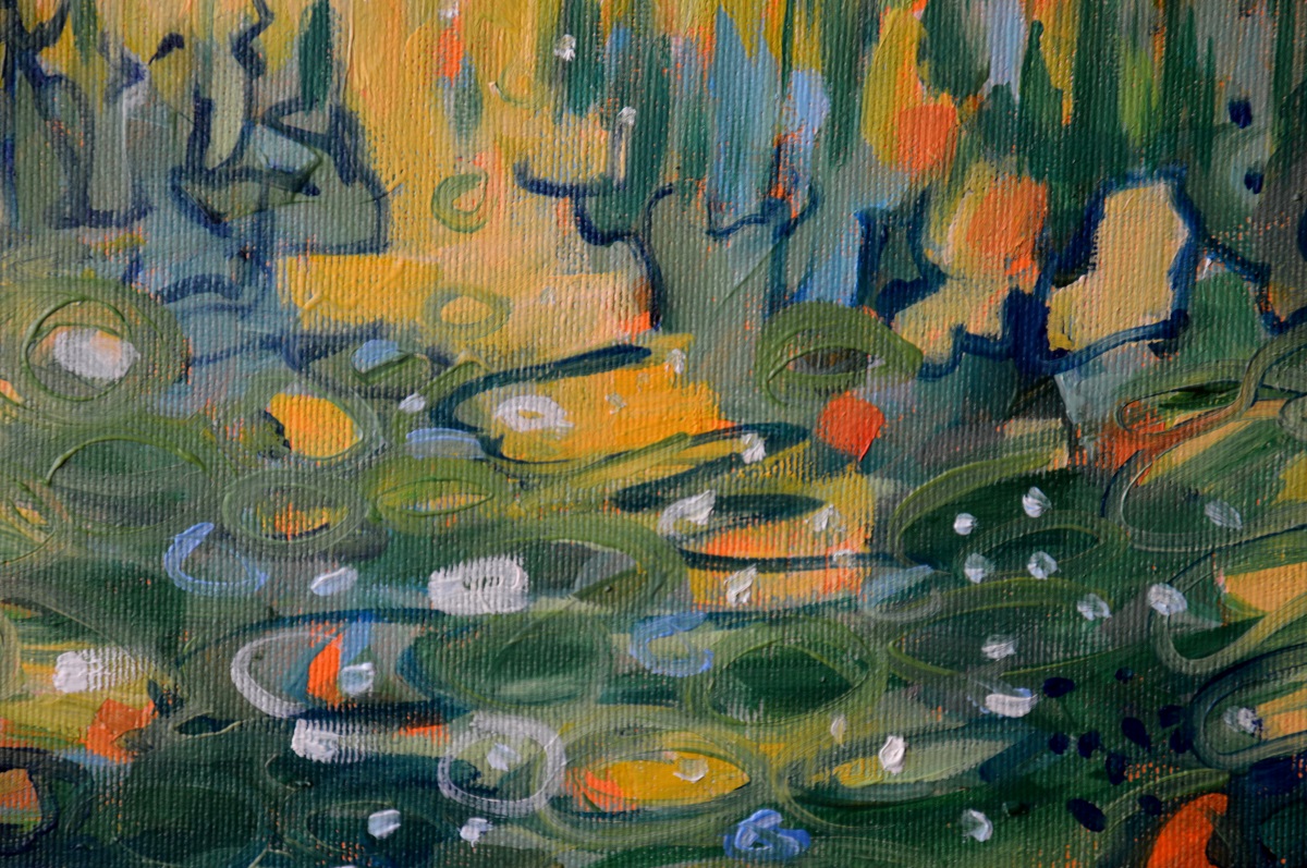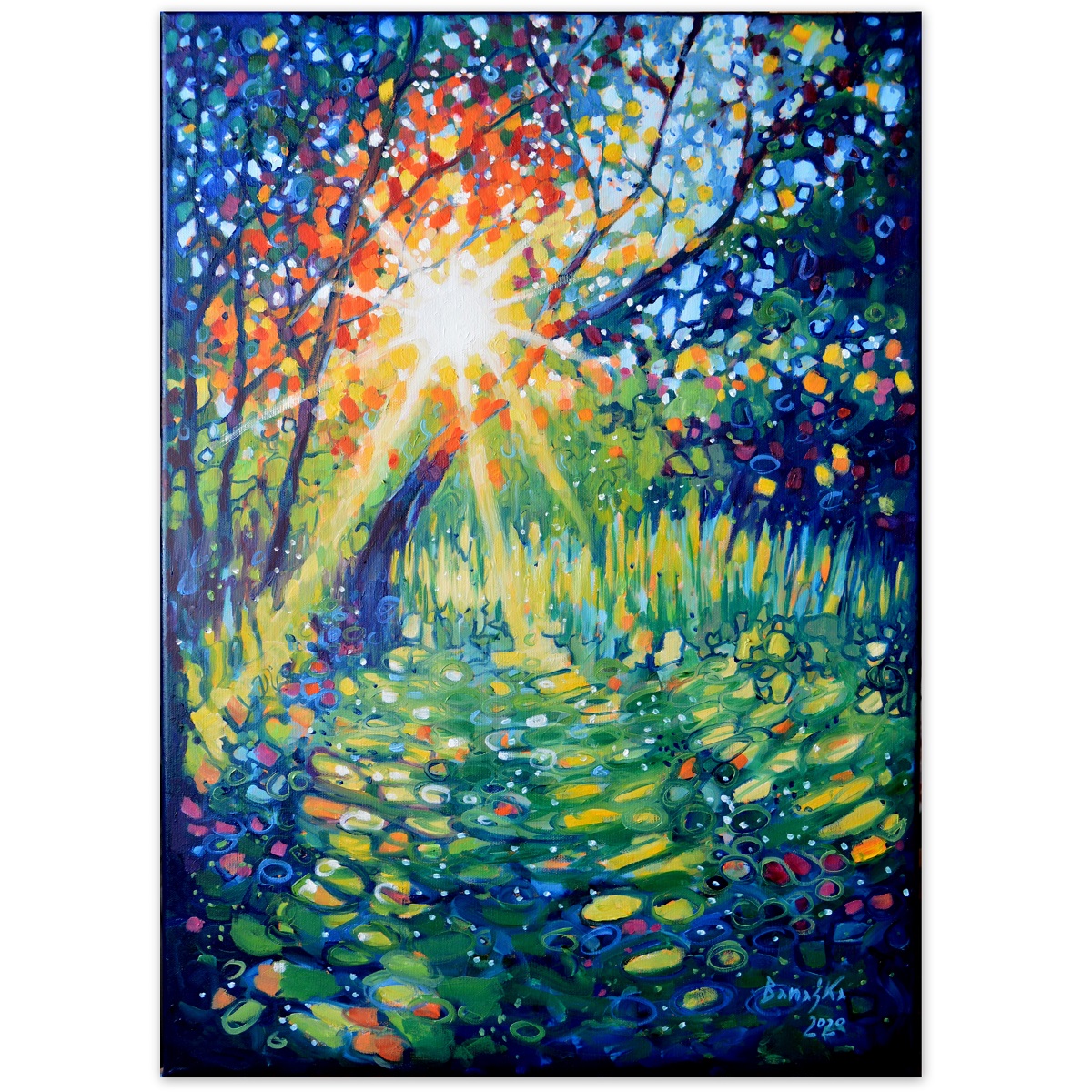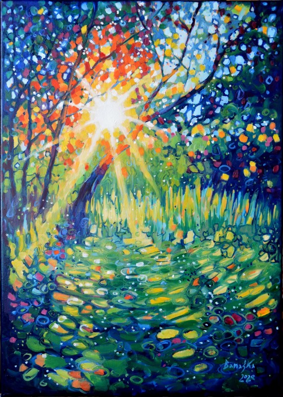 Przebijające się przez korony drzew słońce, kontrastuje z zacienionymi zaroślami. Barwne plamy mieszają się tworząc roziskrzoną mozaikę. Żywa kolorystyka, drobne plamy barw budują strukturę światła i zarośli .