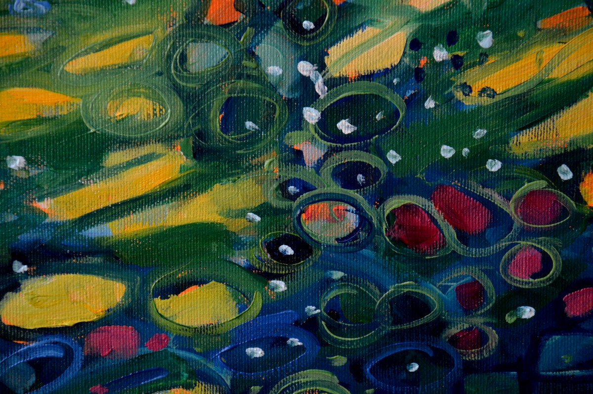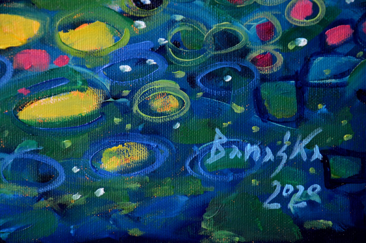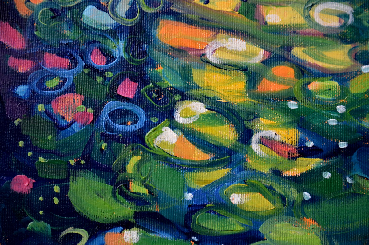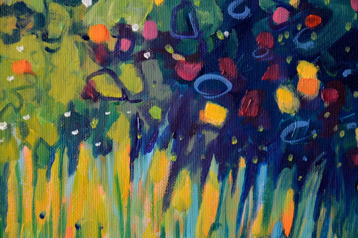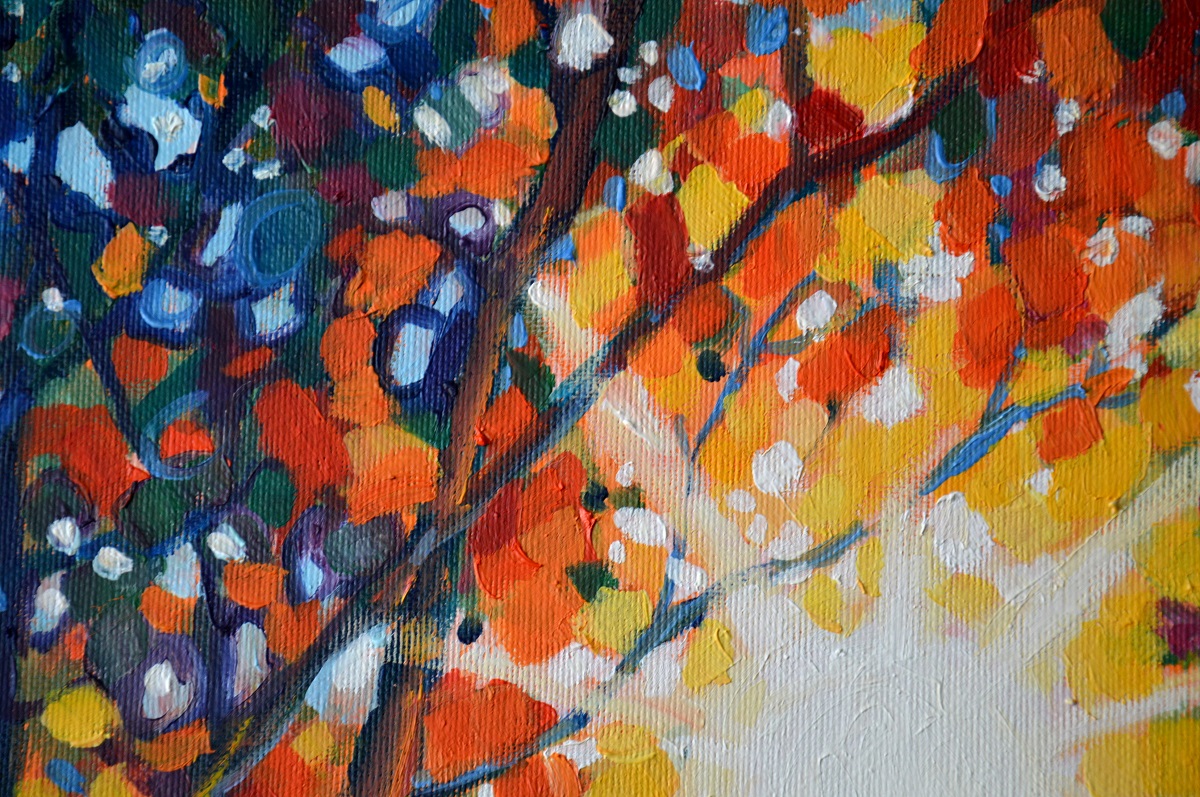 Przebijające się przez korony drzew słońce, kontrastuje z zacienionymi zaroślami. Barwne plamy mieszają się tworząc roziskrzoną mozaikę. Żywa kolorystyka, drobne plamy barw budują strukturę światła i zarośli .
