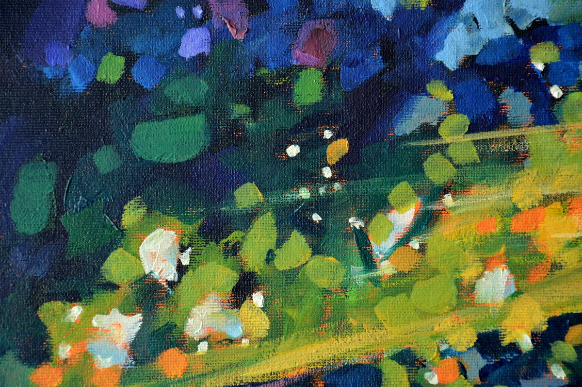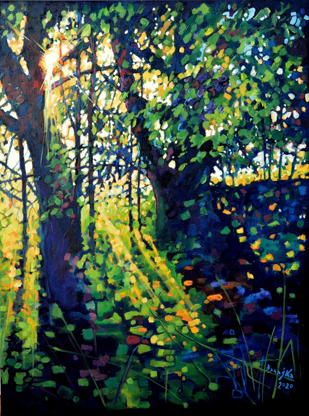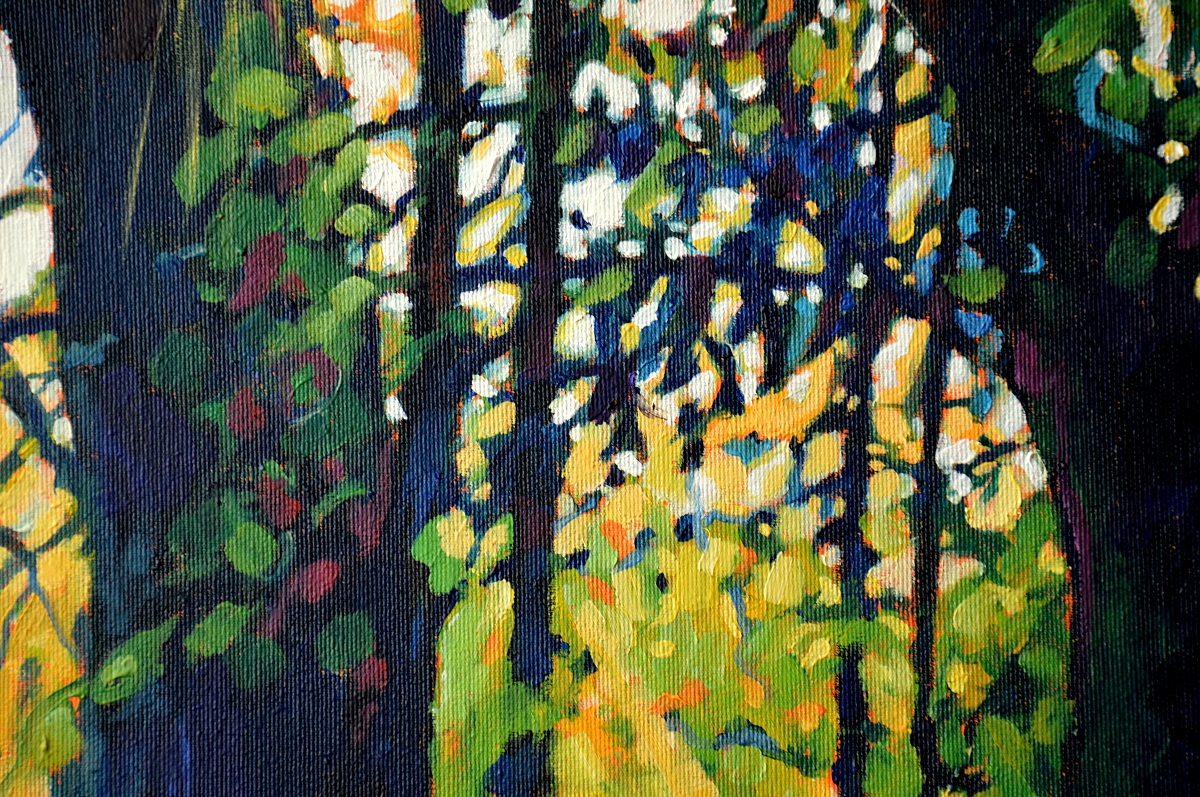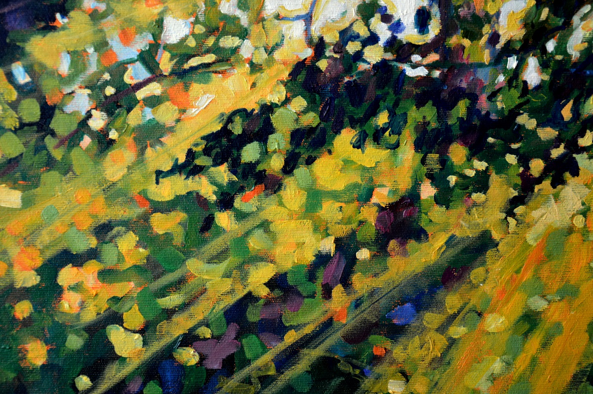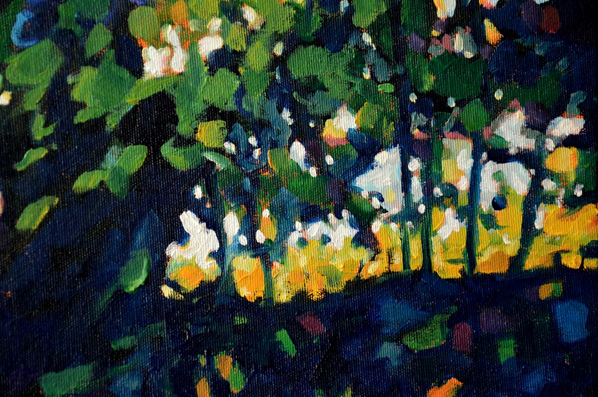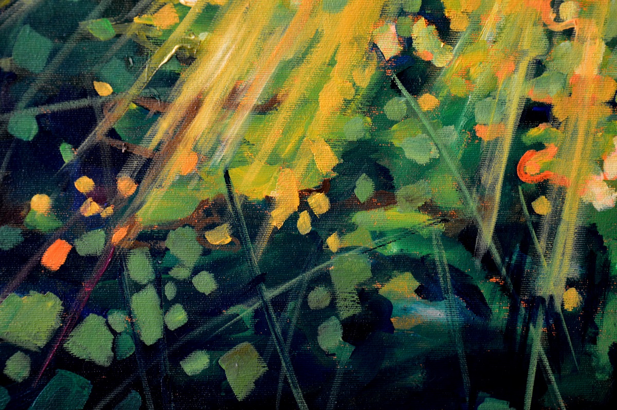 Przebijające się przez korony drzew słońce, kontrastuje z zacienionymi zaroślami. Barwne plamy mieszają się tworząc roziskrzoną mozaikę. Żywa kolorystyka, drobne plamy barw budują strukturę światła i zarośli .