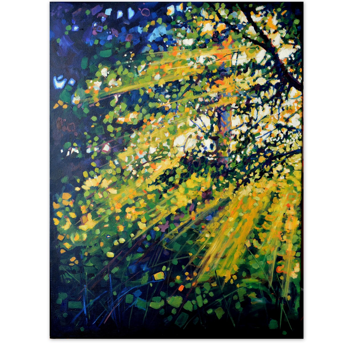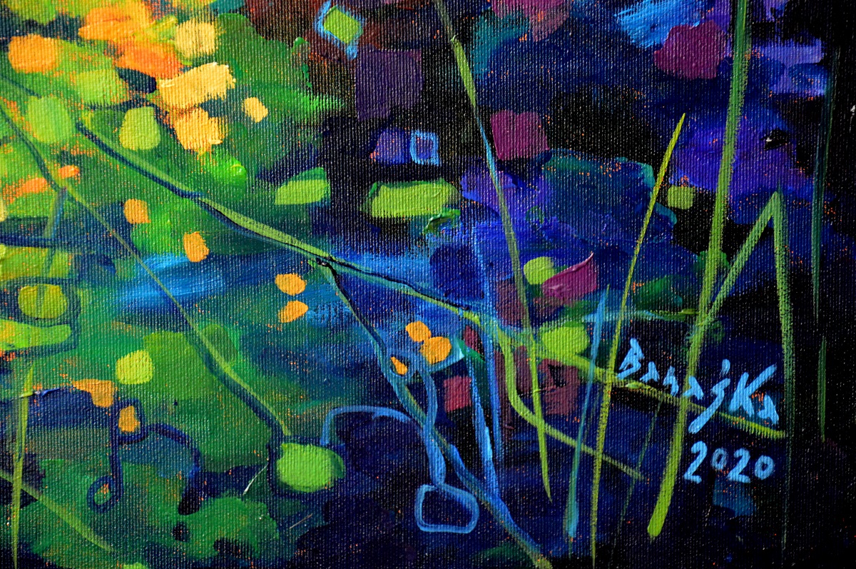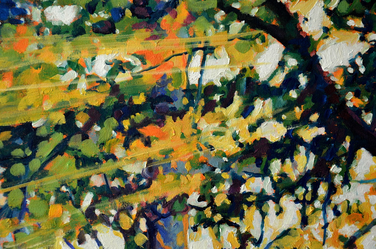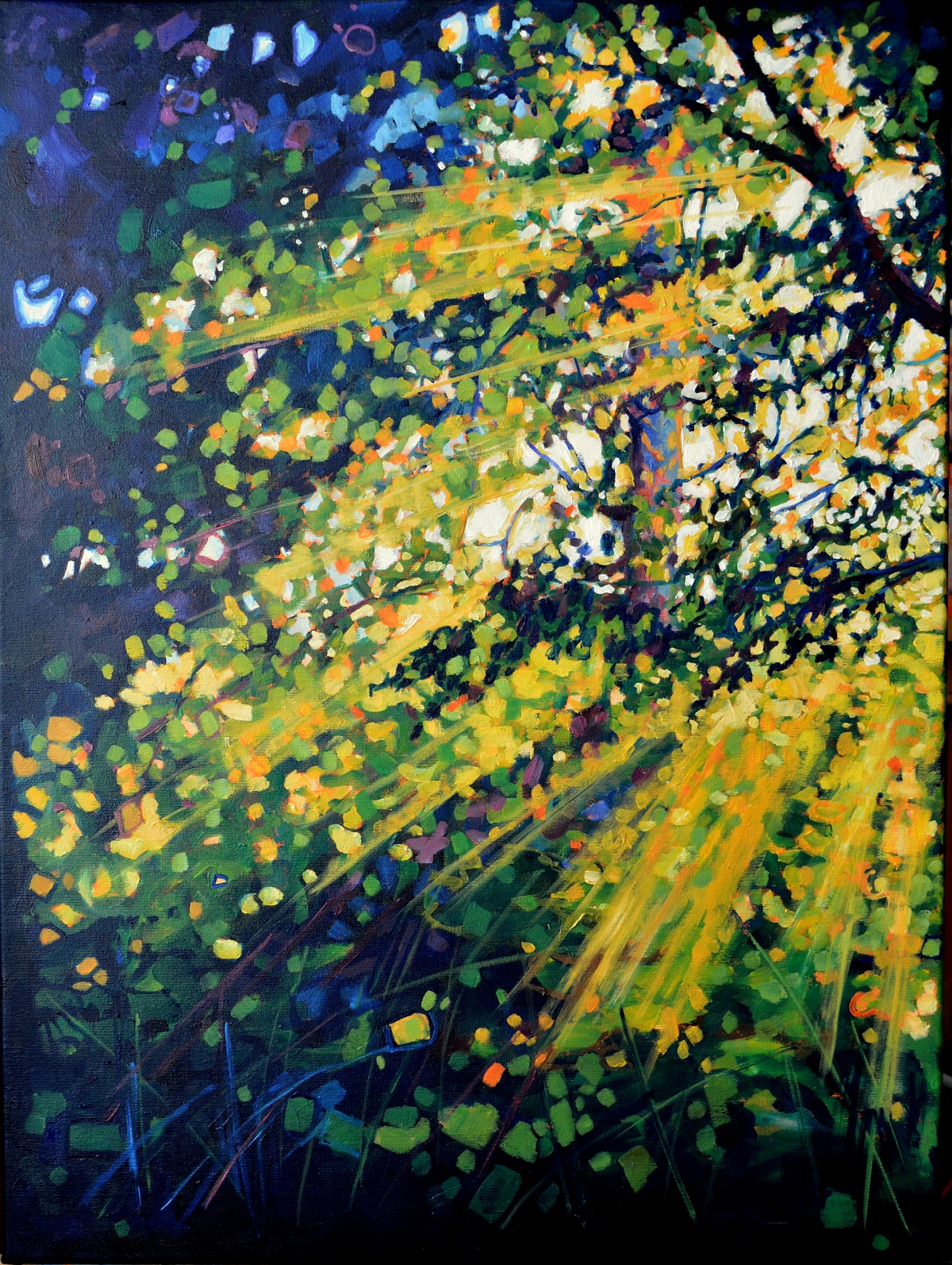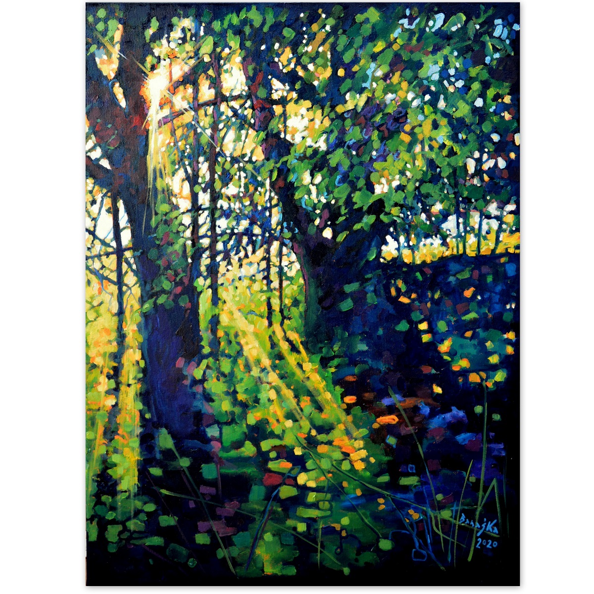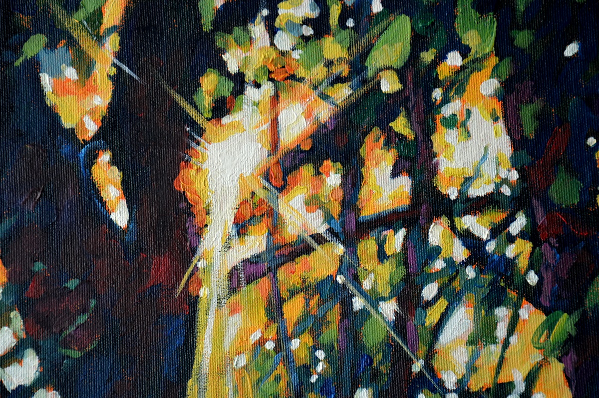 Przebijające się przez korony drzew słońce, kontrastuje z zacienionymi zaroślami. Barwne plamy mieszają się tworząc roziskrzoną mozaikę. Żywa kolorystyka, drobne plamy barw budują strukturę światła i zarośli .