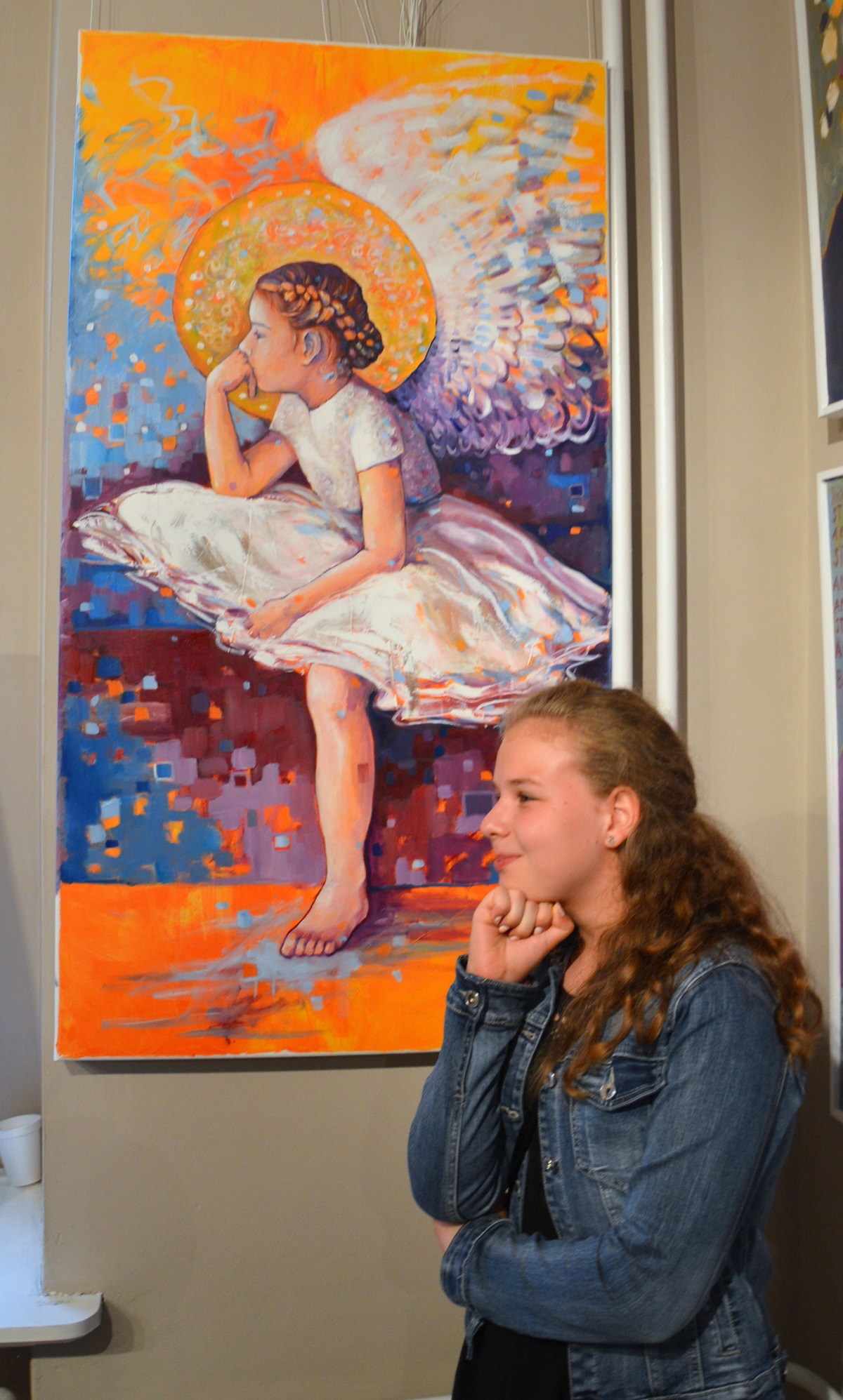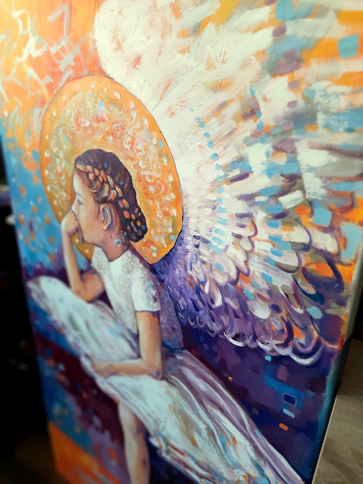 „Na brzegach widać gołe płótno, pomarańczowa podmalówka razi w oczy, jakieś luźne mazy farby rozpraszają skrzydła, zaplątały się tu jakieś kwadraty, plamy kolorów przepychają się nieskładnie… Gdzie jest ład i harmonia?! Jak tu spokojnie rozmyślać?! Ajajaj! Przecież widać jak na dłoni, jak po kolei z jakich plam, kolorów i mazów powstaje zamyśłony Anioł!„