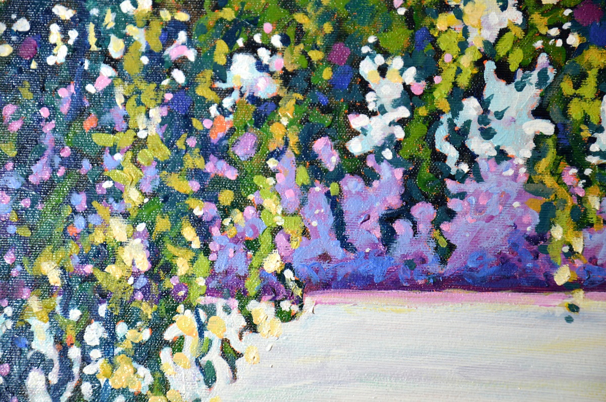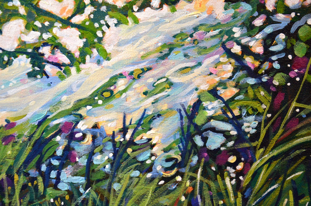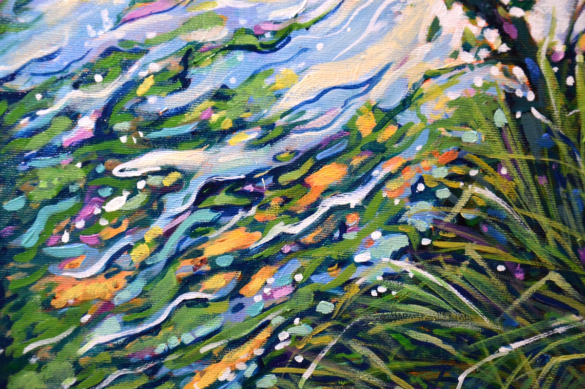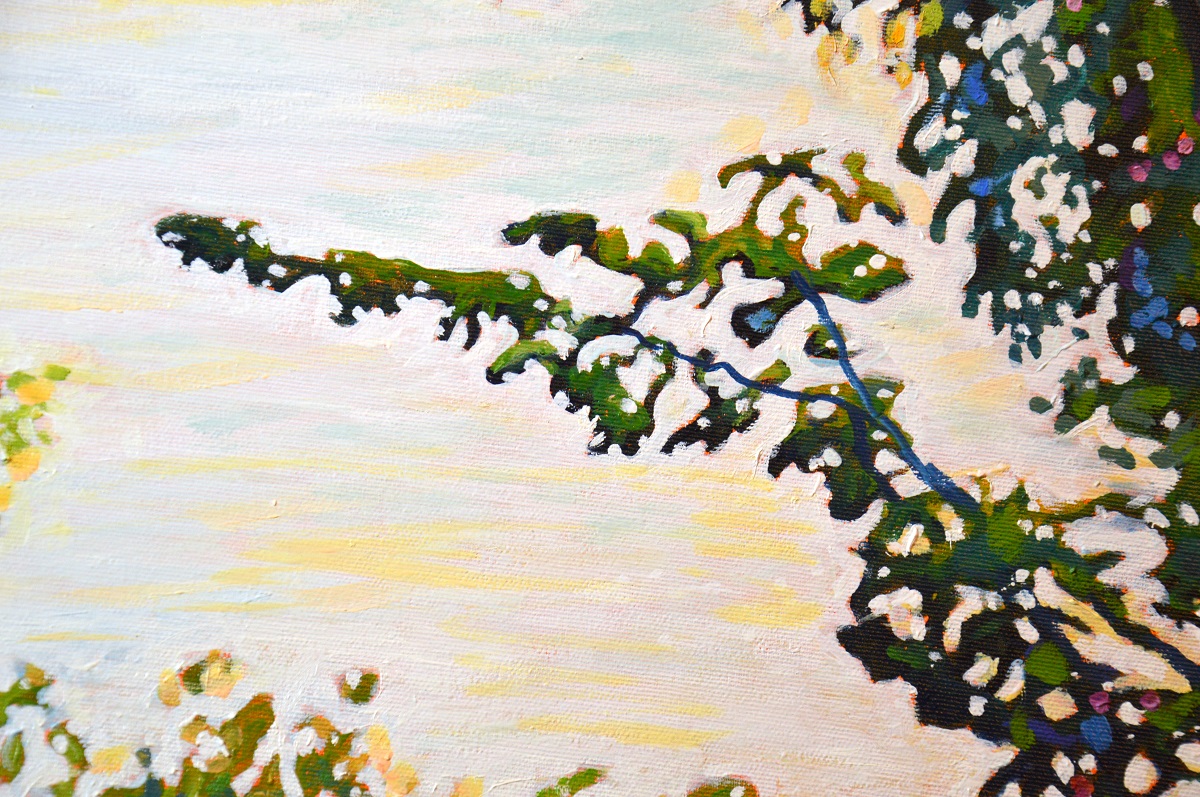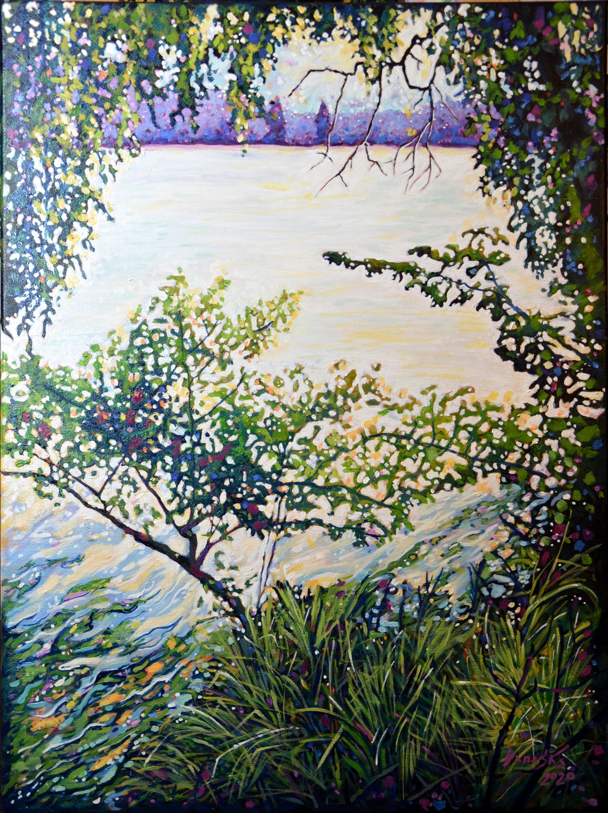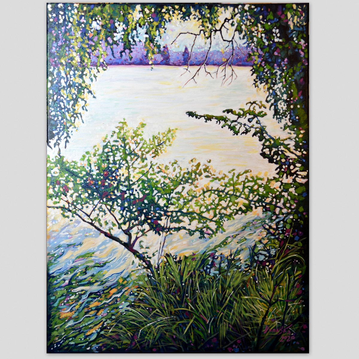 Światło odbija się w wodach jeziora. Podświetla zarośla na brzegu. Barwne plamy na wodzie mieszają się tworząc roziskrzoną mozaikę. Żywa kolorystyka, drobne plamy barw budują strukturę światła, wody i zarośli. W tle rozmyty i zróżowiony drugi brzeg.