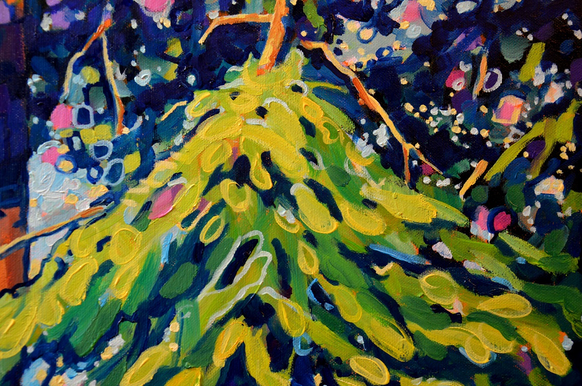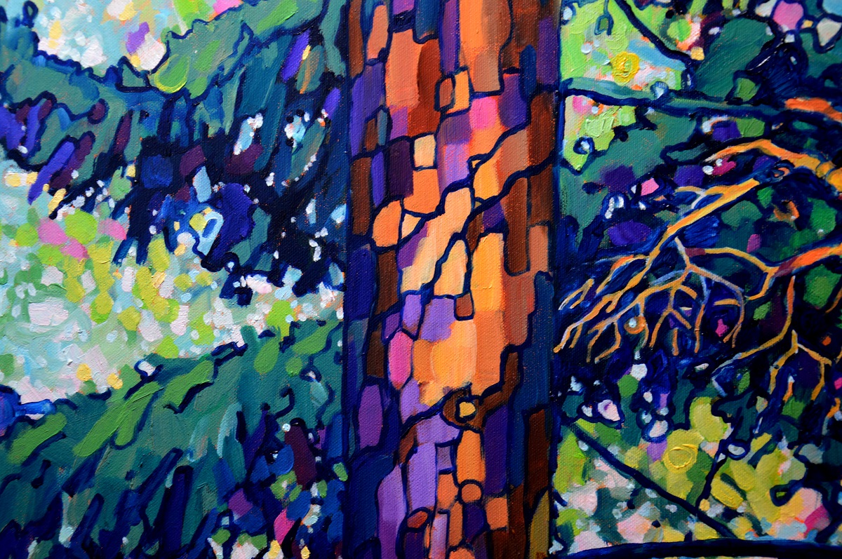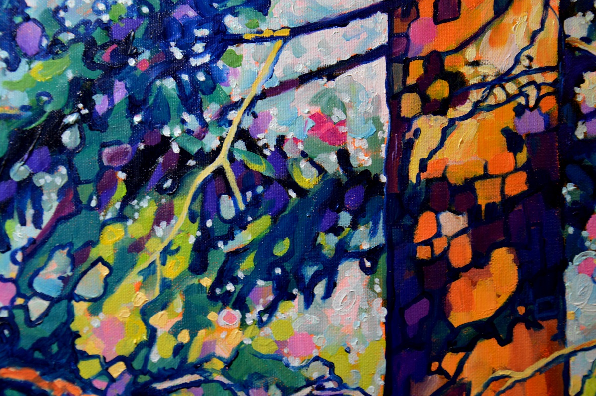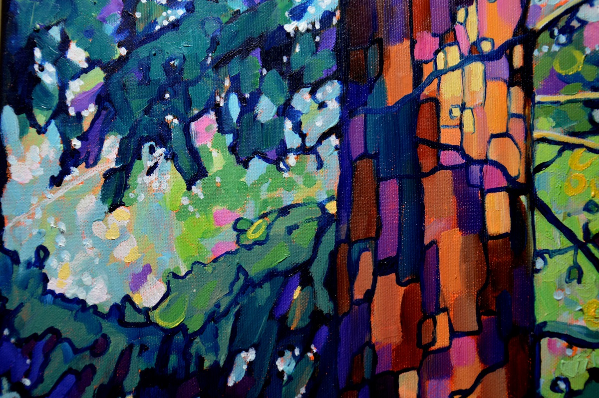 Światło przebija się przez gałęzie. Podświetla ognistą korę. Zieleń gałęzi błądzi od ogrzanej porankiem cytrynowo zielonej aż po głąbokie szmaragdy i ukryty w cieniu granat. Jasny błękit tła wydobywa zarys gałęzi. Żywe linie wiją się po rysnku kory, po zieleniach i pomarańczach, aż rozmyją się w tle. Żywe kontrasty, drobne plamy barw budują strukturę światła i gałęzi, tworząc gęstwinę, która hipnotyzuje wzrok.