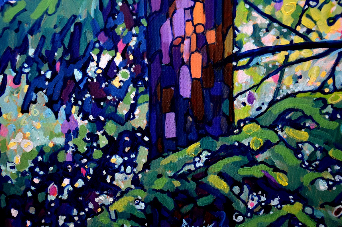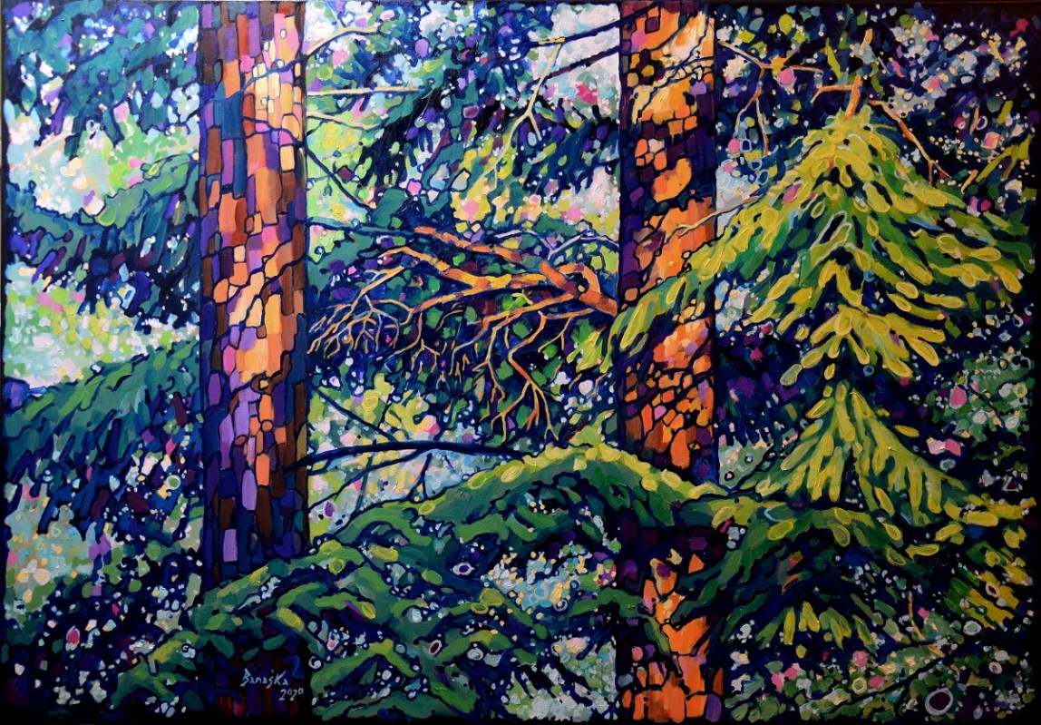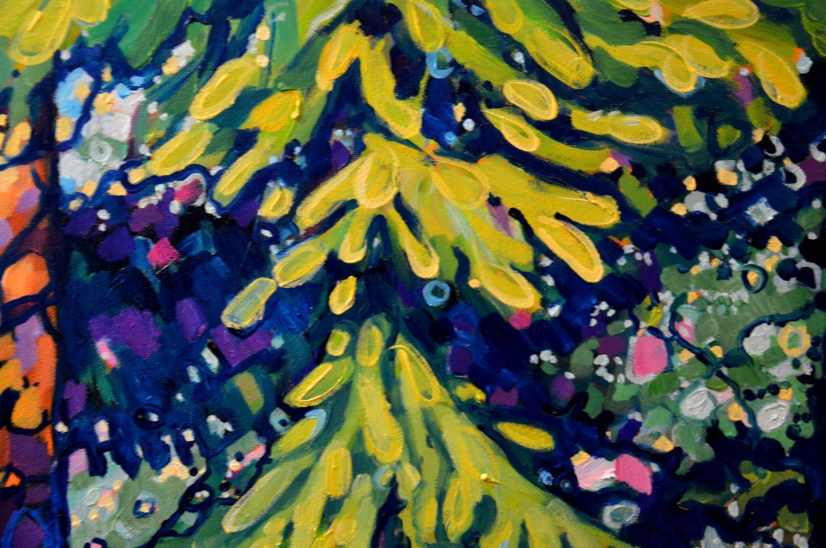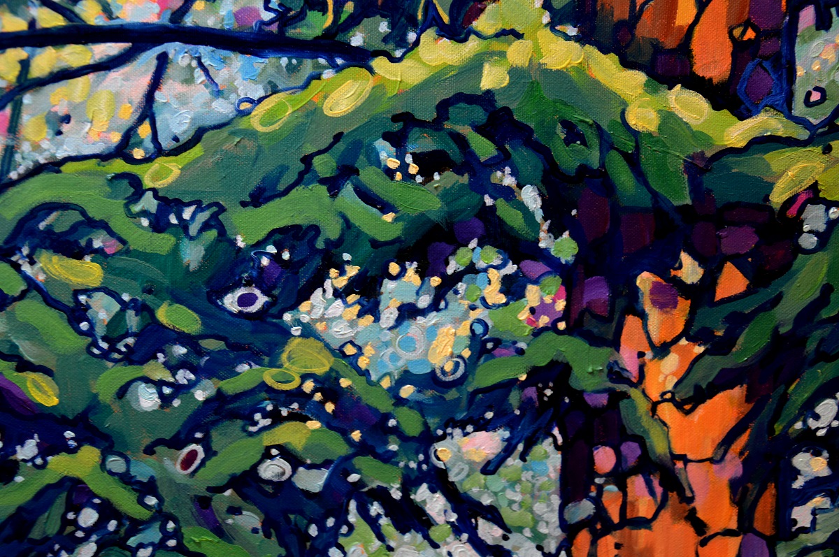 Światło przebija się przez gałęzie. Podświetla ognistą korę. Zieleń gałęzi błądzi od ogrzanej porankiem cytrynowo zielonej aż po głąbokie szmaragdy i ukryty w cieniu granat. Jasny błękit tła wydobywa zarys gałęzi. Żywe linie wiją się po rysnku kory, po zieleniach i pomarańczach, aż rozmyją się w tle. Żywe kontrasty, drobne plamy barw budują strukturę światła i gałęzi, tworząc gęstwinę, która hipnotyzuje wzrok.