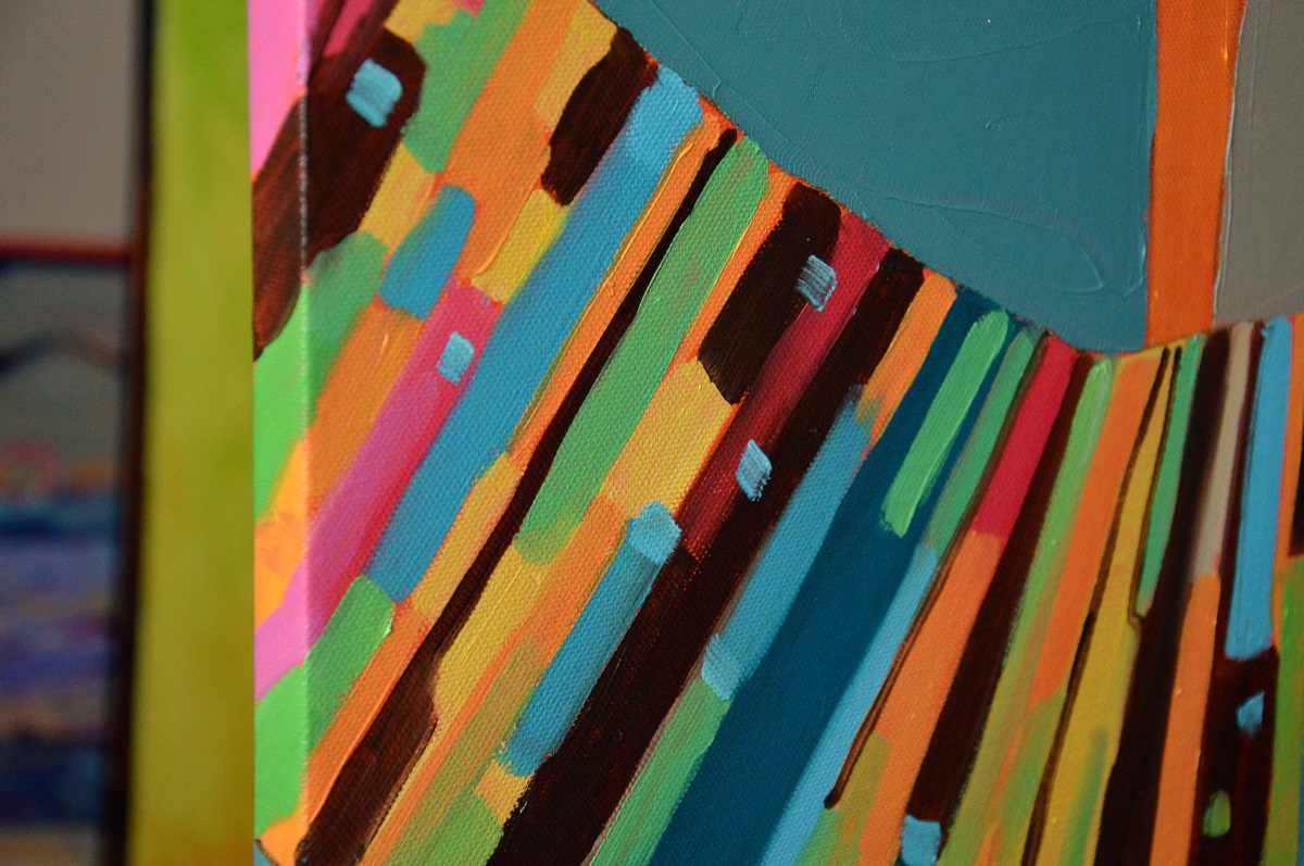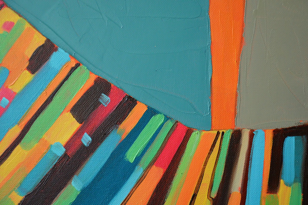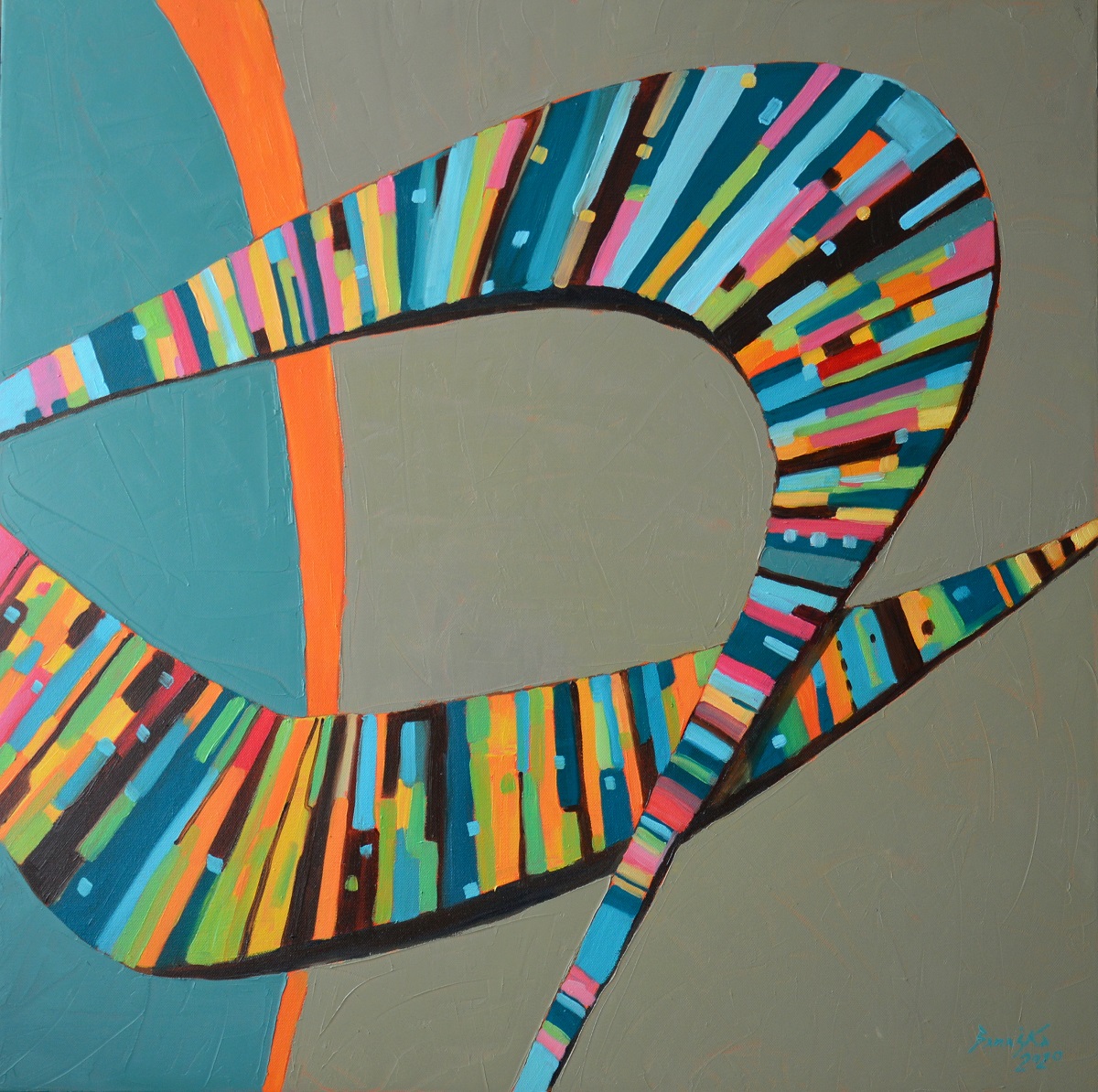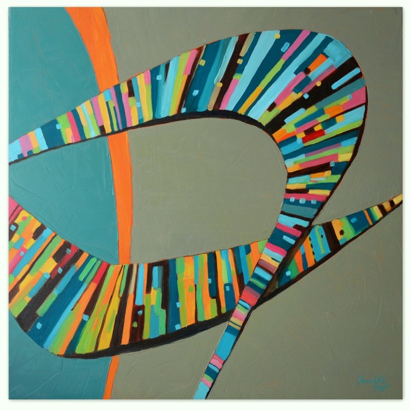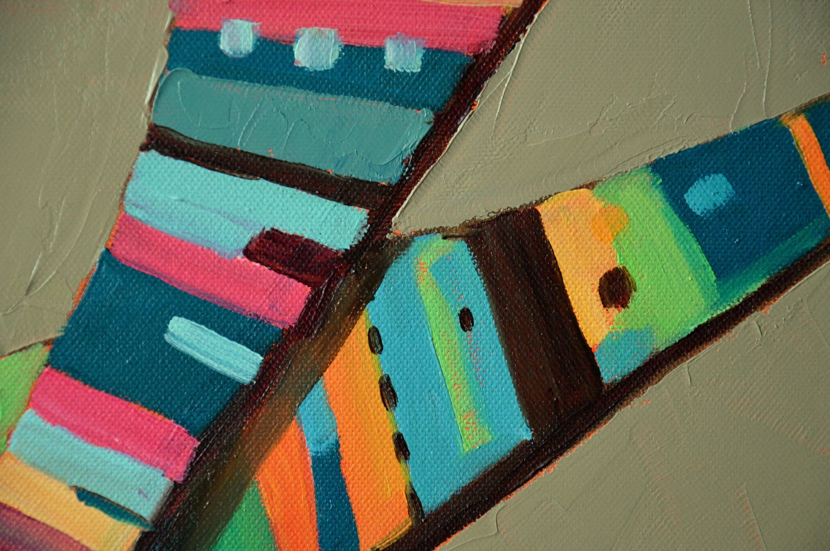 Barwna, dynamiczna kompazycja. Abstrakcyjne kształty wstęg pomalowane w nieregularne kolorowe desenie o lekko folkowym posmaku.