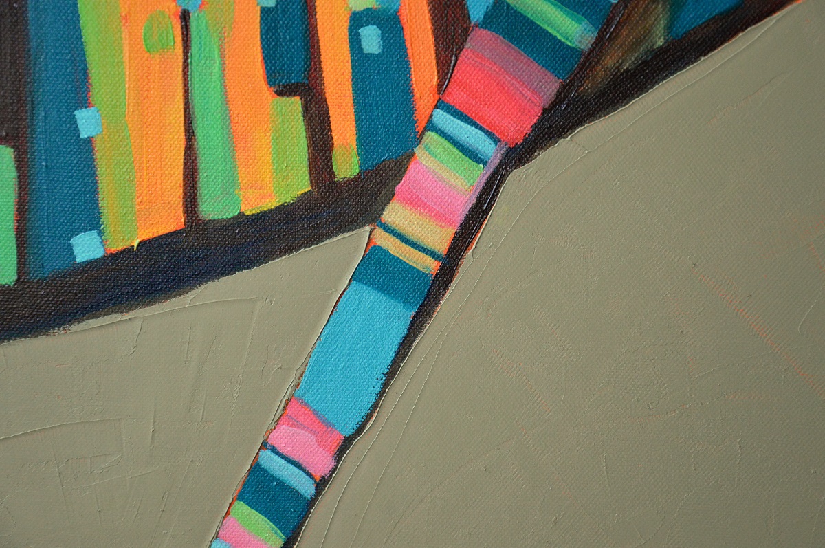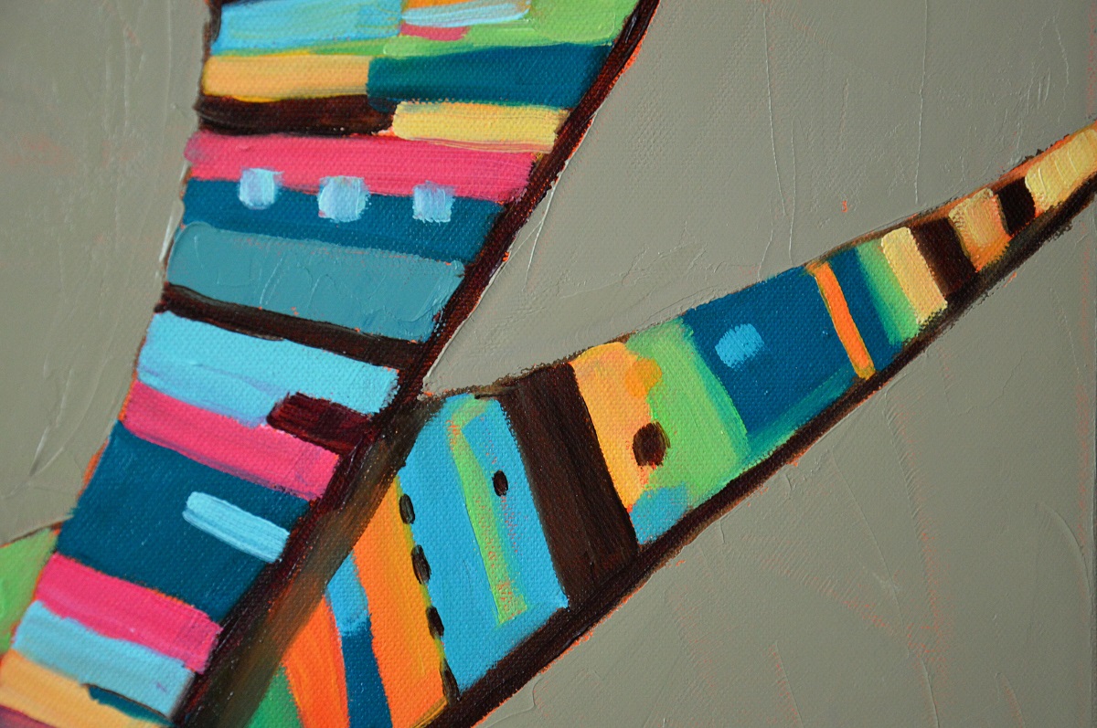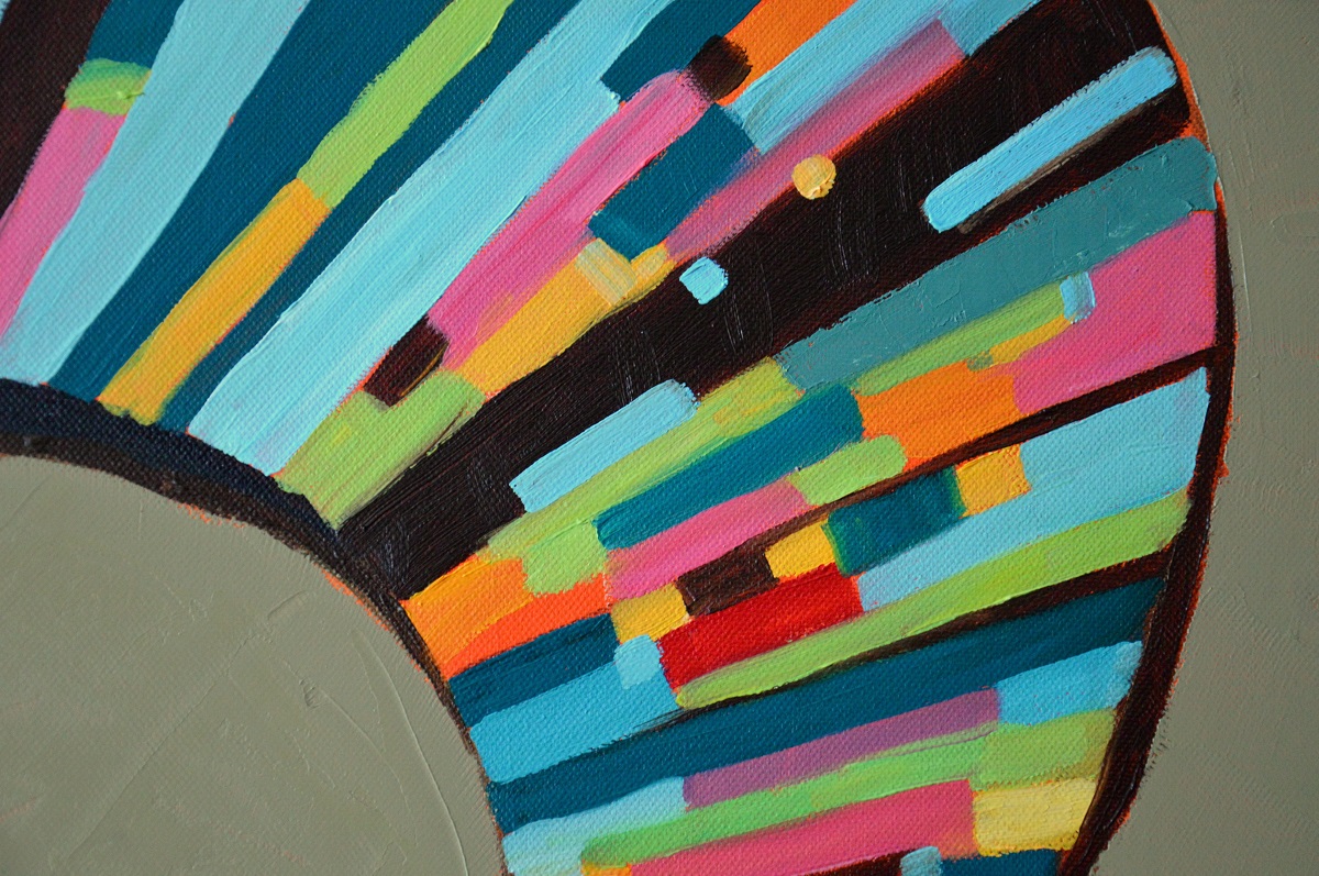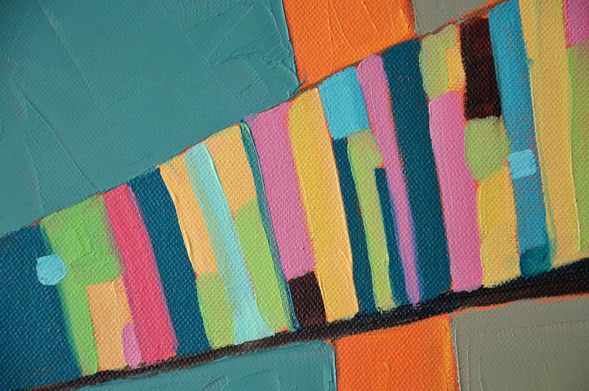Barwna, dynamiczna kompazycja. Abstrakcyjne kształty wstęg pomalowane w nieregularne kolorowe desenie o lekko folkowym posmaku.