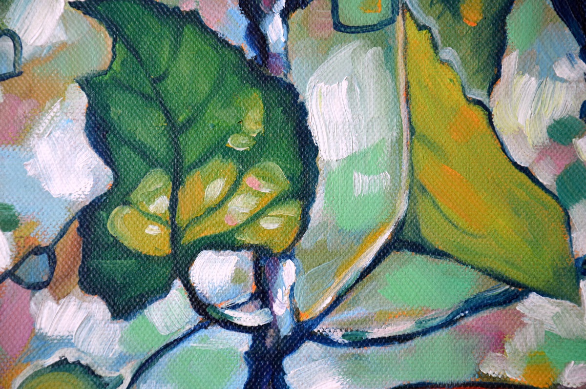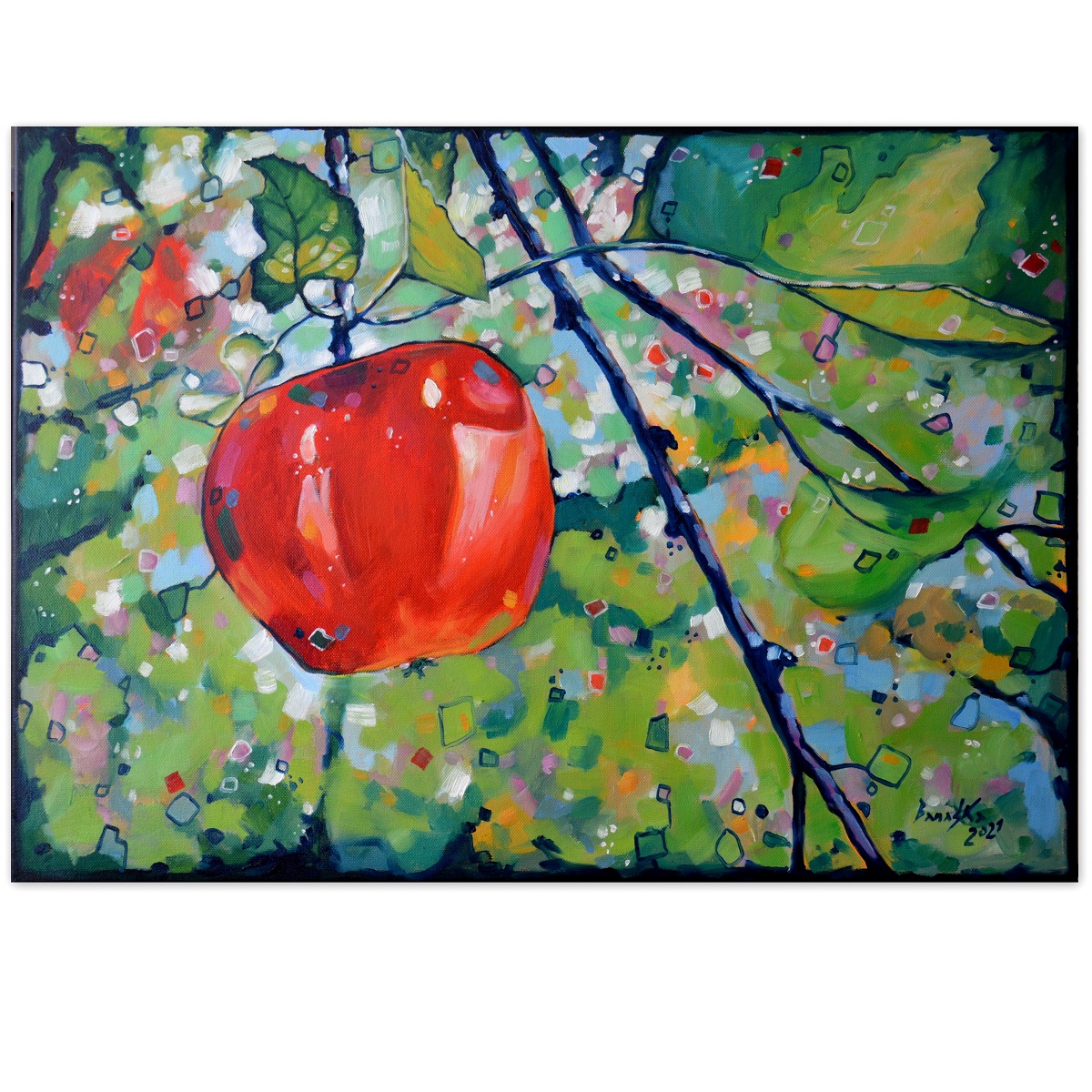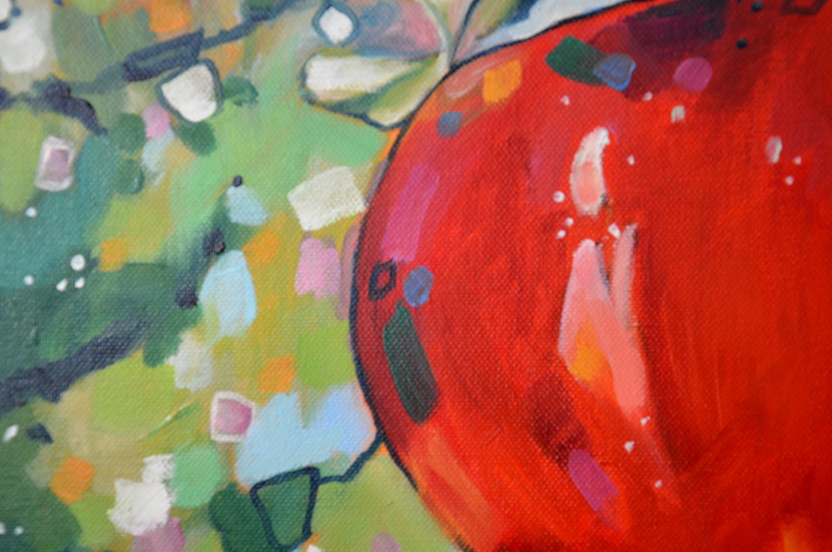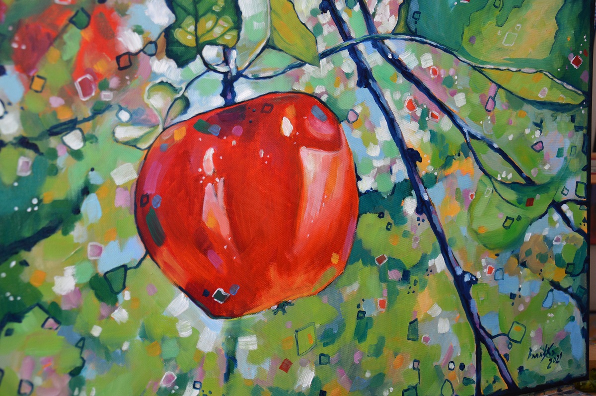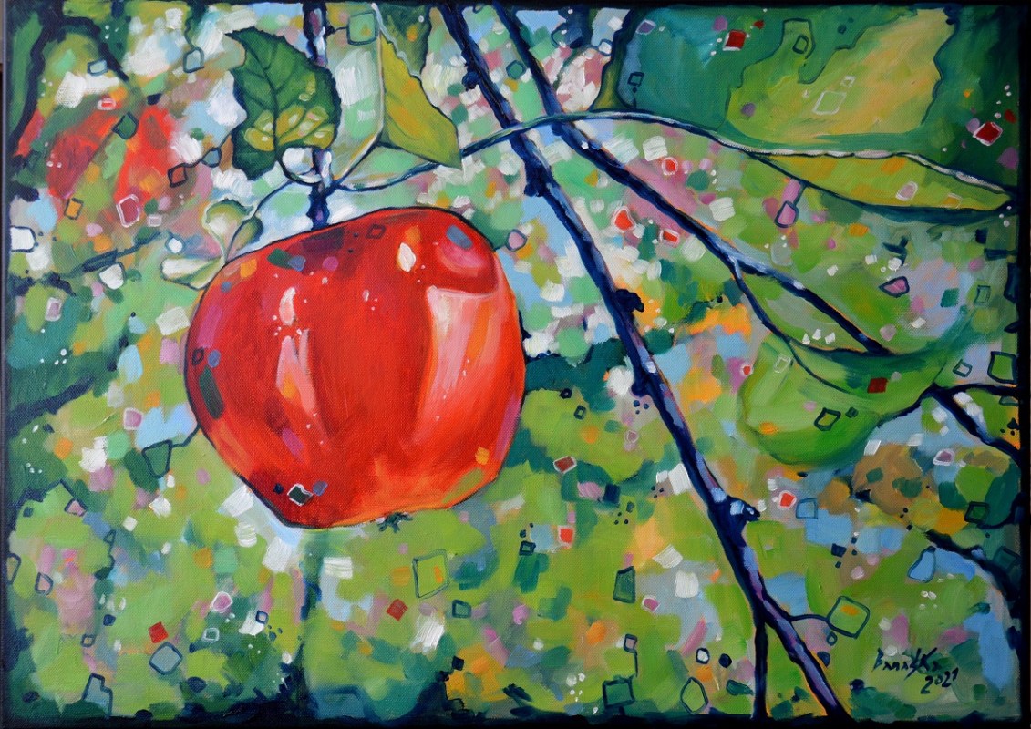 Kontrastowe barwy, przebijające się przez liście słońce i barwne plamy mieszają się tworząc roziskrzoną mozaikę. Żywa kolorystyka buduje strukturę światła i liści, kontarastując z intensywną czerwienią owocu, jego kształtem i masywnością .