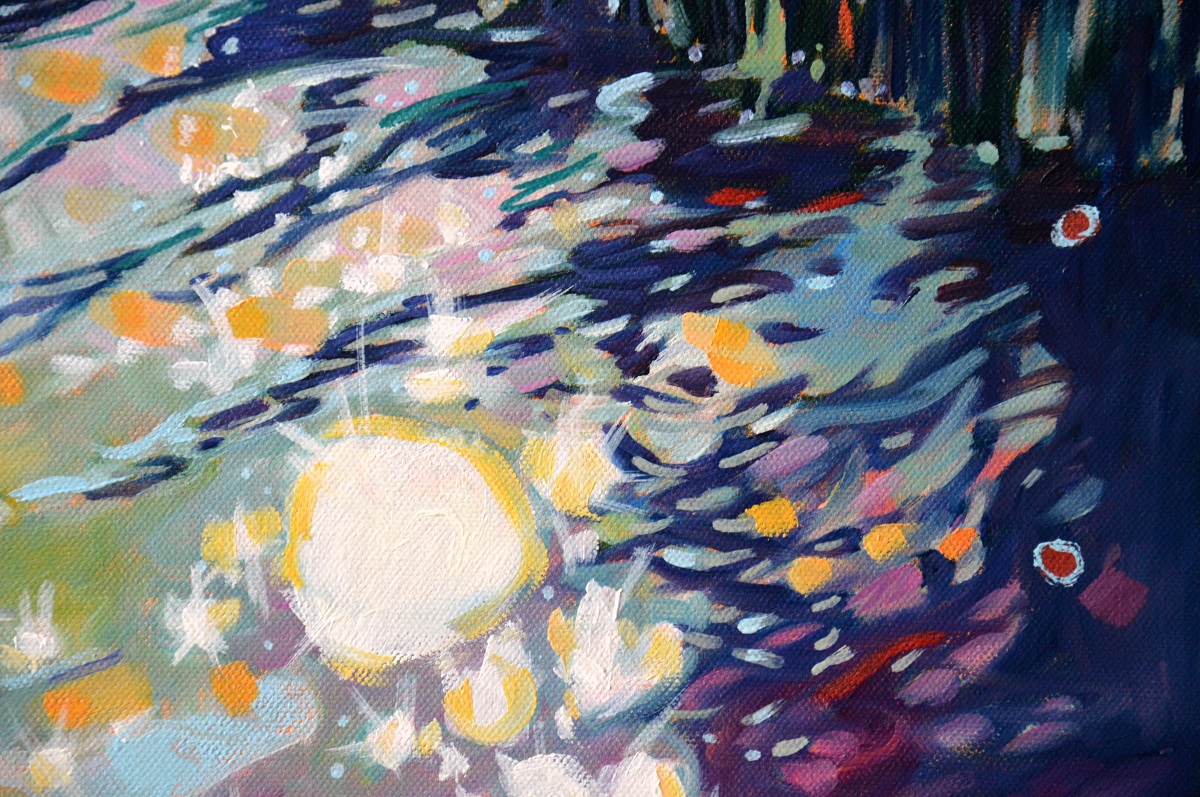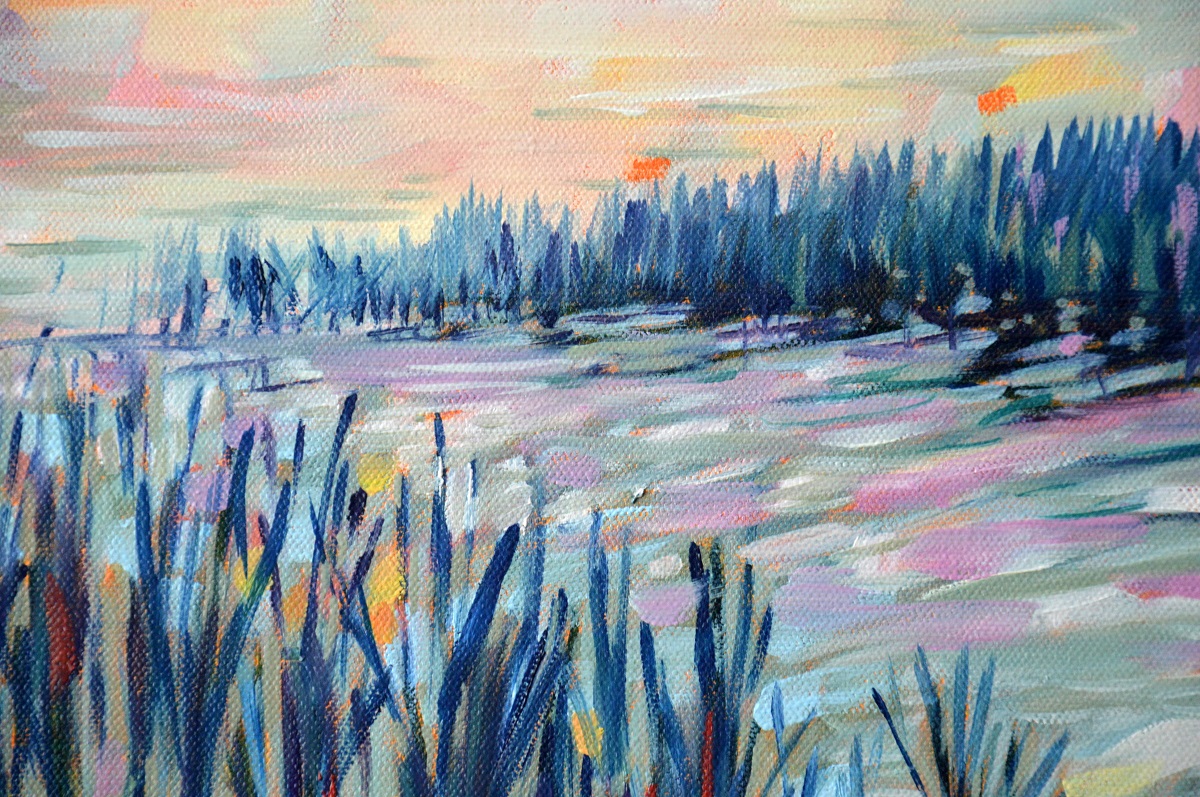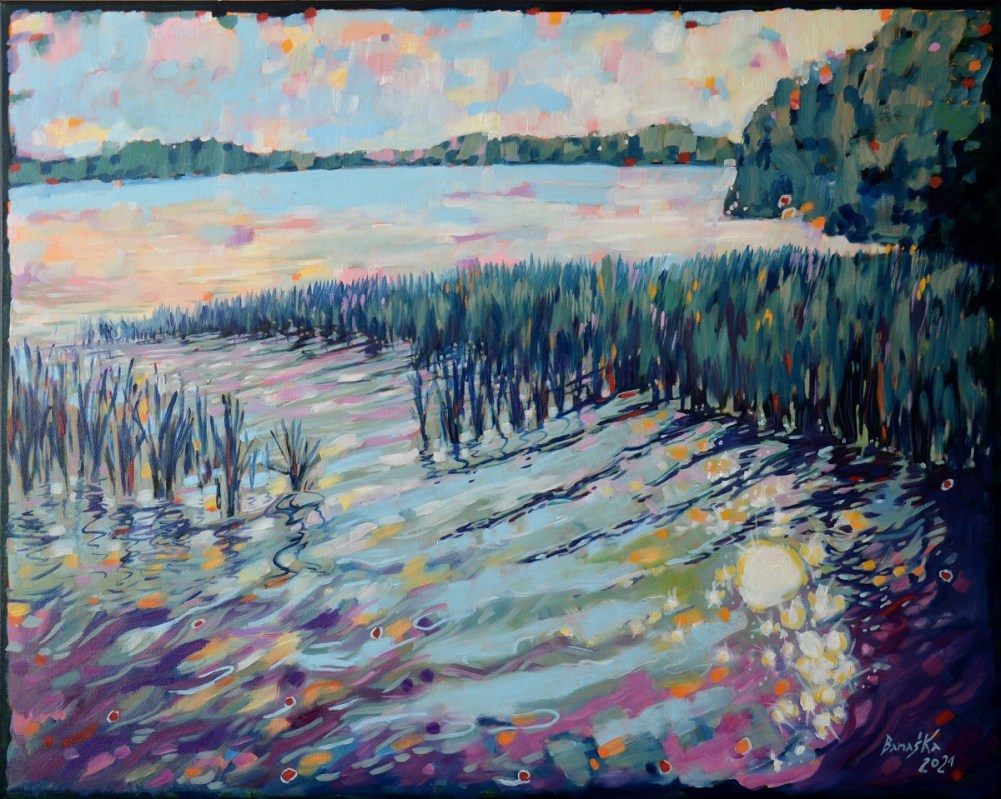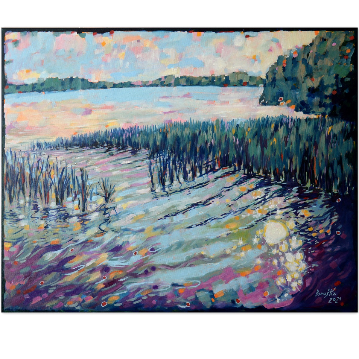 Światło odbija się w wodach jeziora, mruga i lśni. Podświetla trzciny przy brzegu. Barwne plamy na wodzie mieszają się tworząc roziskrzoną mozaikę. Żywa kolorystyka, drobne plamy barw budują strukturę światła, wody i zarośli. W tle rozmyty i lekko zamglony drugi brzeg.