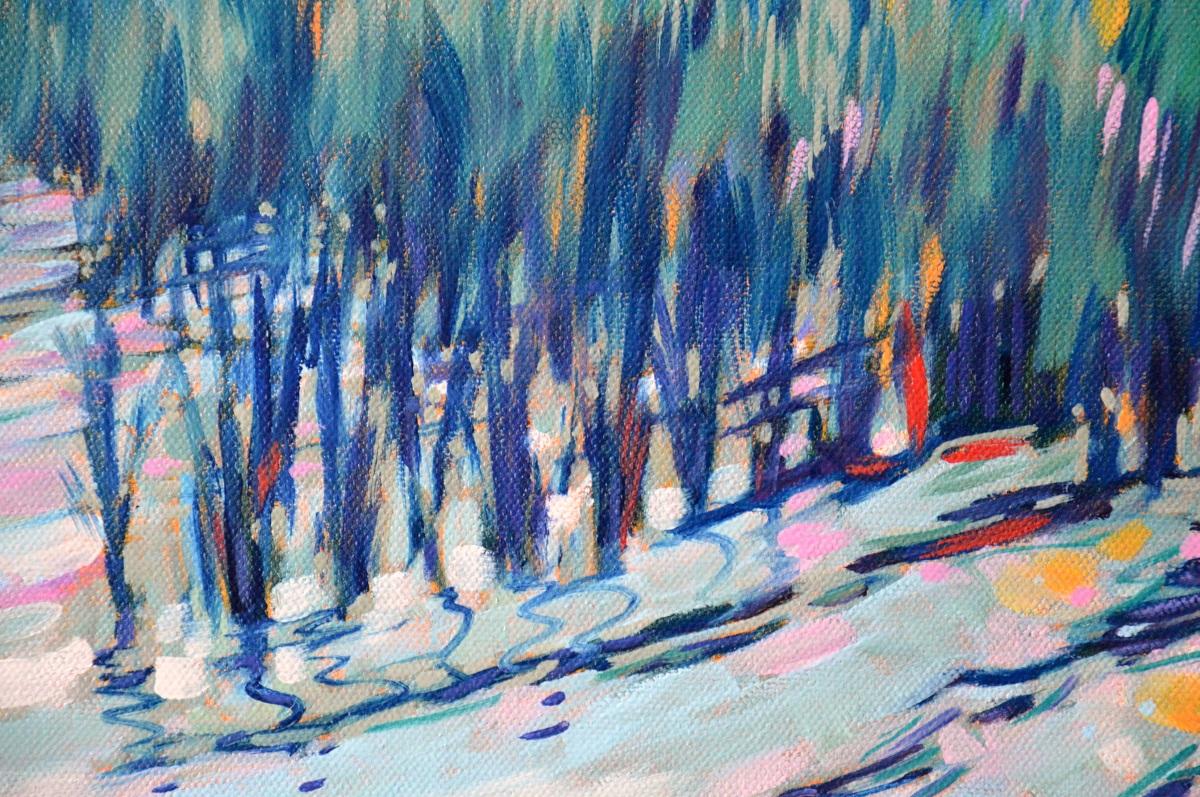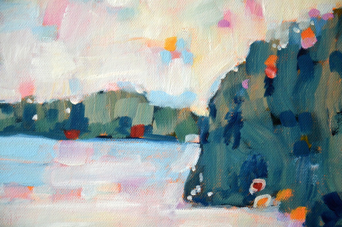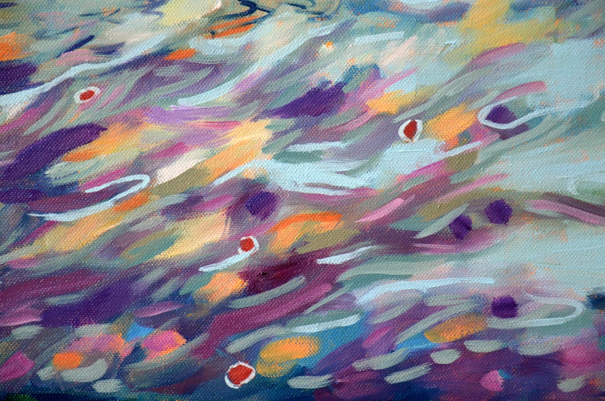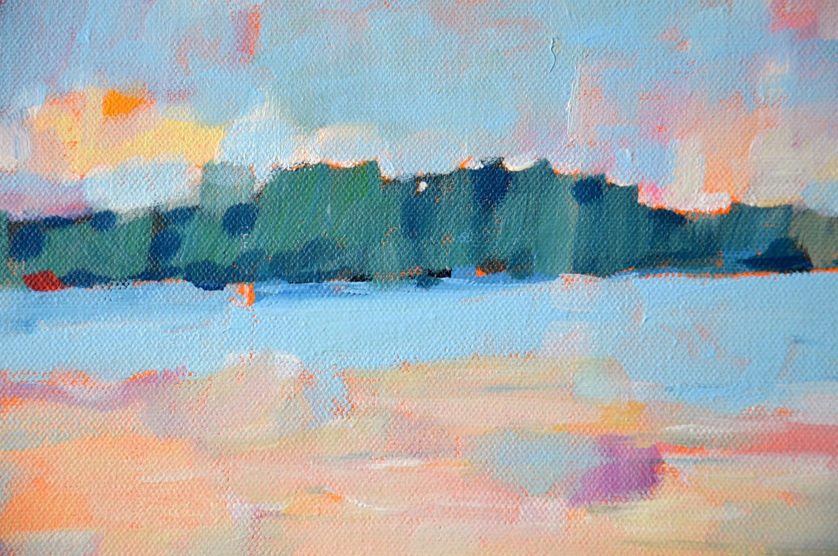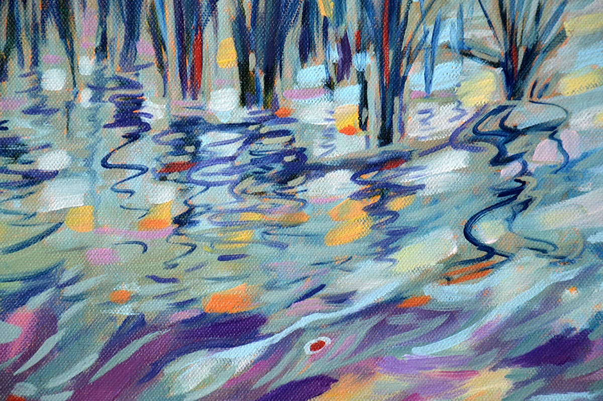 Światło odbija się w wodach jeziora, mruga i lśni. Podświetla trzciny przy brzegu. Barwne plamy na wodzie mieszają się tworząc roziskrzoną mozaikę. Żywa kolorystyka, drobne plamy barw budują strukturę światła, wody i zarośli. W tle rozmyty i lekko zamglony drugi brzeg.