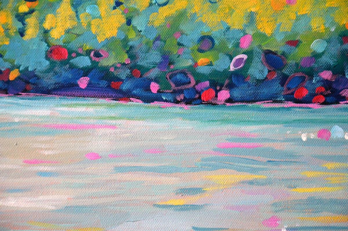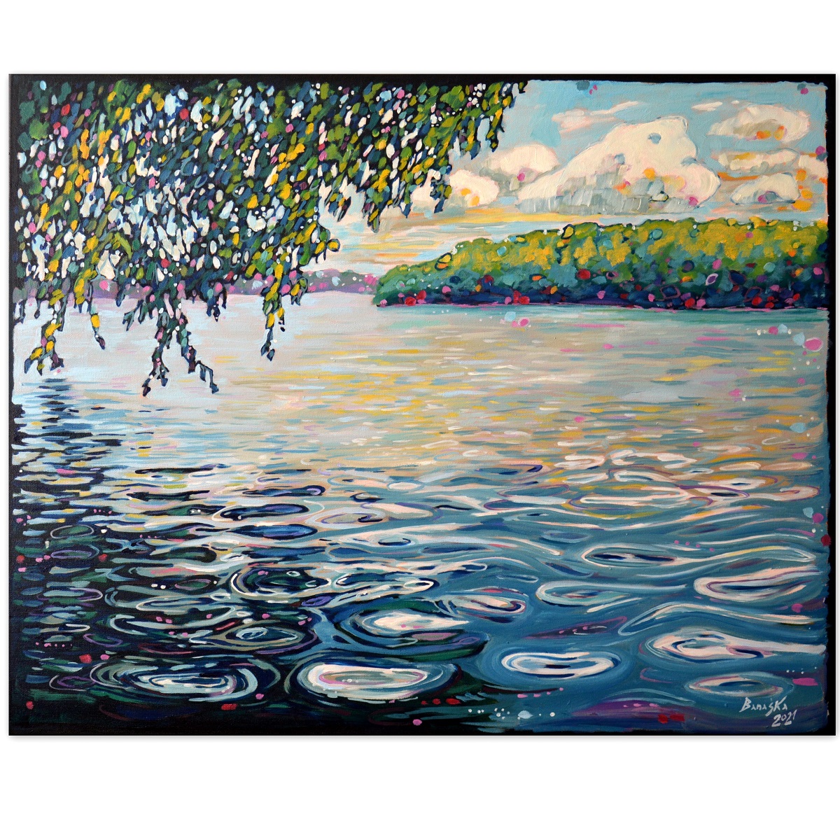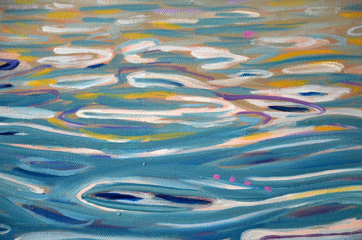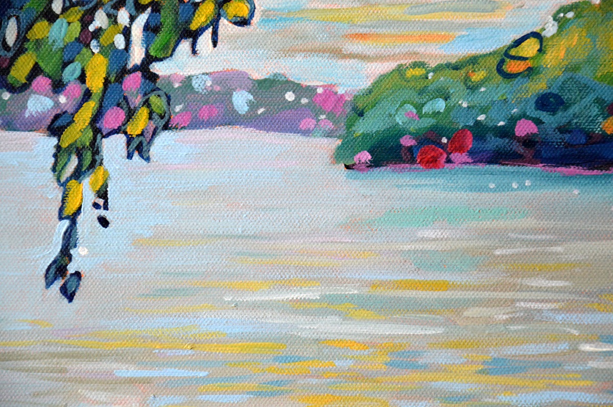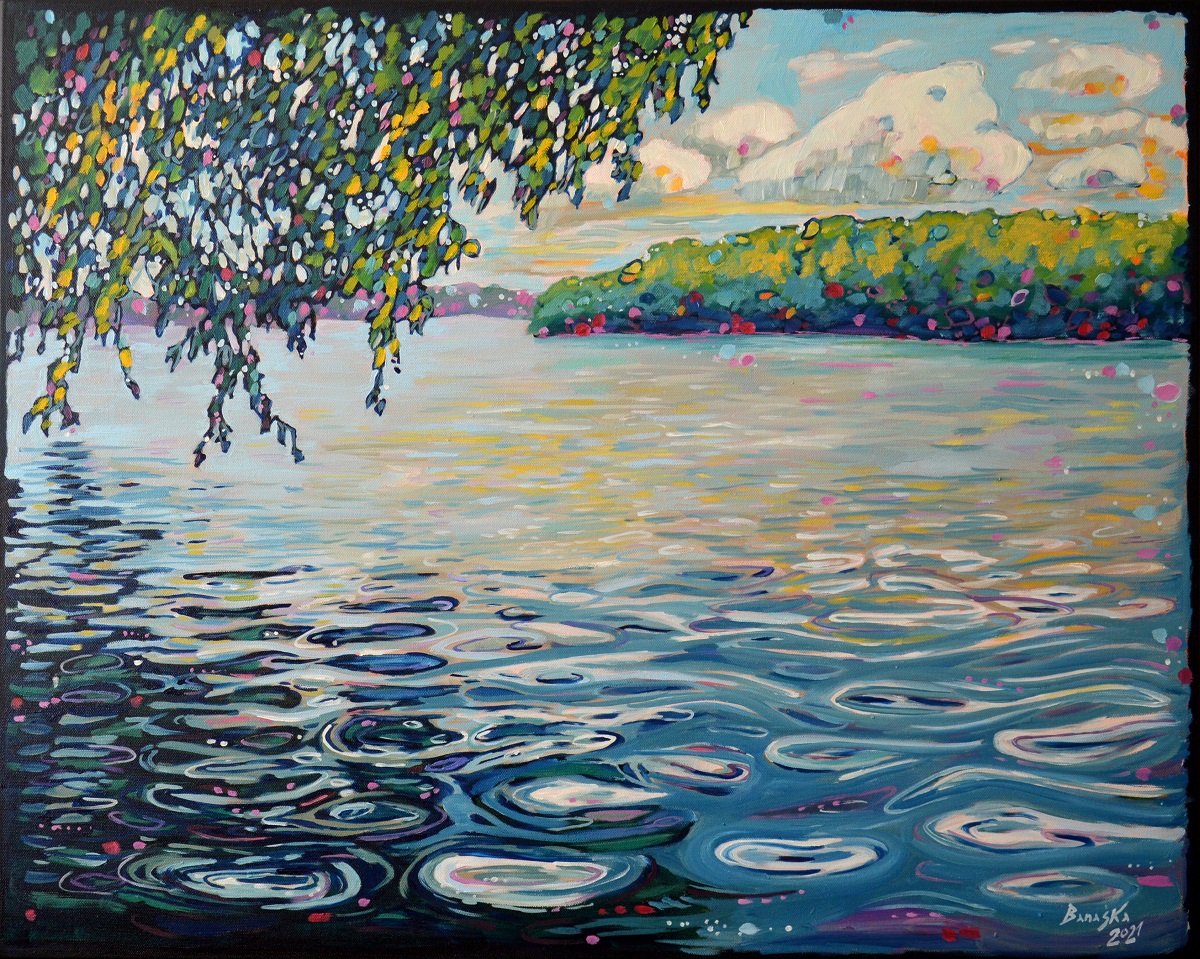 Światło odbija się w wodach jeziora, mruga i lśni. Podświetla trzciny przy brzegu. Barwne plamy na wodzie mieszają się tworząc roziskrzoną mozaikę. Żywa kolorystyka, drobne plamy barw budują strukturę światła, wody i zarośli. W tle rozmyty i lekko zamglony drugi brzeg.