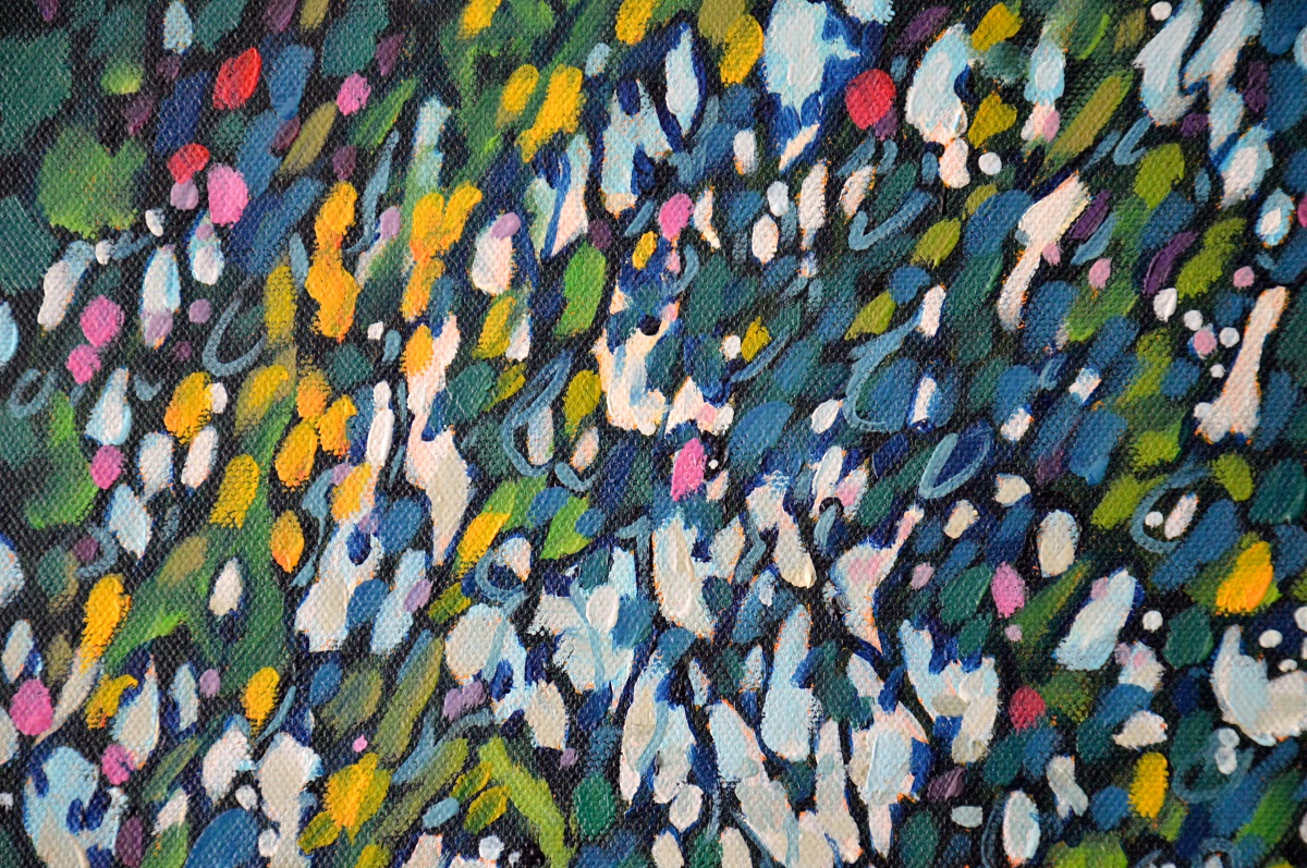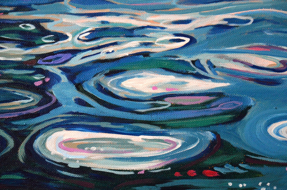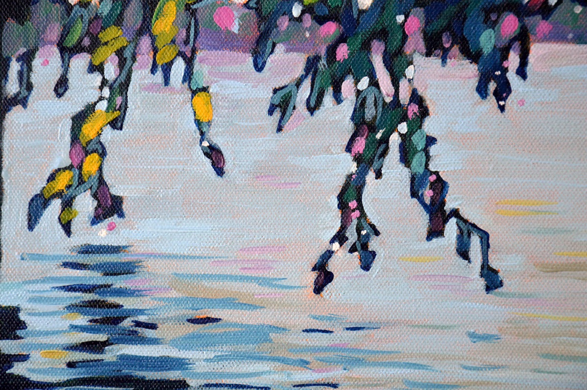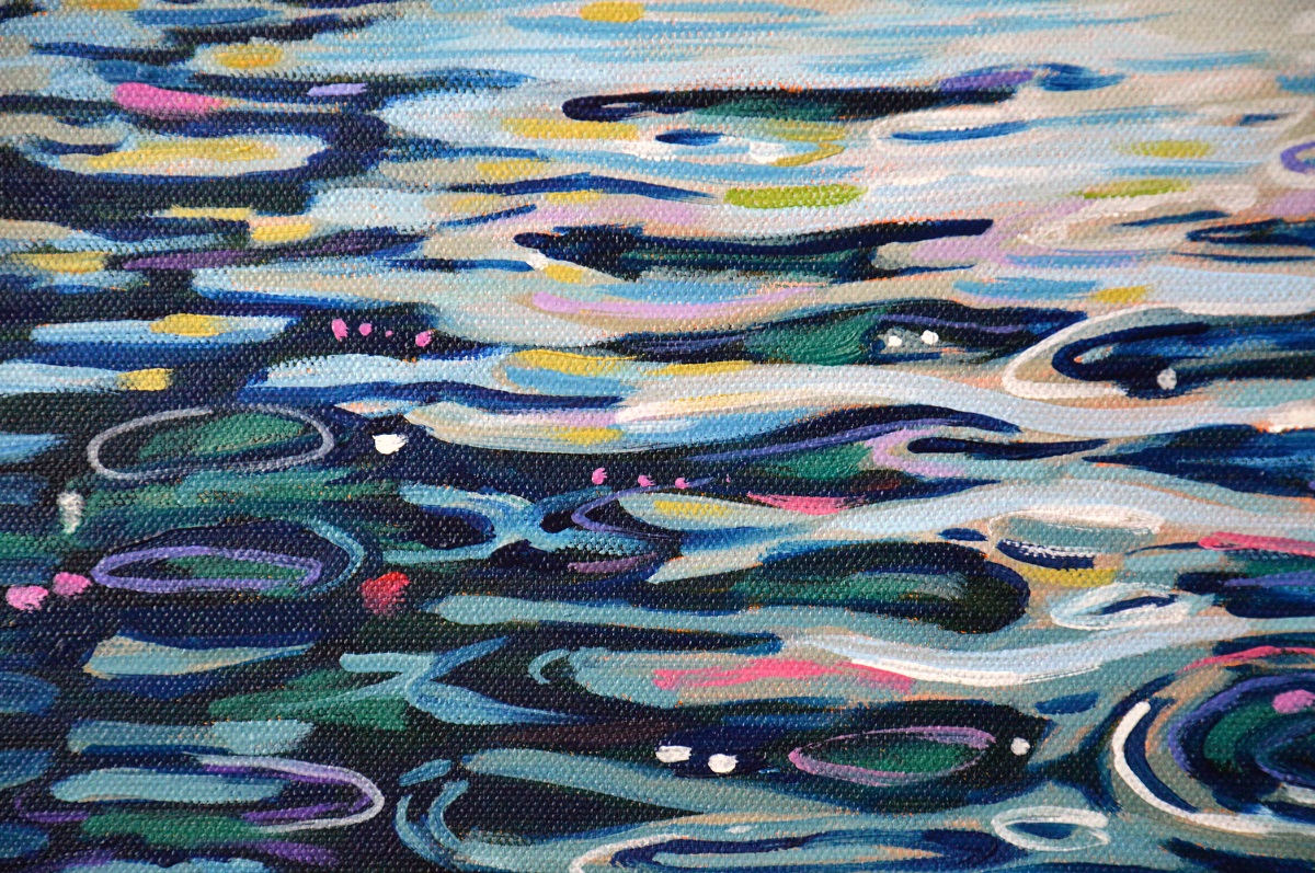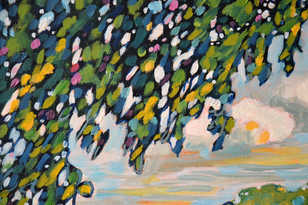 Światło odbija się w wodach jeziora, mruga i lśni. Podświetla trzciny przy brzegu. Barwne plamy na wodzie mieszają się tworząc roziskrzoną mozaikę. Żywa kolorystyka, drobne plamy barw budują strukturę światła, wody i zarośli. W tle rozmyty i lekko zamglony drugi brzeg.