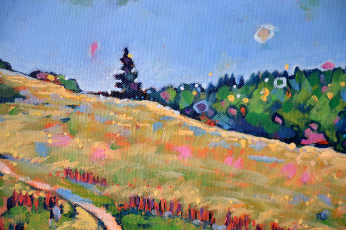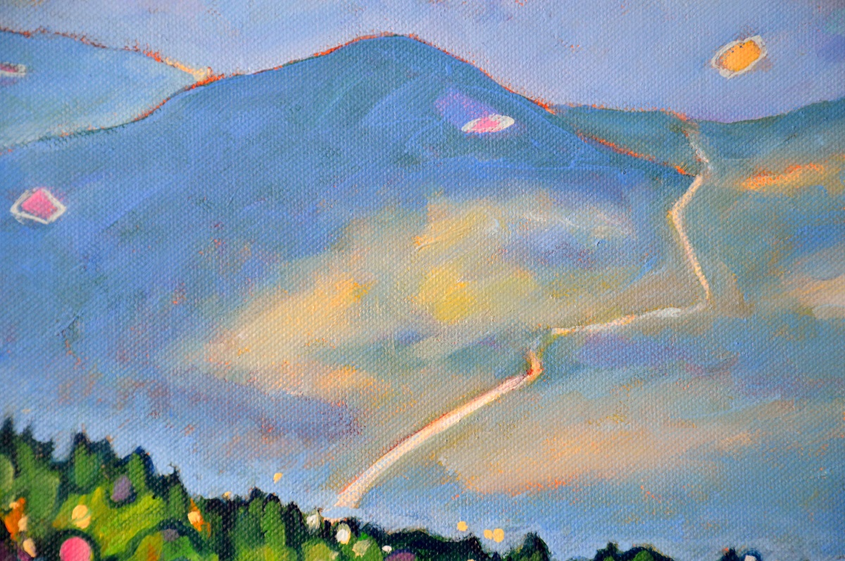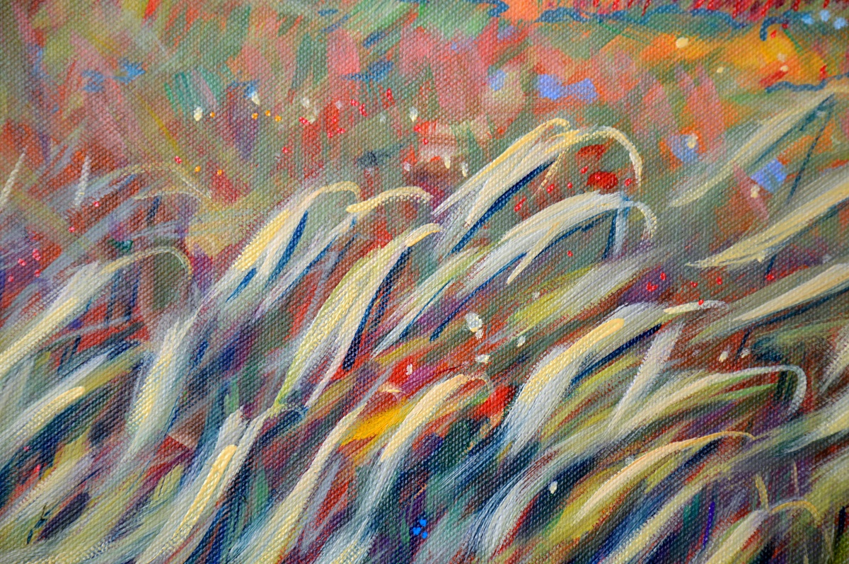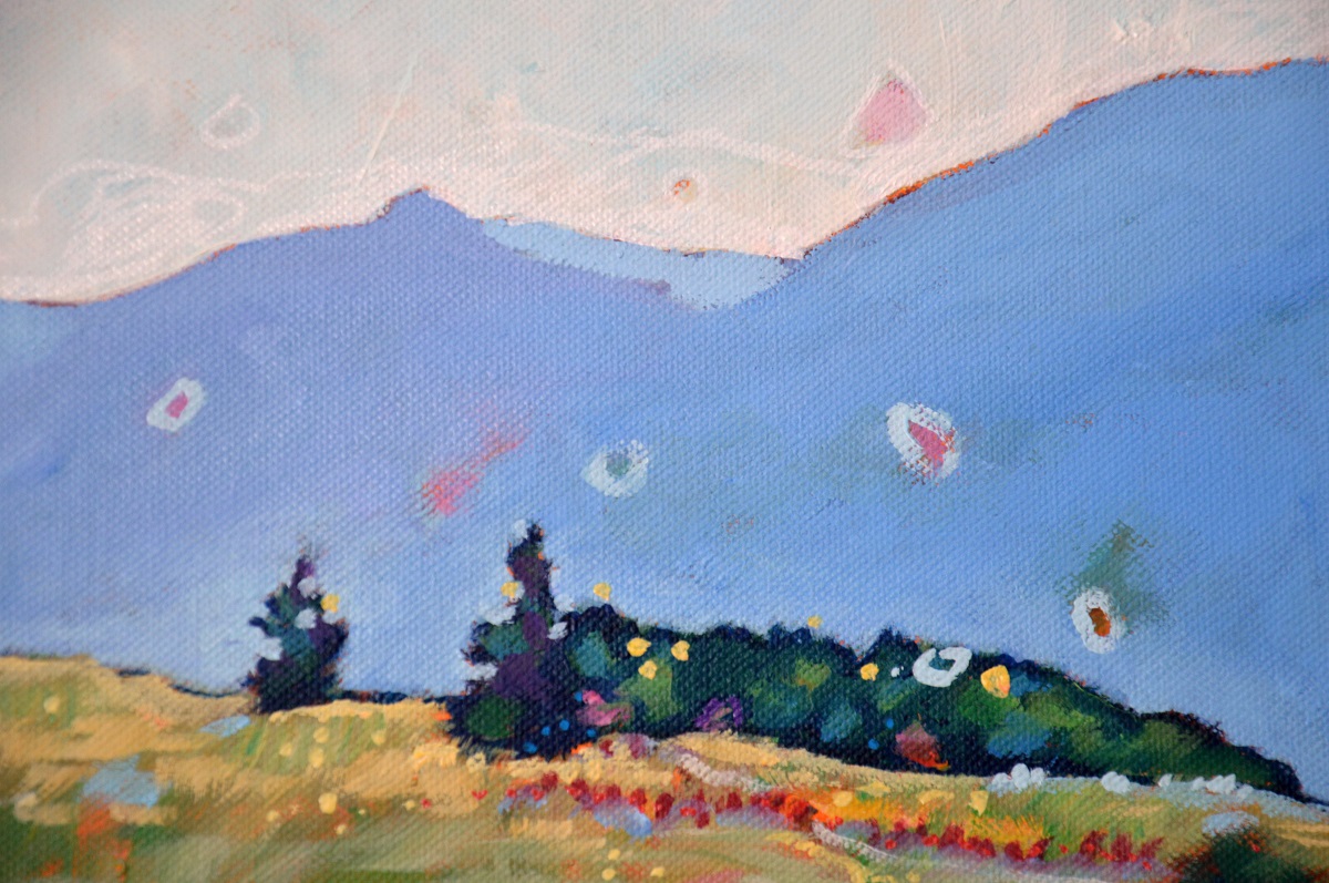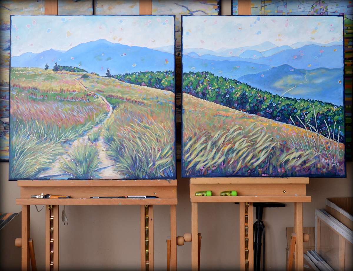Światło na połoninach wydobywa złociste źdźbła spośród zieleni i rdzy. Wiatr je czesze i targa. Gęsty las przynosi ciemną i chłodną obietnicę cienia. W tle błękit pochłania odległe szczyty, roztapia je w niebieskich mgłach.
