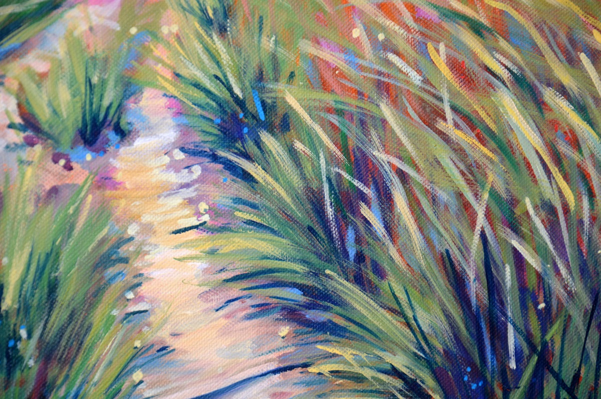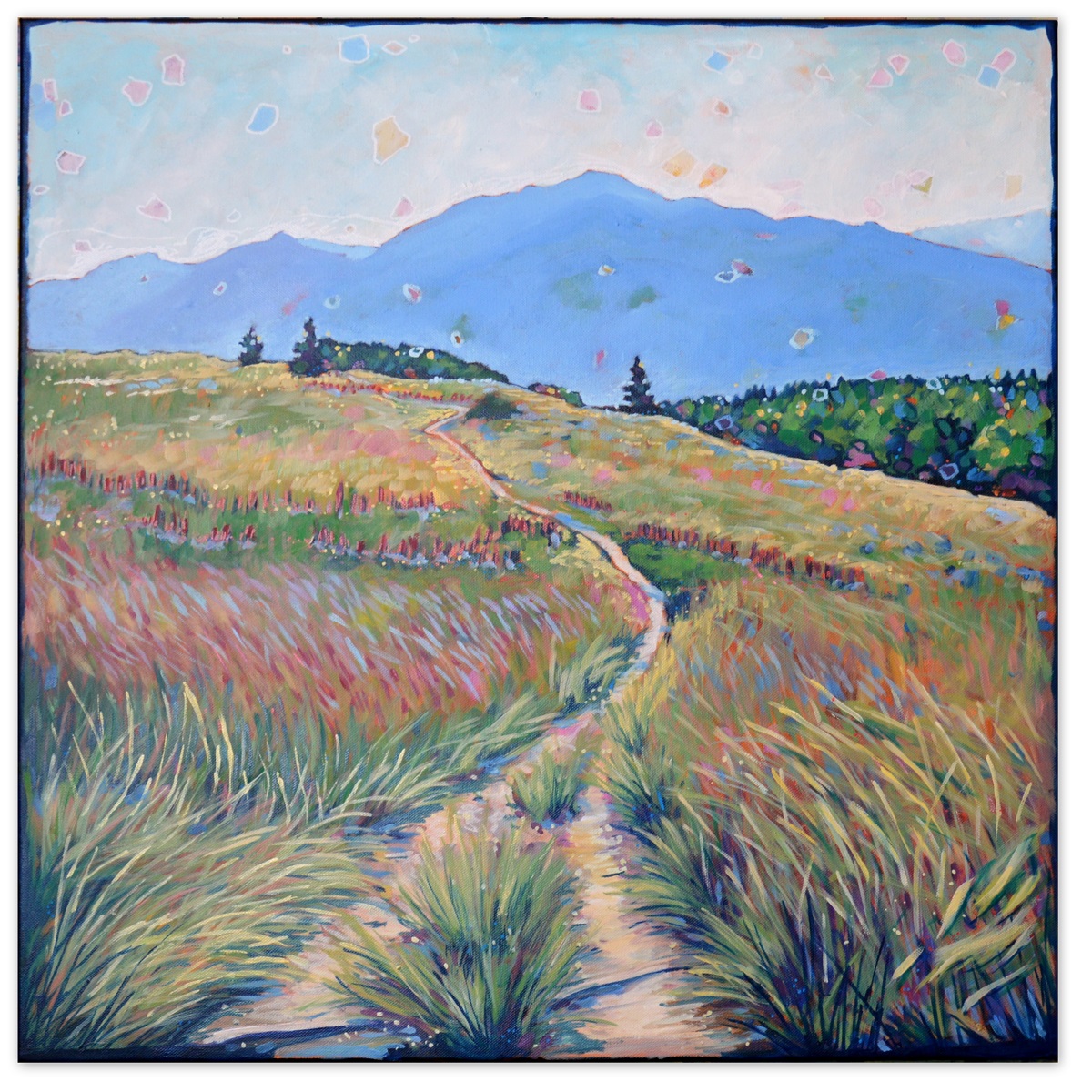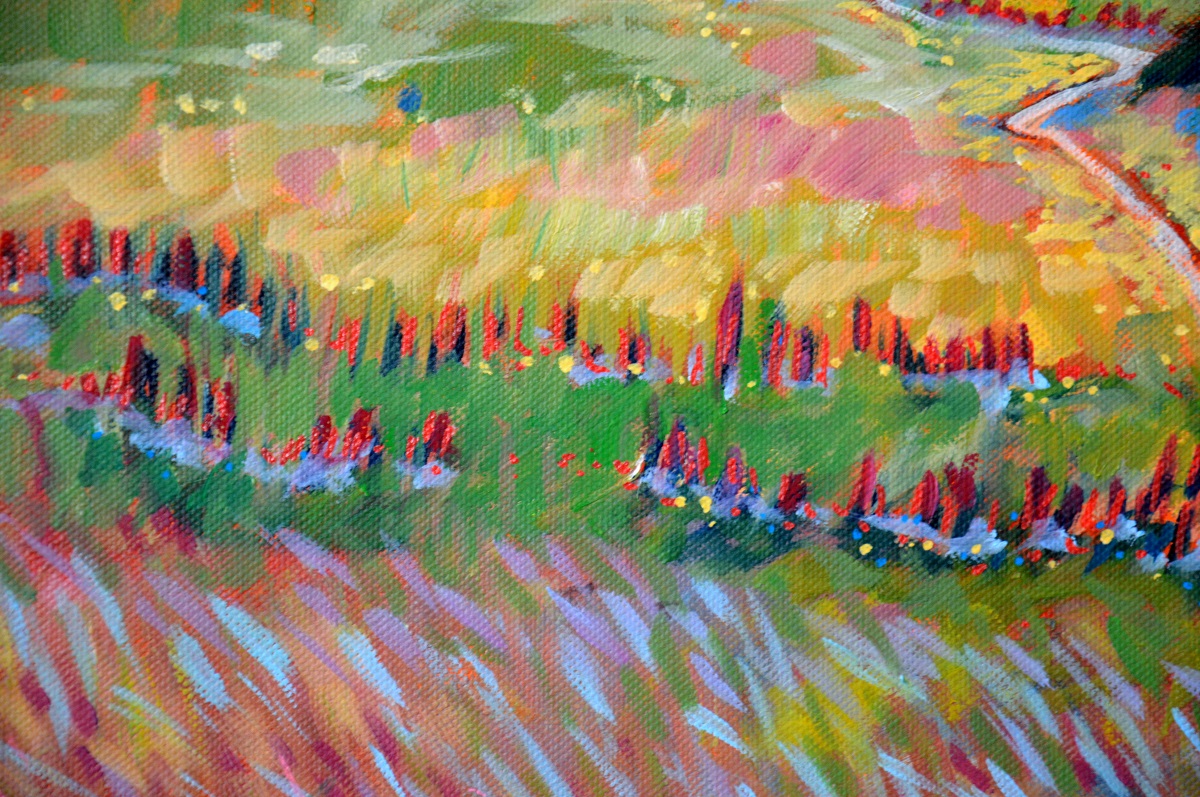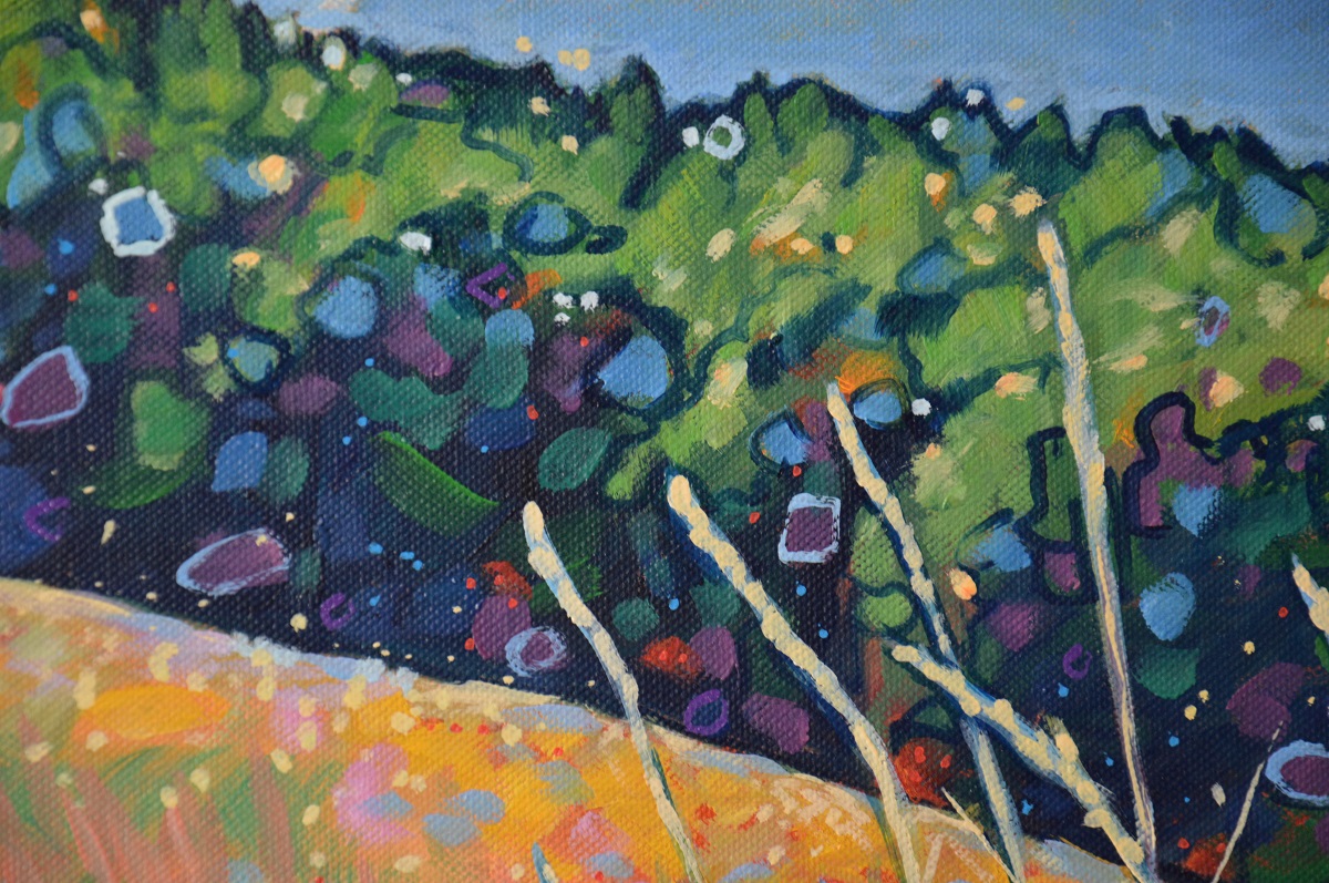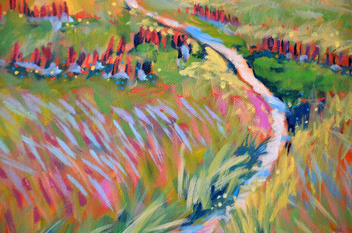 Światło na połoninach wydobywa złociste źdźbła spośród zieleni i rdzy. Wiatr je czesze i targa. Gęsty las przynosi ciemną i chłodną obietnicę cienia. W tle błękit pochłania odległe szczyty, roztapia je w niebieskich mgłach.