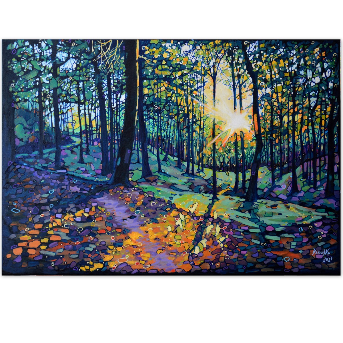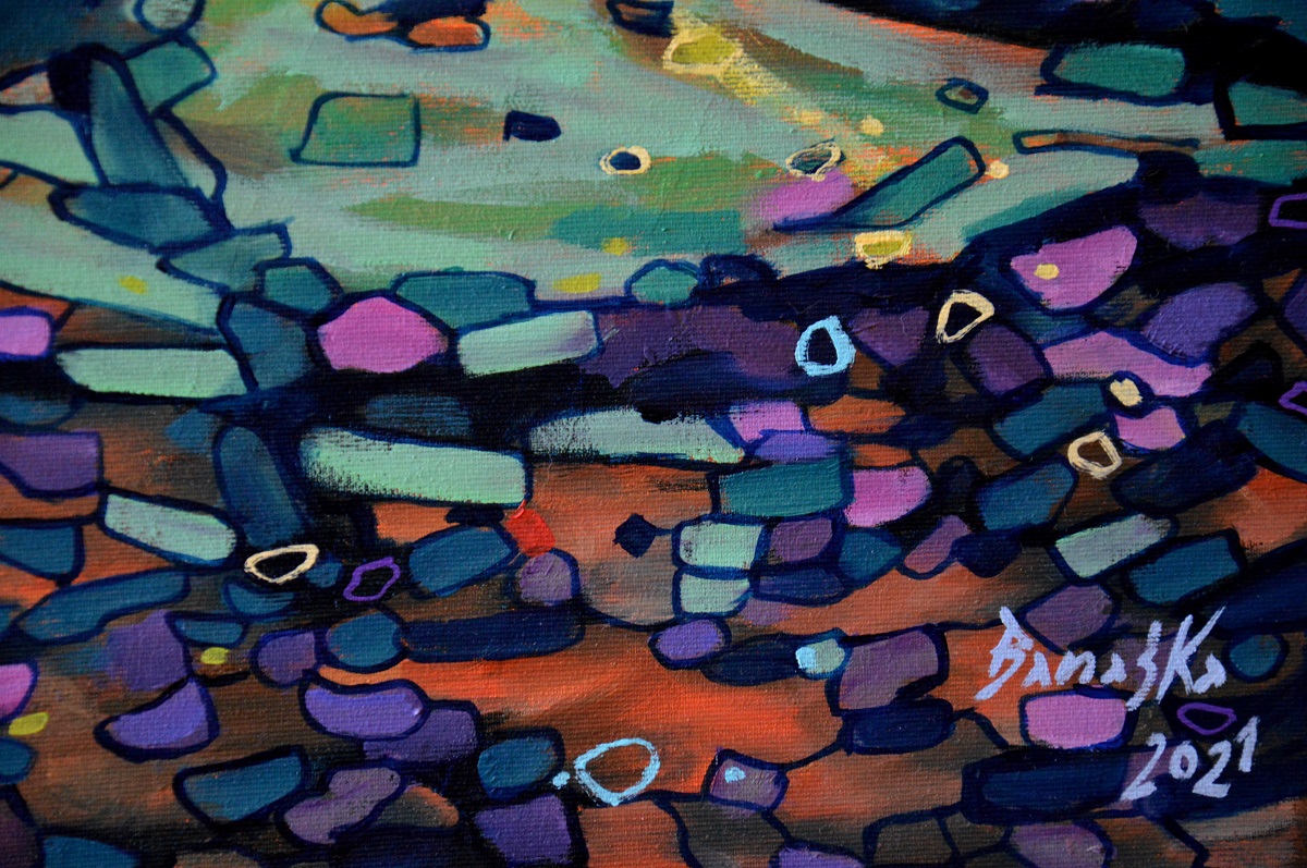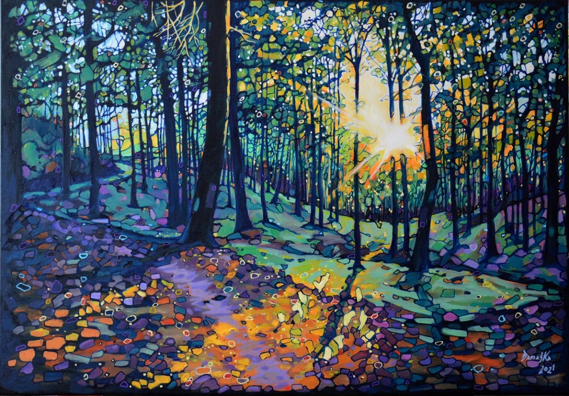 Oryginał. Rok powstania: 2021. Technika: olej. Podobrazie: płótno bawełniane naciągnięte na drewnianą ramę. Rozmiar obrazu: wysokość 70cm, szerokość 100cm. Boki obrazów zamalowane na ciemny czarno. Kolory obrazu mogą nieznacznie różnić się od oryginału w zależności od kalibracji monitorów.
