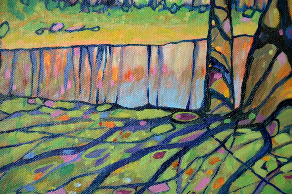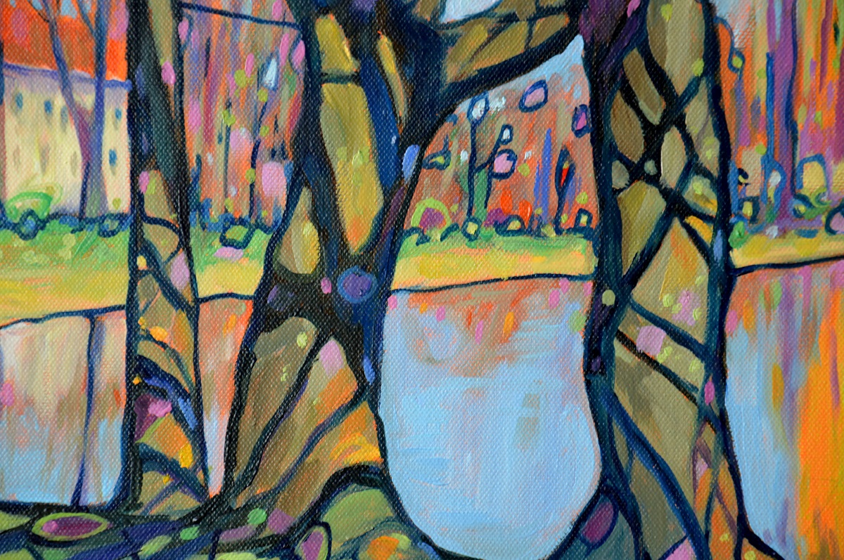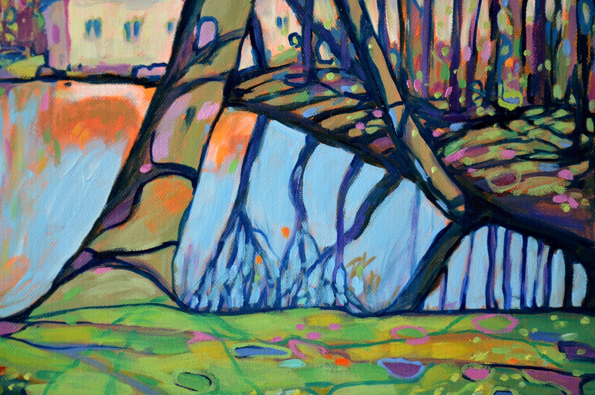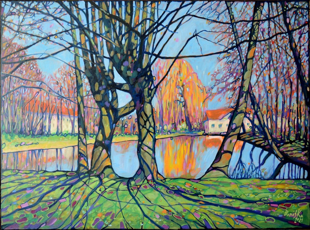 Przedwiośnie w jednym z gdańskich parków. Bezlistne jeszcze drzwa rzucają skomplikowane rysunki cieni. Ostre słońcesprawia, że wierzba płacząca niemal płonie. A kobalt nieba pochłania też staw.