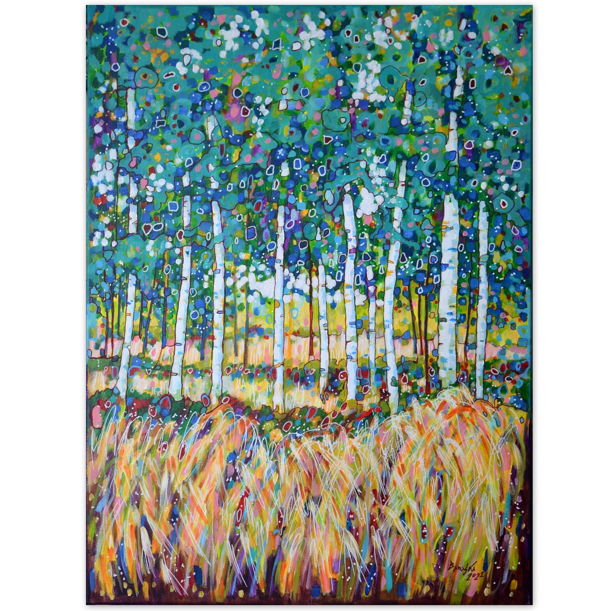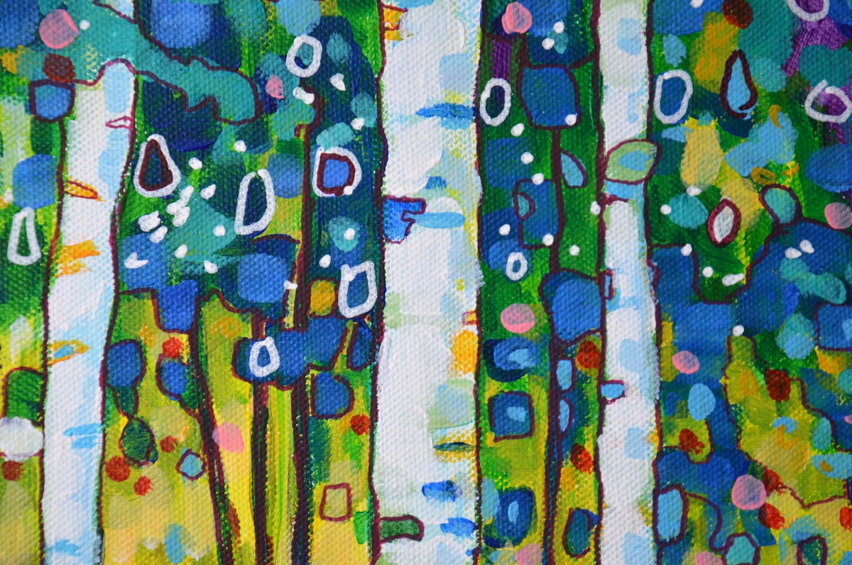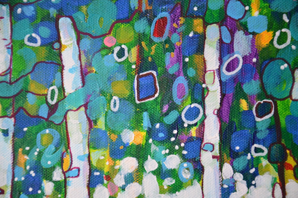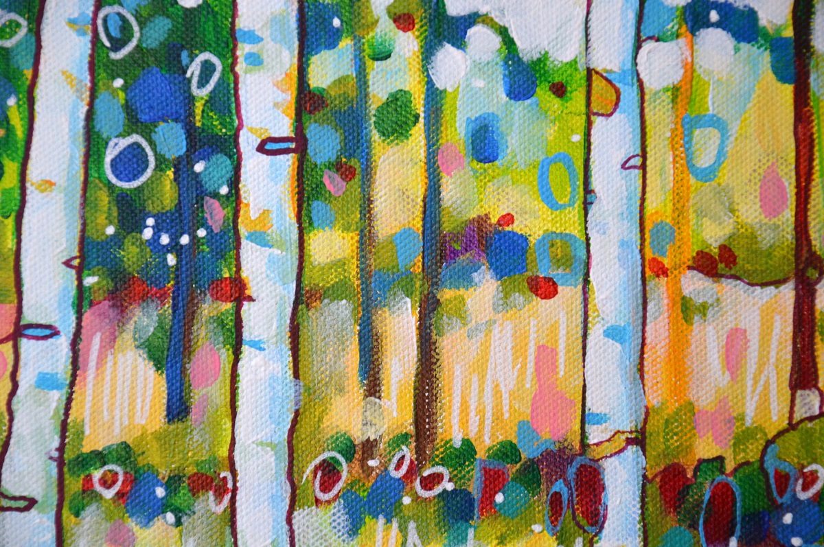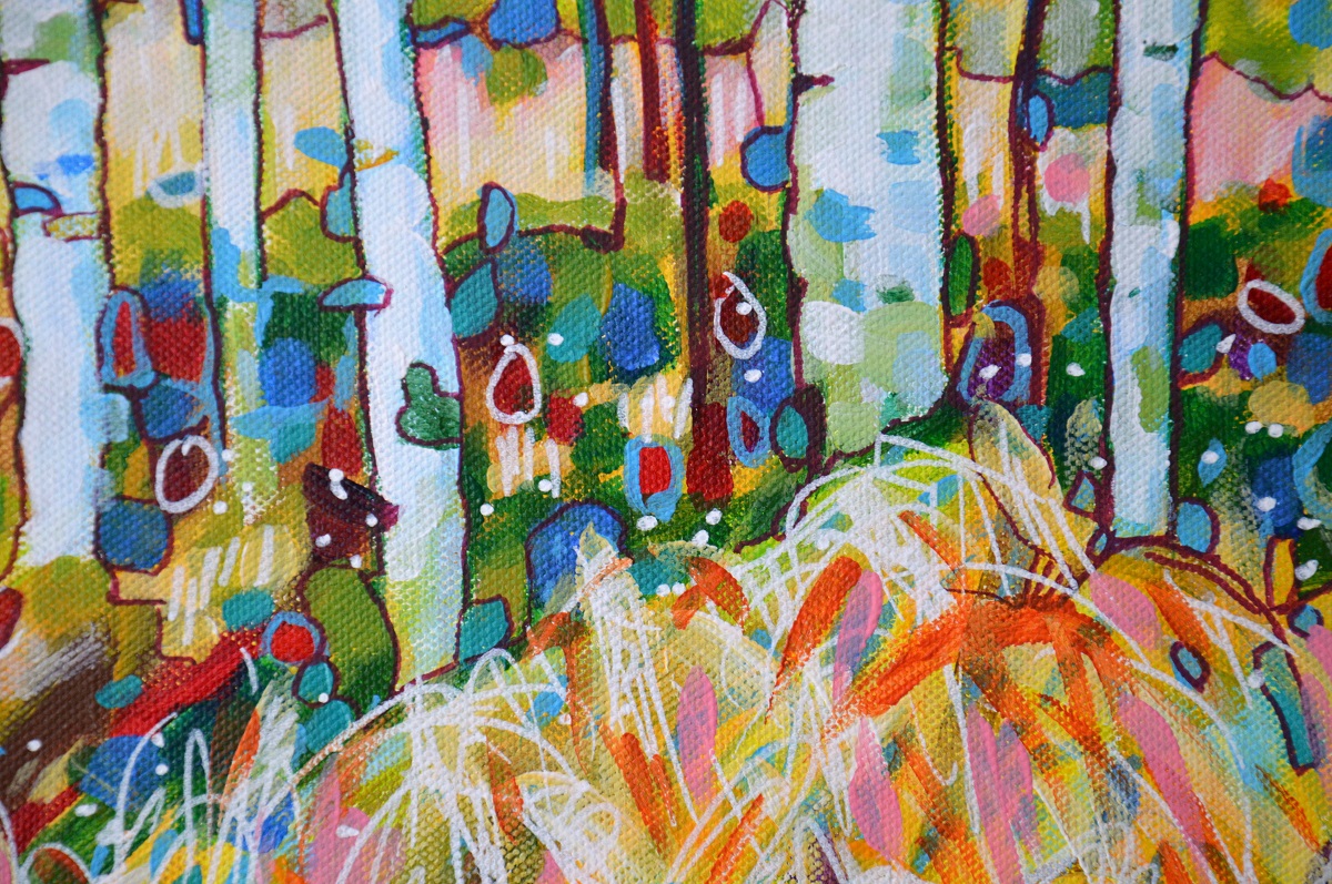 Nowoczesny, pełen kolorów, pejzaż z brzozami. Barwne, intemsywne i nieco abstrakcyjne plamy farby, tworzą dynamiczną kompozycję, gdzie ciepłe światło przenika przez zacieniony zagajnik, podkreśla pnie drzew i łagodnie ogrzewa zboże na pierwszym planie.
