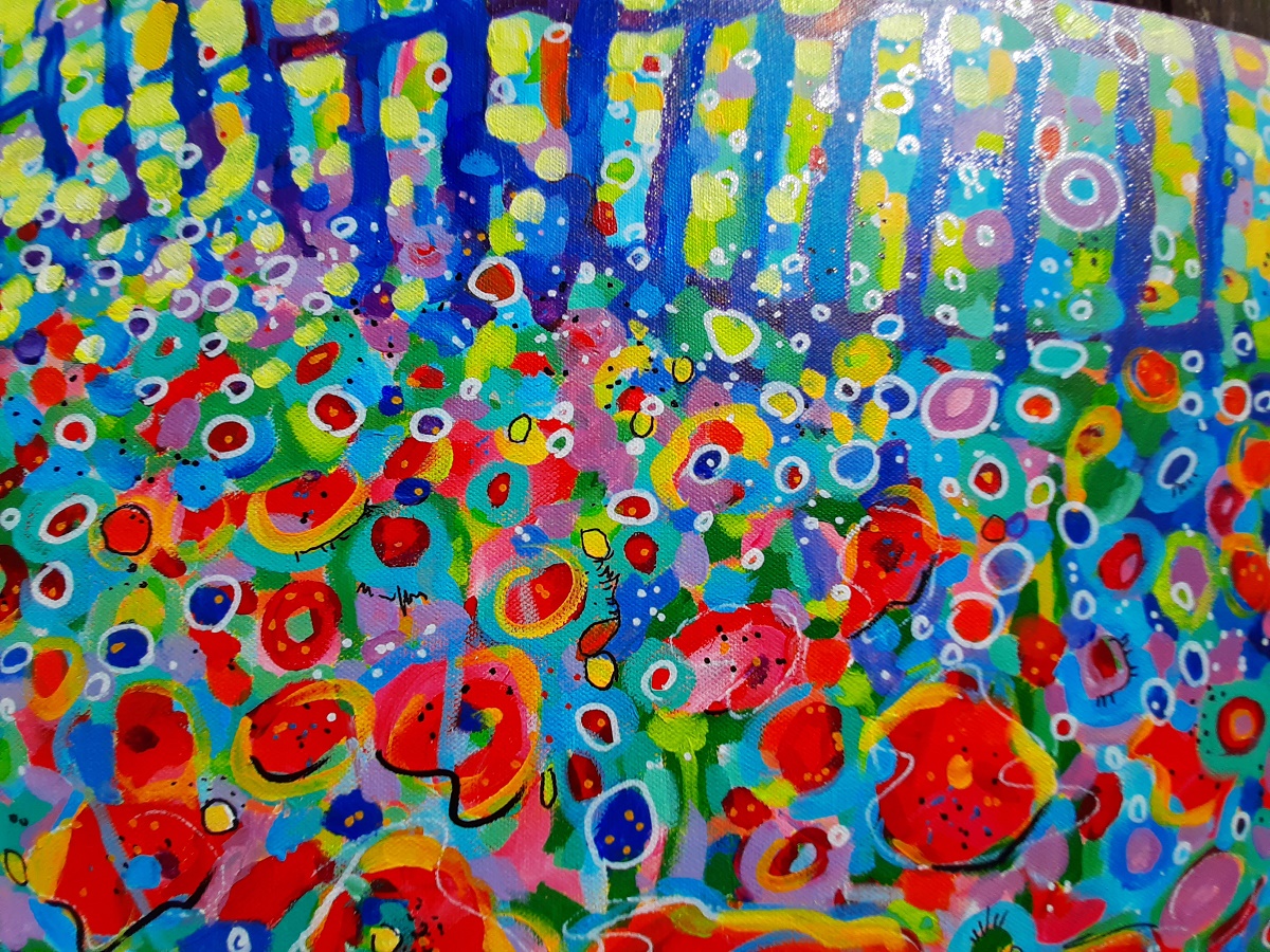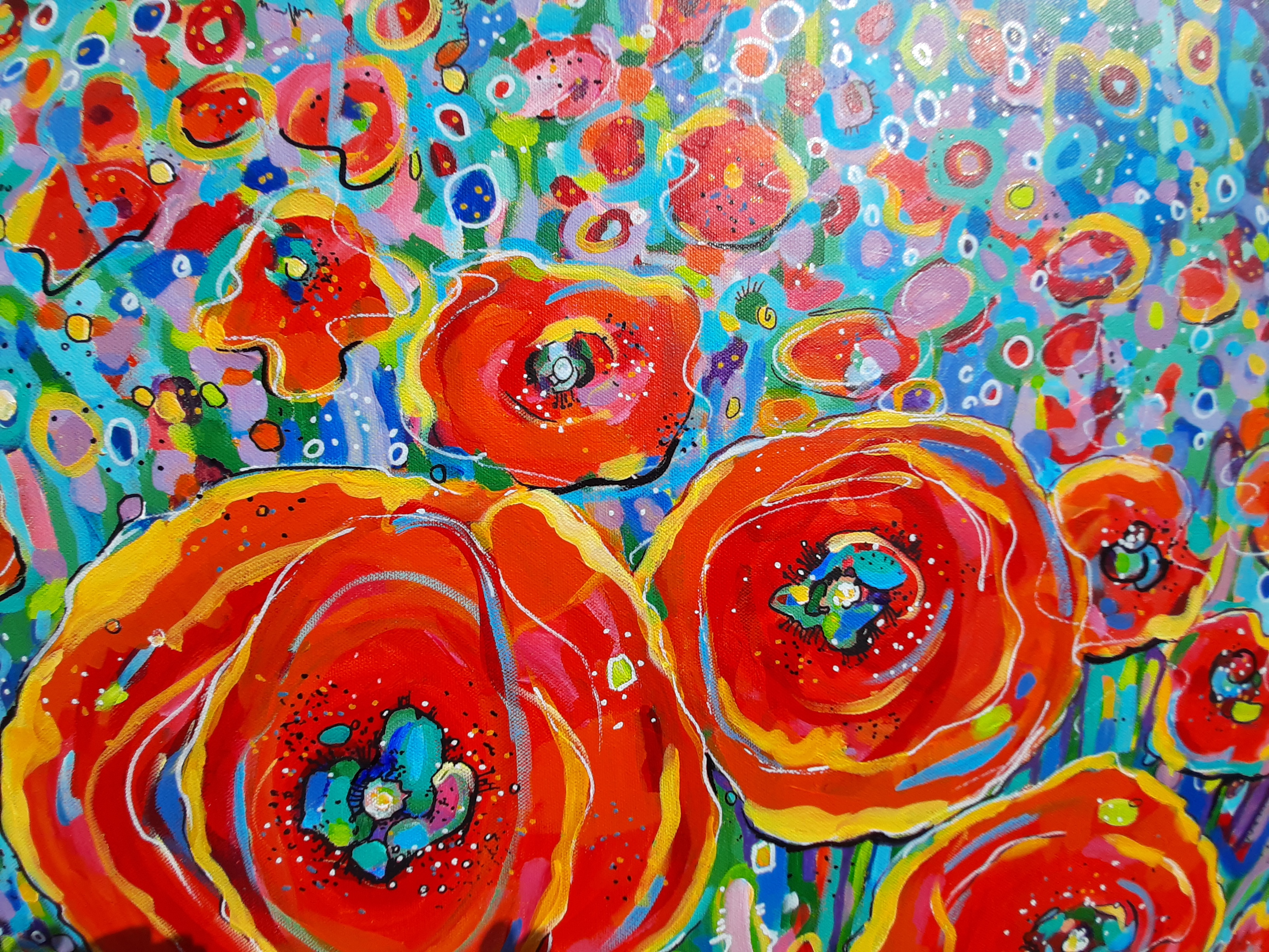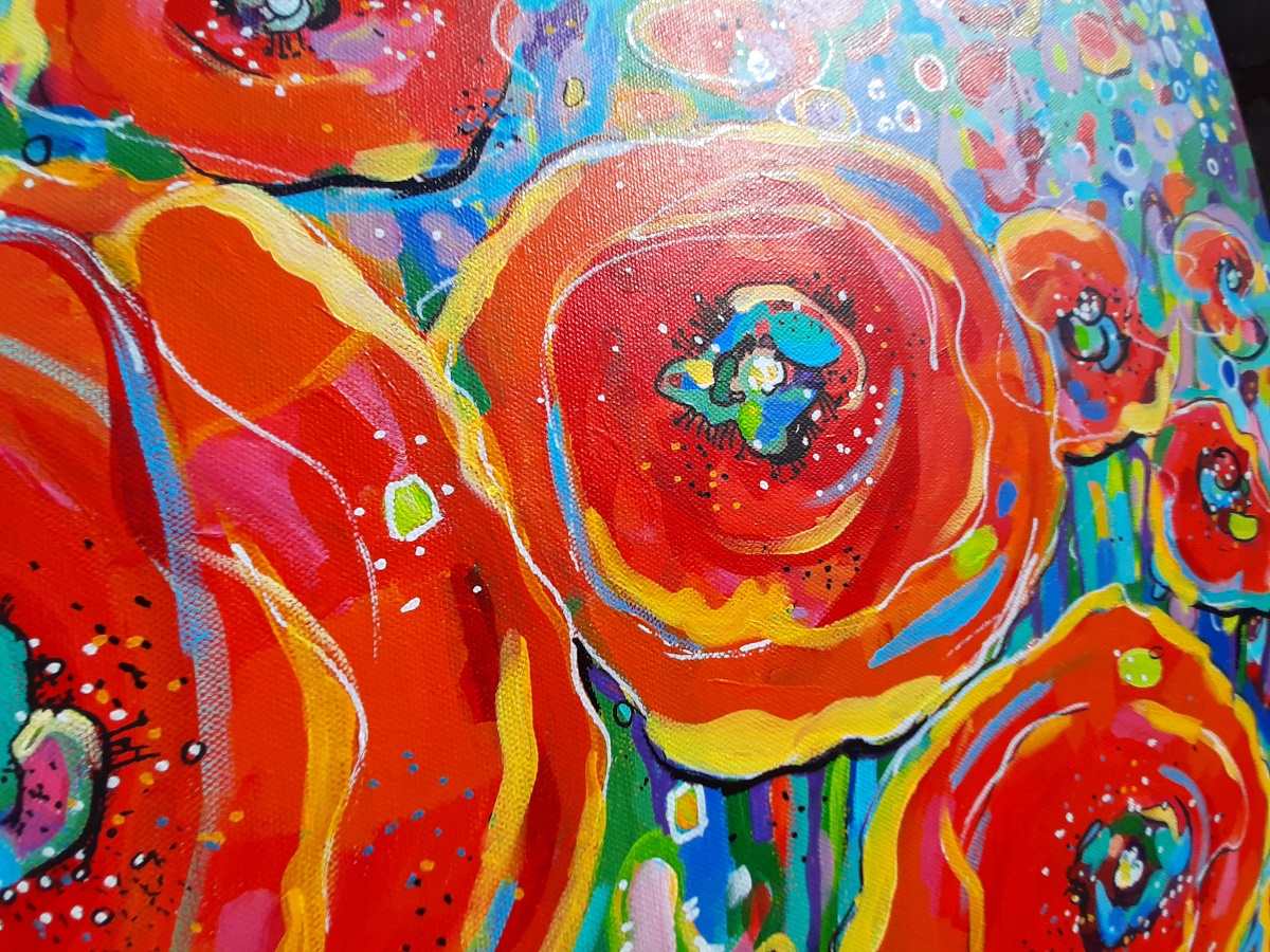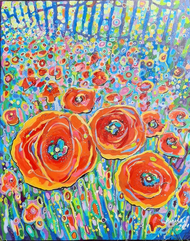 Nowoczesny, niemal abstrakcyjny, pełen kolorów, pejzaż z makami. Niezwykle intensywne barwy, szalone plamy farby, tworzą dynamiczną kompozycję.