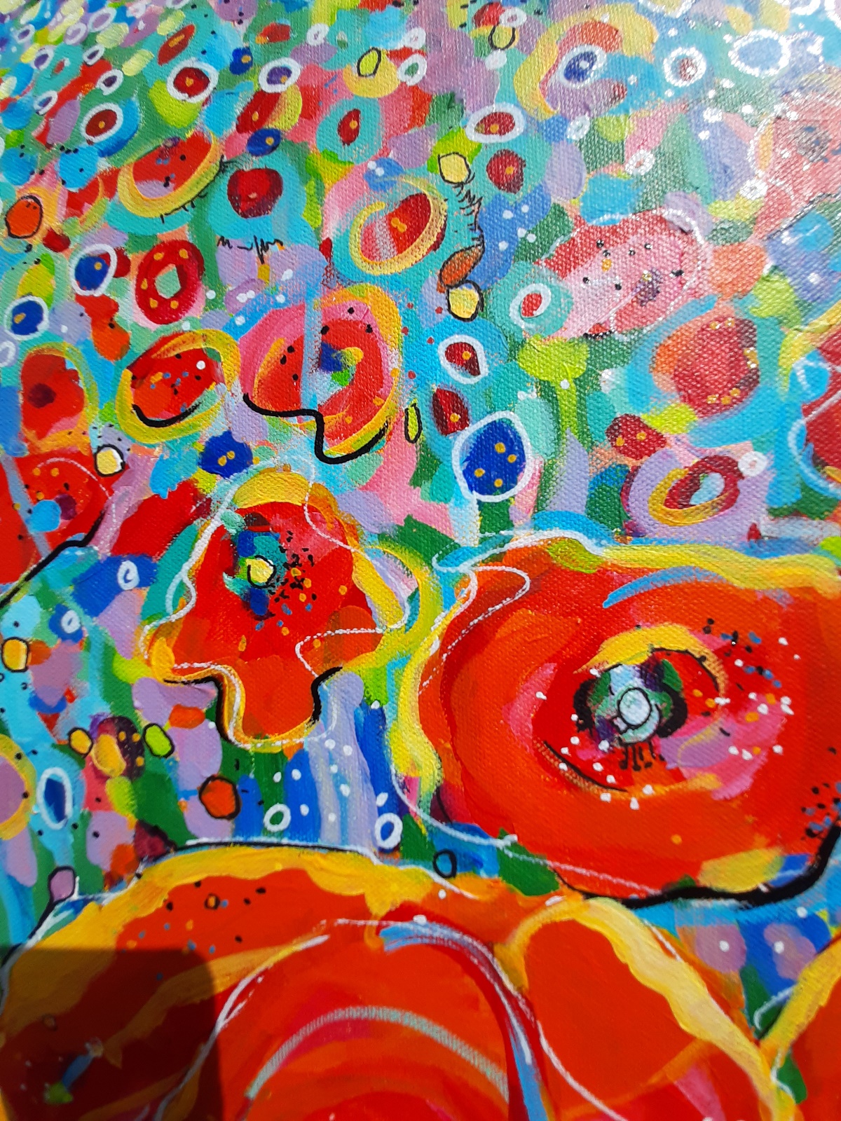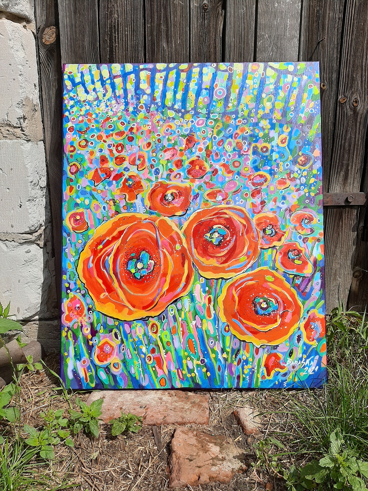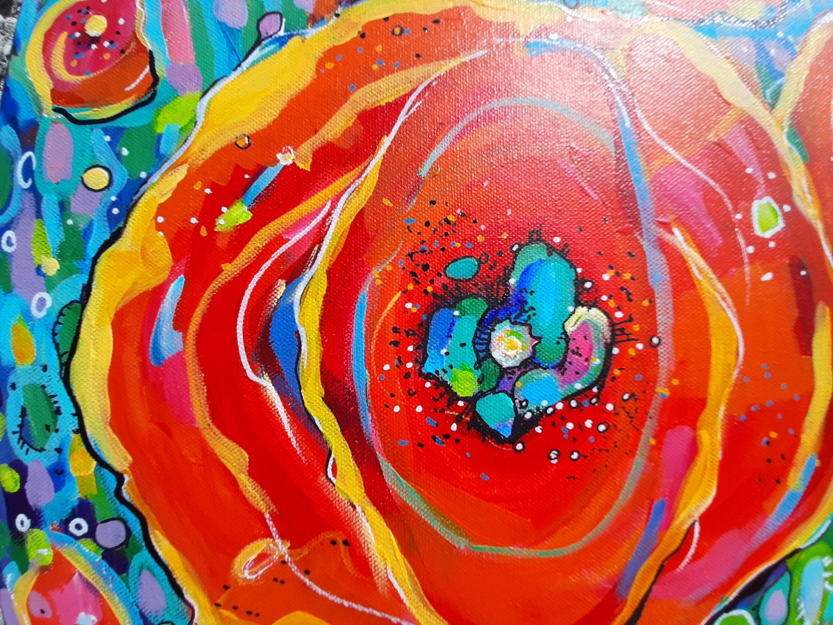 Nowoczesny, niemal abstrakcyjny, pełen kolorów, pejzaż z makami. Niezwykle intensywne barwy, szalone plamy farby, tworzą dynamiczną kompozycję.