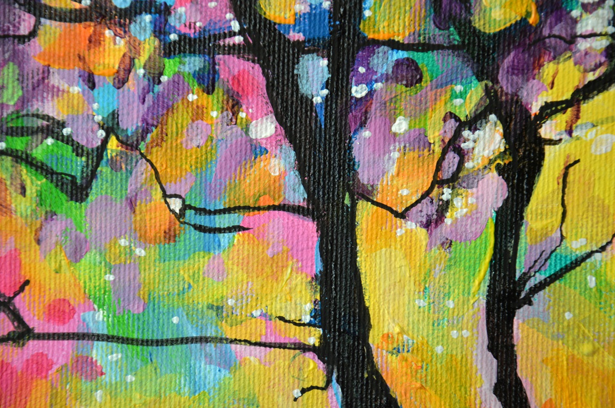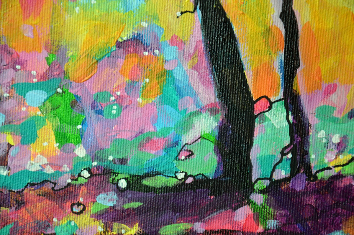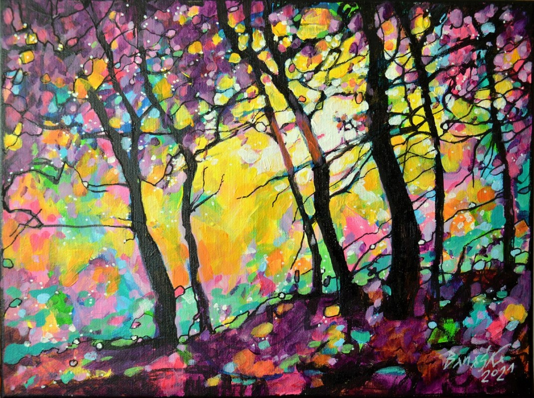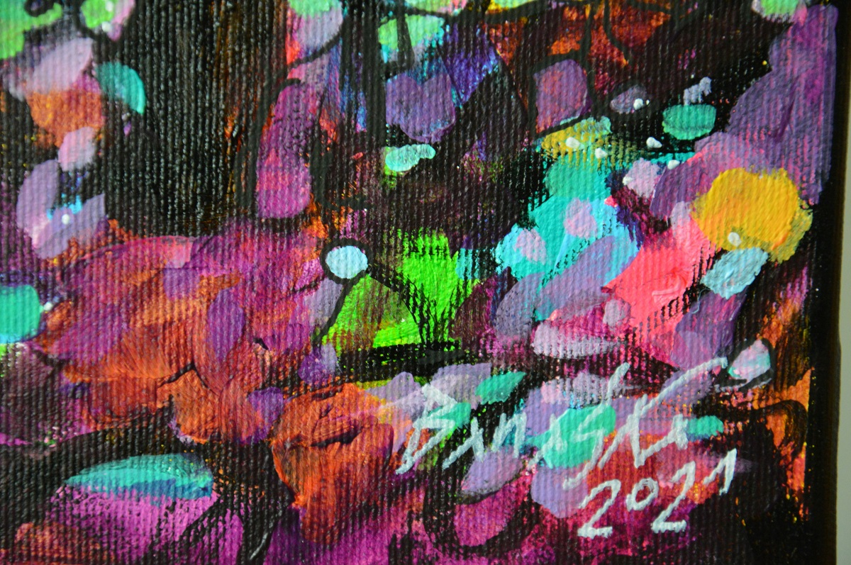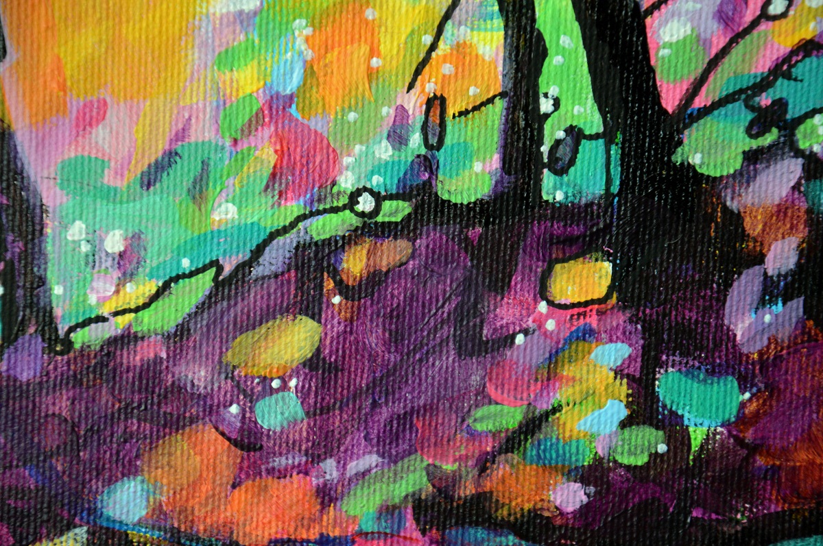Oryginał. Rok powstania: 2021. Technika mieszna: akryl i pisaki olejne i akrylowe. Podobrazie: płótno bawełniane naciągnięte na drewnianą ramę. Rozmiar obrazu: wysokość 30cm, szerokość 40cm. Boki obrazów zamalowane na czarno. Kolory obrazu mogą nieznacznie różnić się od oryginału w zależności od kalibracji monitorów.