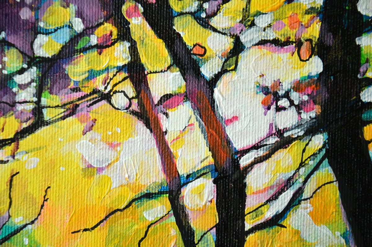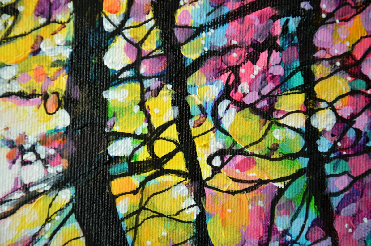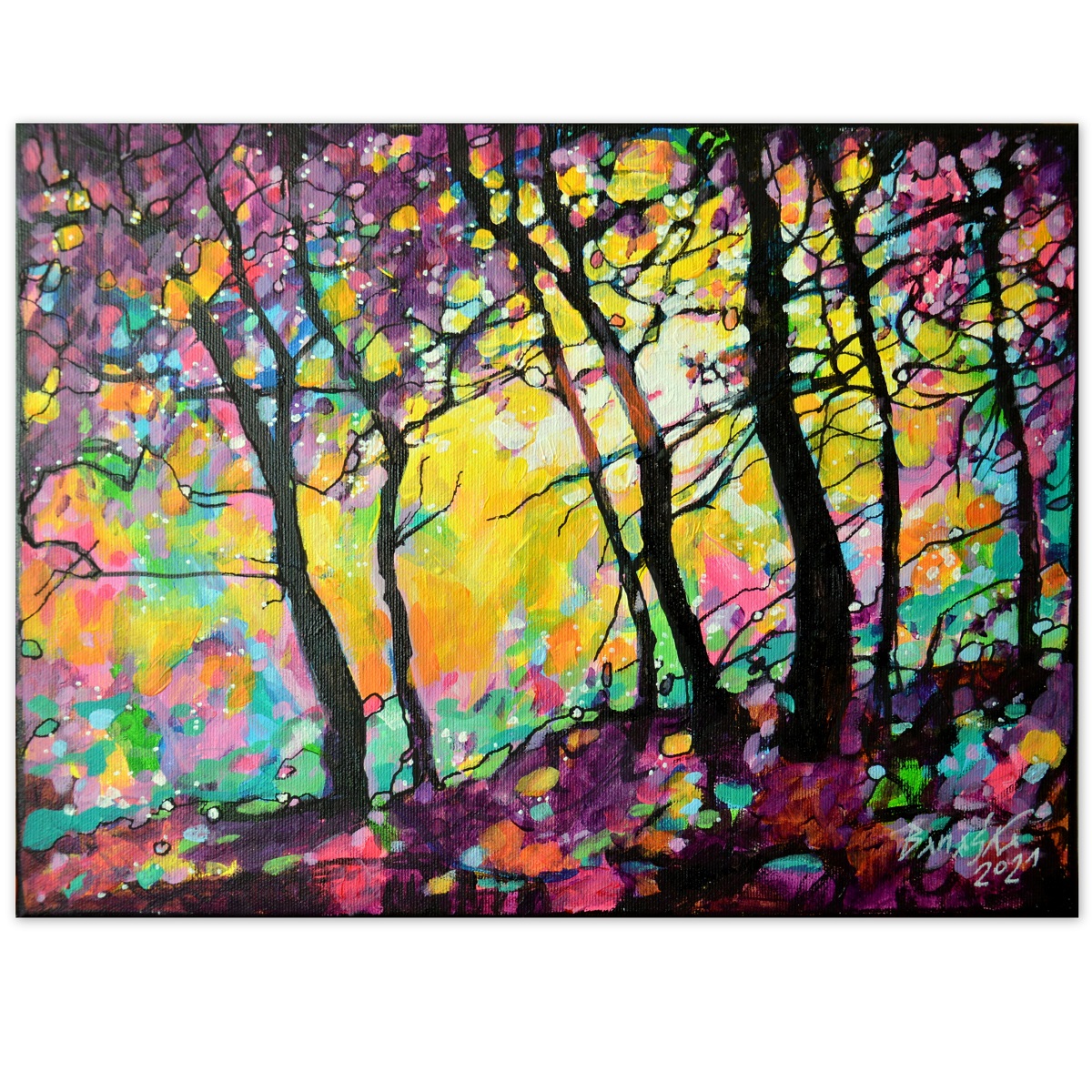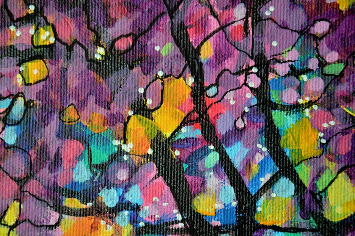 Oryginał. Rok powstania: 2021. Technika mieszna: akryl i pisaki olejne i akrylowe. Podobrazie: płótno bawełniane naciągnięte na drewnianą ramę. Rozmiar obrazu: wysokość 30cm, szerokość 40cm. Boki obrazów zamalowane na czarno. Kolory obrazu mogą nieznacznie różnić się od oryginału w zależności od kalibracji monitorów.