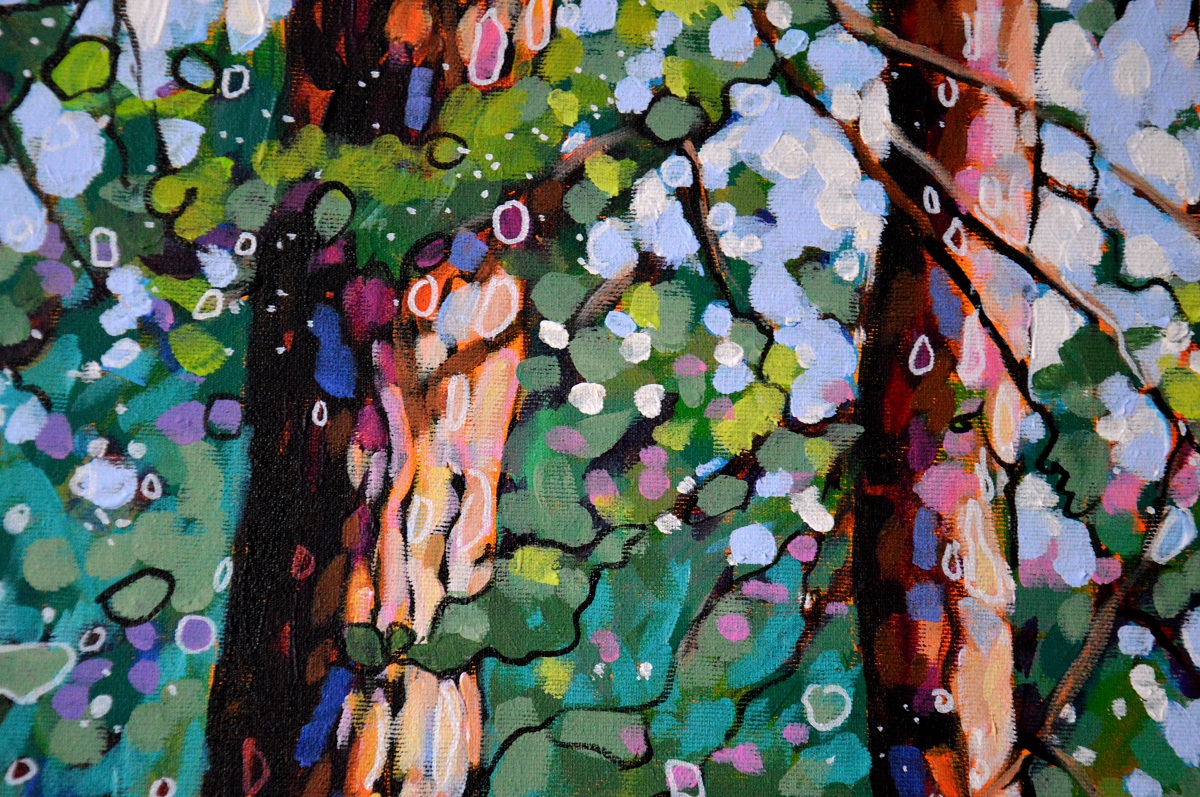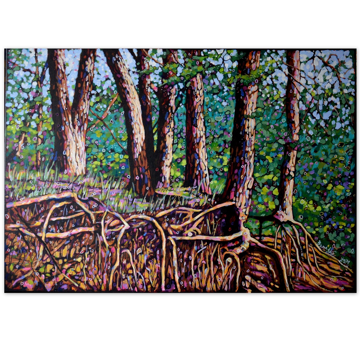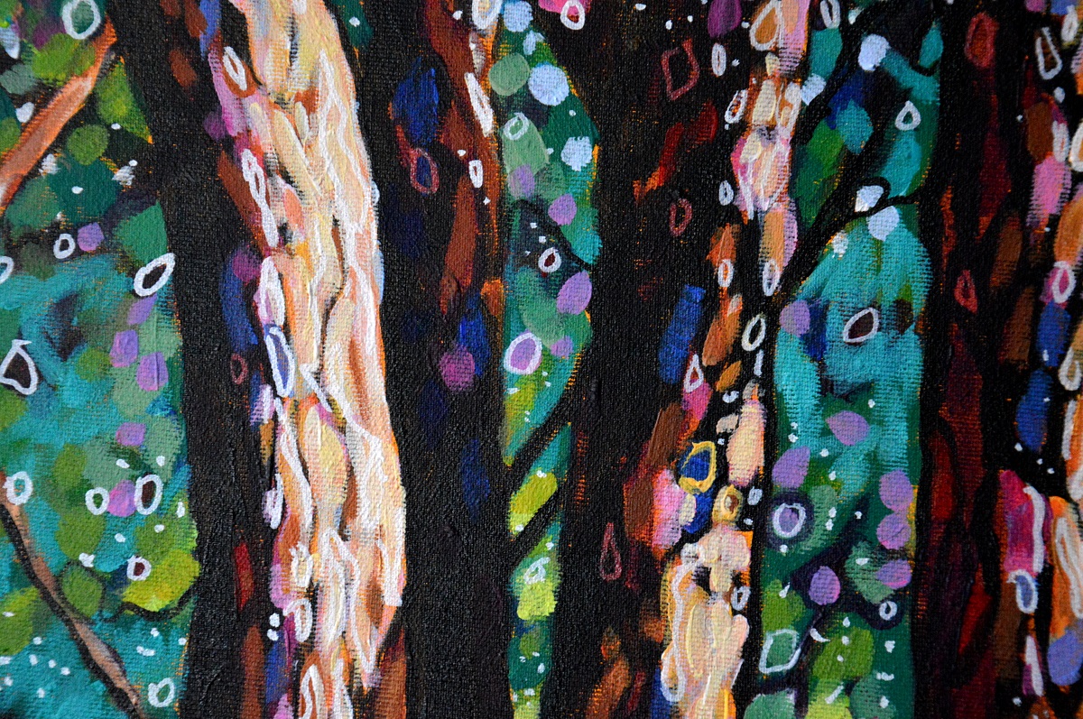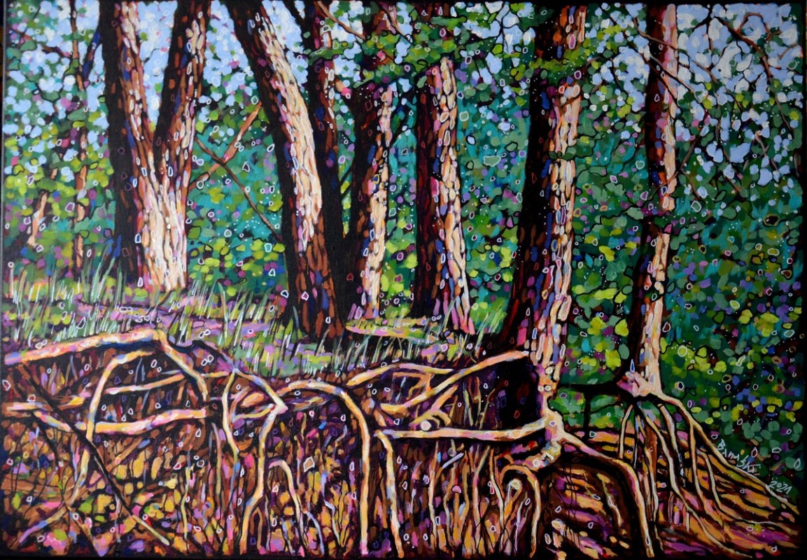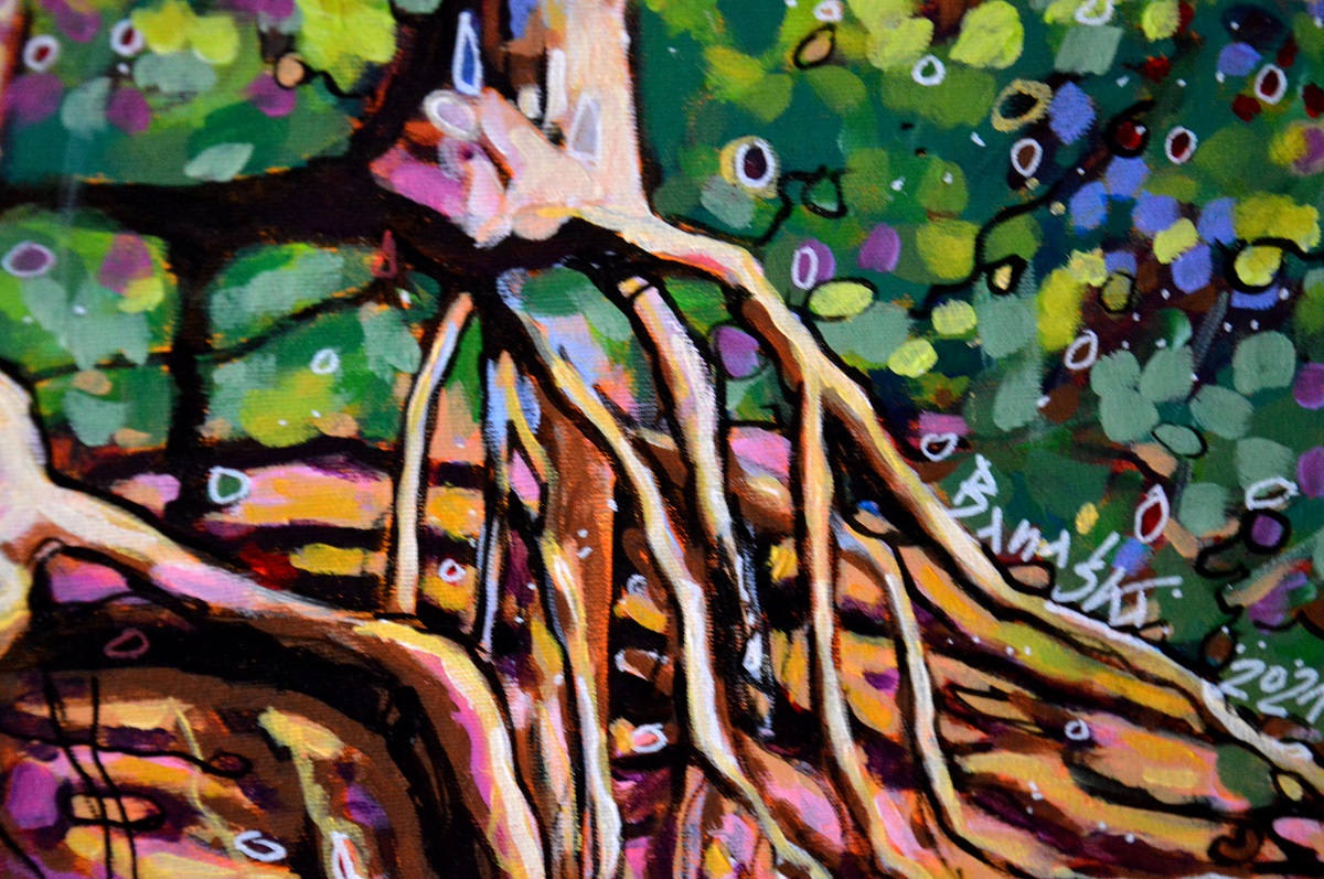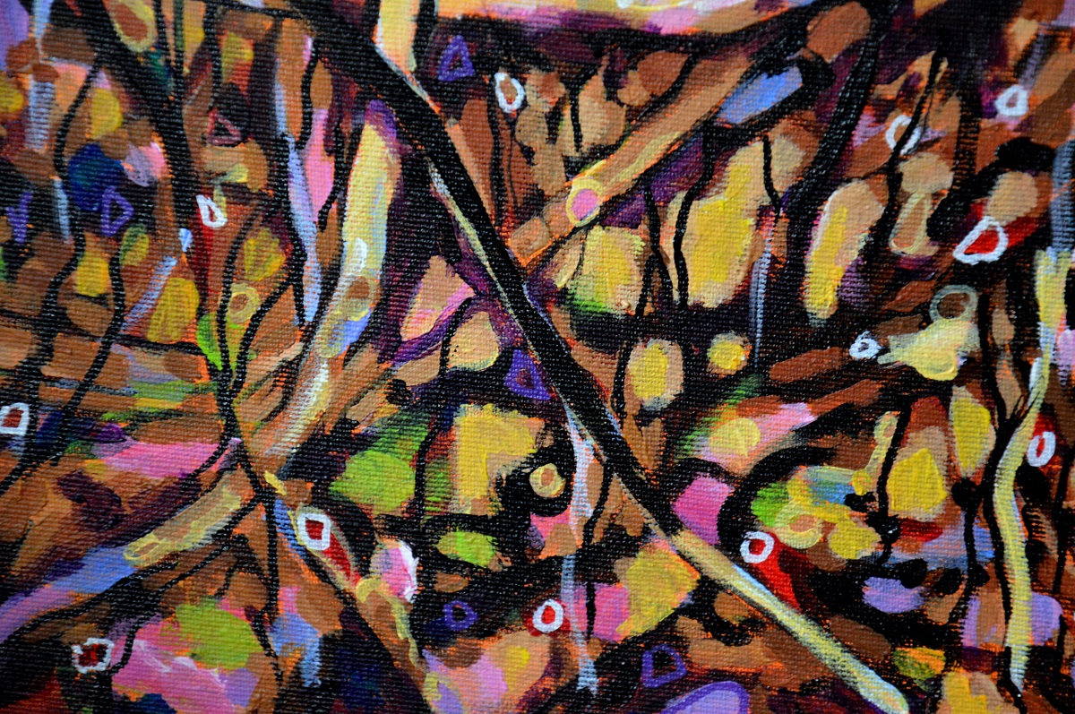 Oryginał. Rok powstania: 2021. Technika mieszna: akryl i pisaki olejne i akrylowe. Podobrazie: płótno bawełniane naciągnięte na drewnianą ramę. Rozmiar obrazu: wysokość 70cm, szerokość 100cm. Boki obrazów zamalowane na czarno. Kolory obrazu mogą nieznacznie różnić się od oryginału w zależności od kalibracji monitorów.
