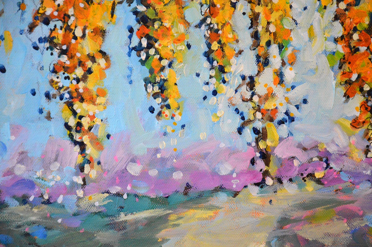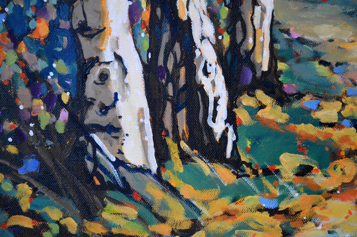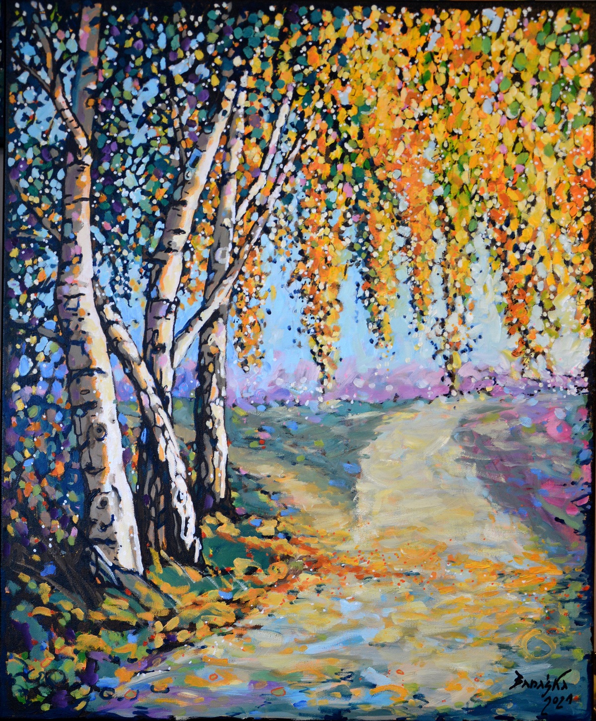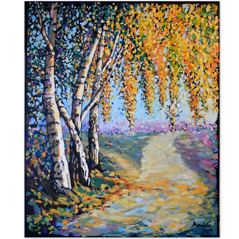 Jesienny pejzaż z brzozami i drogą. Gorące tony żółci i oranżów w koranach drzew kontrastują z chłodnymi barwami tła i bladej, polnej drogi.