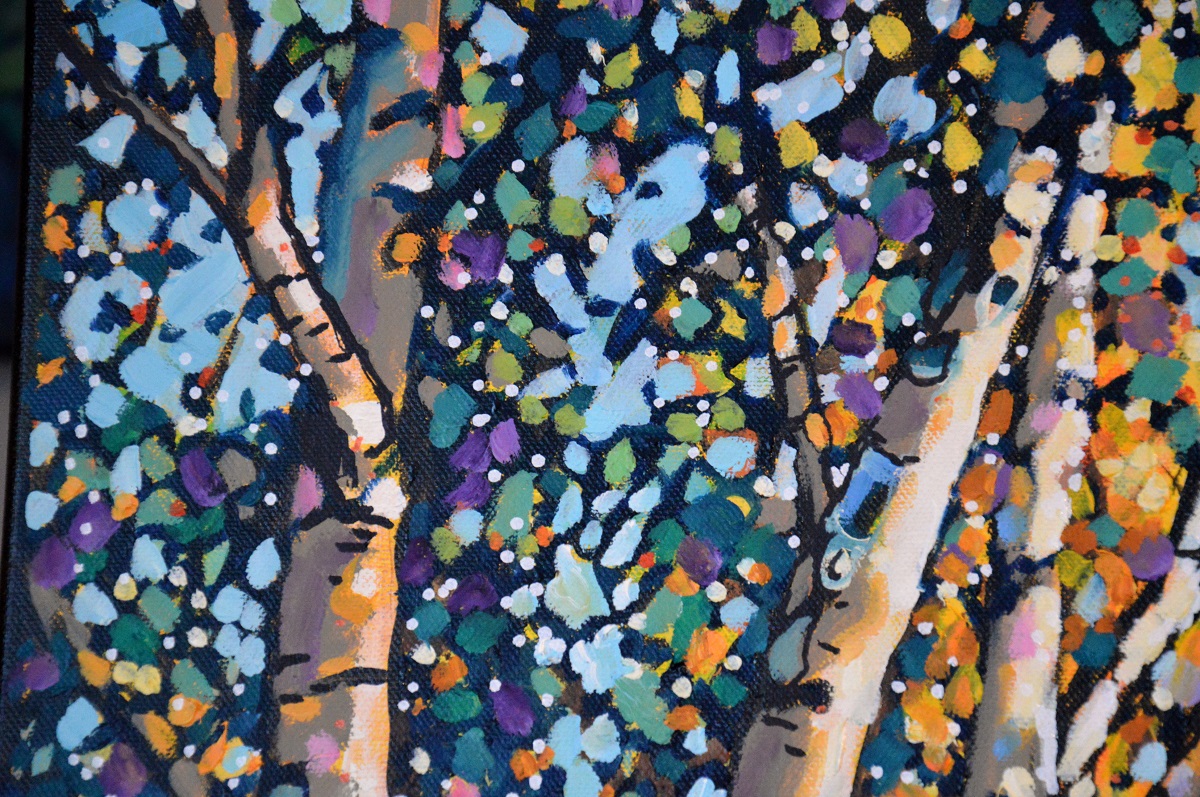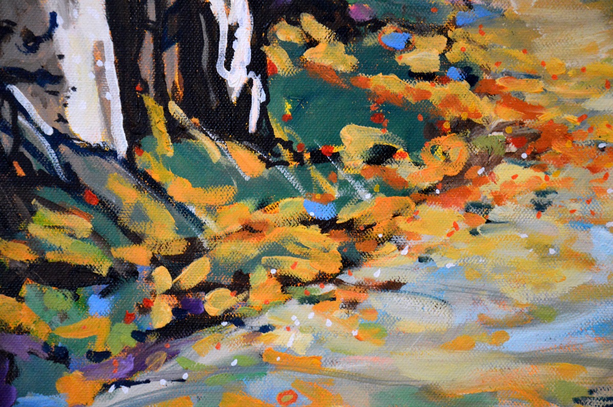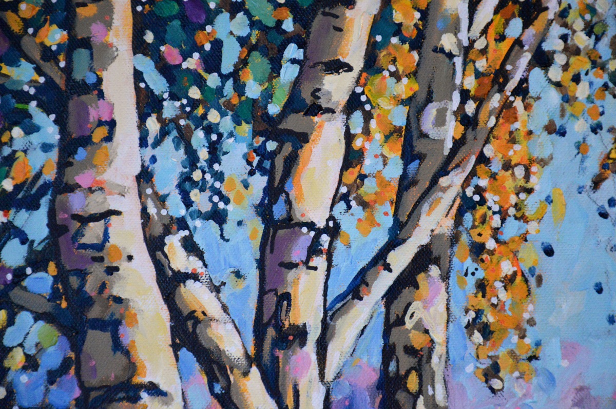 Jesienny pejzaż z brzozami i drogą. Gorące tony żółci i oranżów w koranach drzew kontrastują z chłodnymi barwami tła i bladej, polnej drogi.