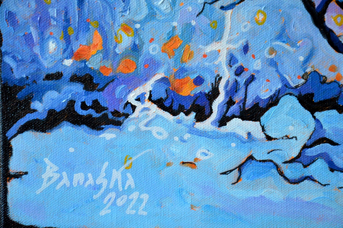 Oryginał. Rok powstania: 2022. Technika: olej i pisaki olejowe. Podobrazie: płótno bawełniane naciągnięte na drewnianą ramę. Rozmiar obrazu: wysokość 60cm, szerokość 73cm. Boki obrazów zamalowane na czarno. Kolory obrazu mogą nieznacznie różnić się od oryginału w zależności od kalibracji monitorów.