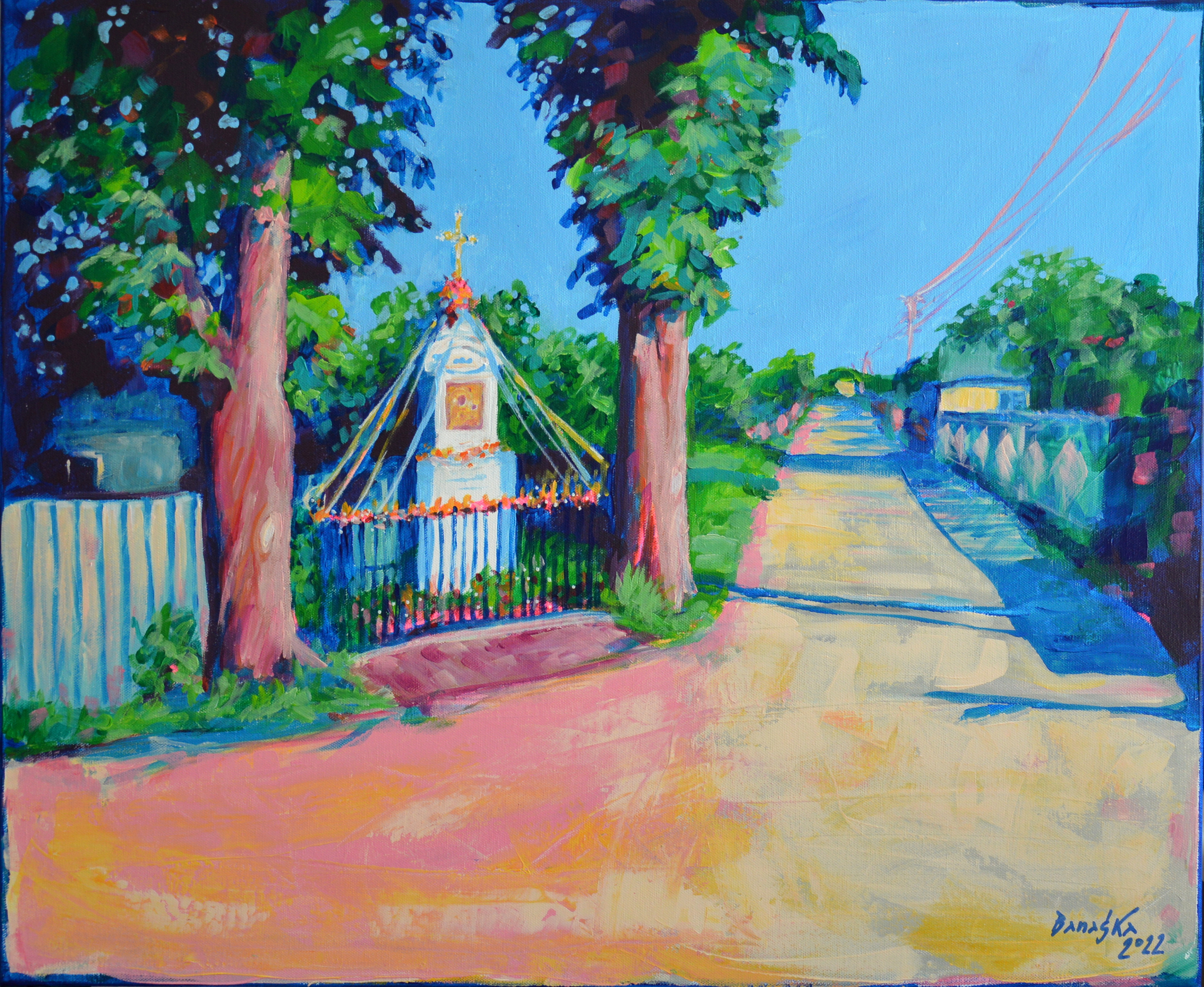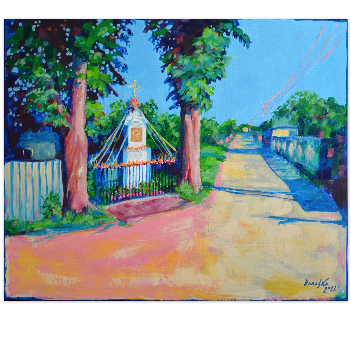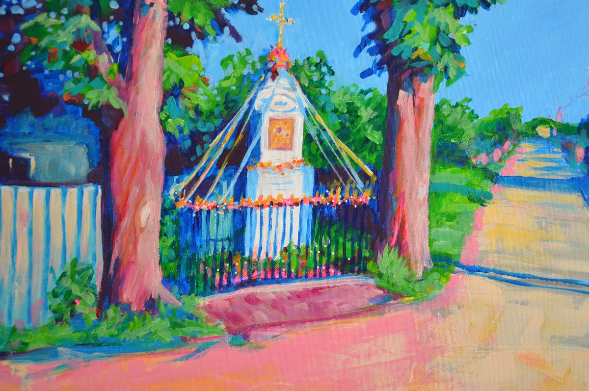 Skrzyżowanie w środku wsi. Musowo z kapliczką. Rolę stróżów pełnią stare kasztanowce. Poranne słońce podświetla linie elektryczne. płoty i drzewa rzucają błękitne cienie. Z lewej zaróżowiona droga gruntowa. Przed nami prosta wiejska droga. Można ruszać dalej…