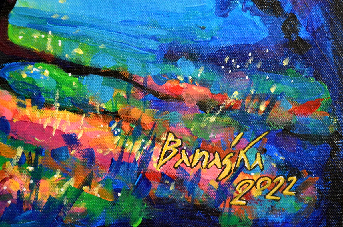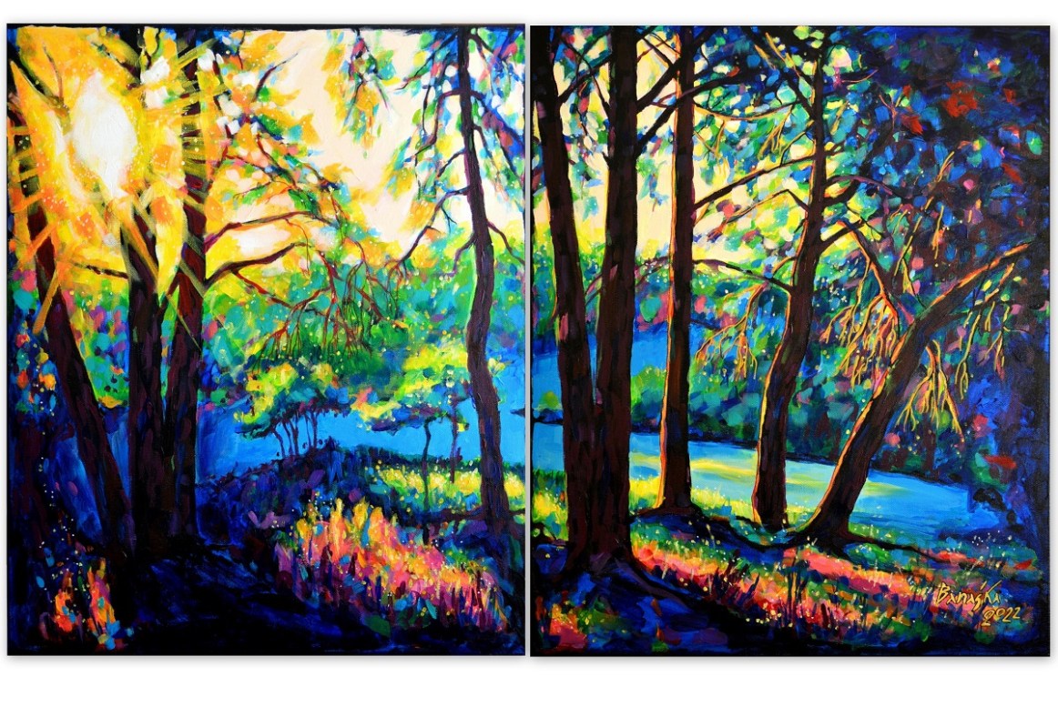 Oryginał. Rok powstania: 2022. Technika: akryl. Podobrazie: płótno bawełniane naciągnięte na drewnianą ramę. Rozmiar obrazu: wysokość 73cm, szerokość 60cm x2szt. (łącznie 73cmx120cm). Boki obrazów zamalowane na czarno. Kolory obrazu mogą nieznacznie różnić się od oryginału w zależności od kalibracji monitorów.