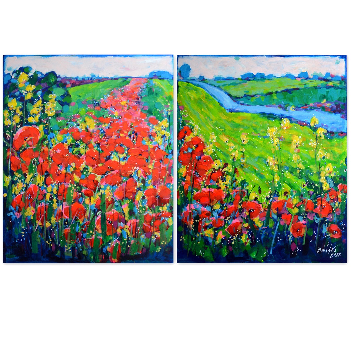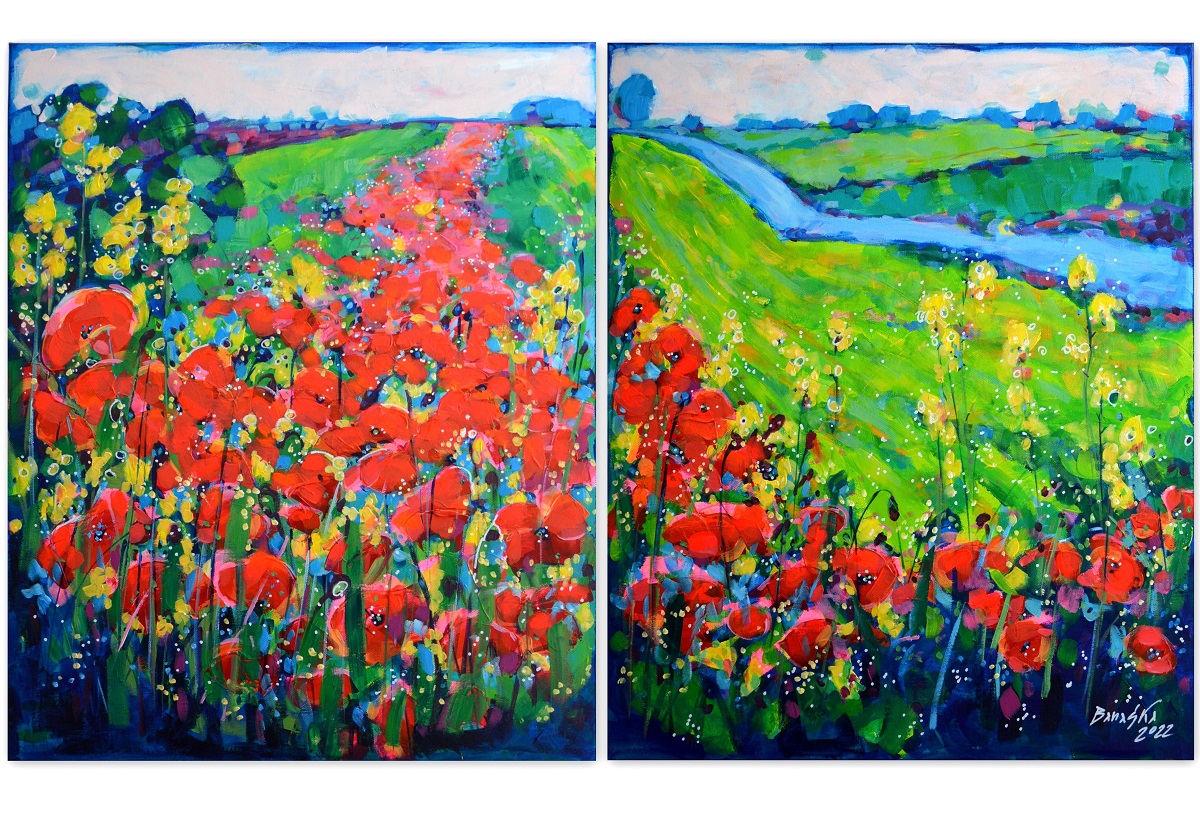 Oryginał. Rok powstania: 2022. Technika: akryl. Podobrazie: płótno bawełniane naciągnięte na drewnianą ramę. Rozmiar obrazu: wysokość 73cm, szerokość 60cm x2szt. (łącznie 73cmx120cm). Boki obrazów zamalowane na granatowo. Kolory obrazu mogą nieznacznie różnić się od oryginału w zależności od kalibracji monitorów.