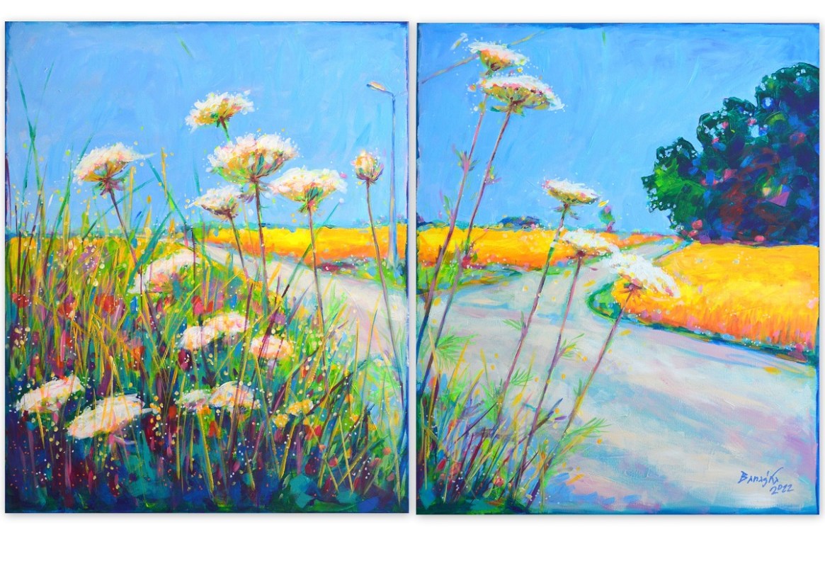 Oryginał. Rok powstania: 2022. Technika: akryl. Podobrazie: płótno bawełniane naciągnięte na drewnianą ramę. Rozmiar obrazu: wysokość 73cm, szerokość 60cm x2szt. (łącznie 73cmx120cm). Boki obrazów zamalowane na granatowo. Kolory obrazu mogą nieznacznie różnić się od oryginału w zależności od kalibracji monitorów.