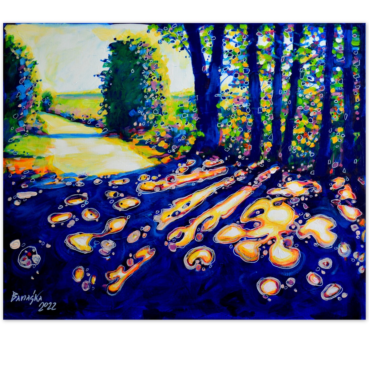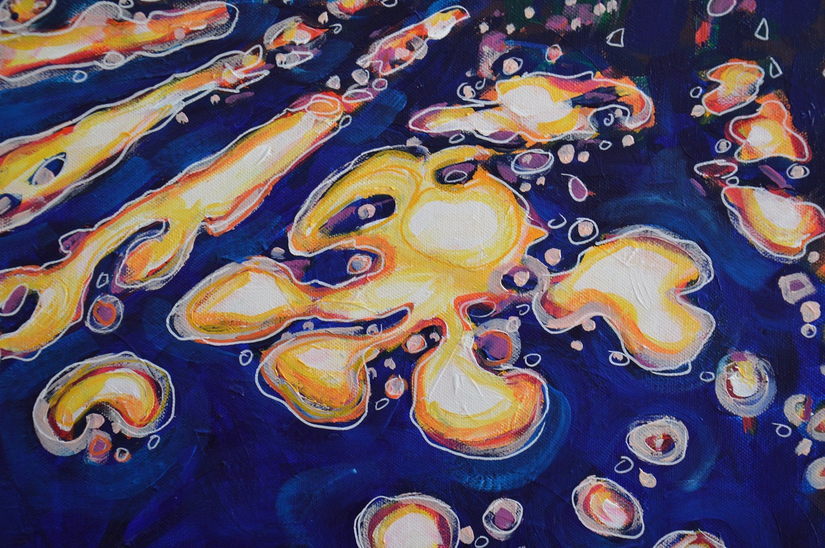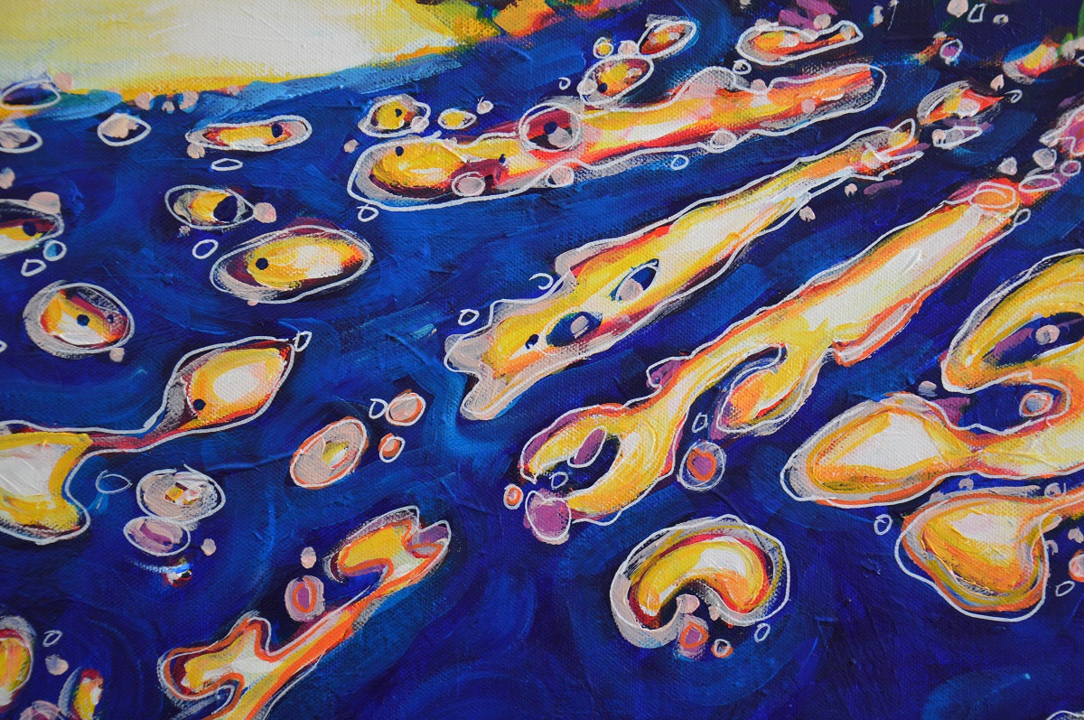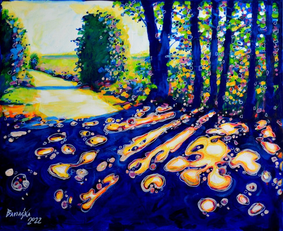 Oryginał. Rok powstania: 2022. Technika: akryl. Podobrazie: płótno bawełniane naciągnięte na drewnianą ramę. Rozmiar obrazu: wysokość 60cm, szerokość 73cm. Boki obrazów zamalowane na granatowo. Kolory obrazu mogą nieznacznie różnić się od oryginału w zależności od kalibracji monitorów.