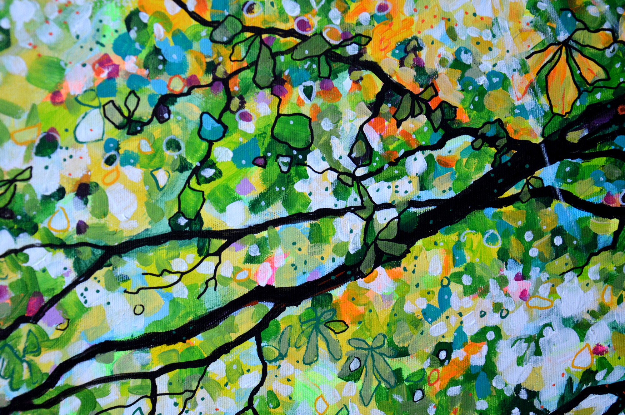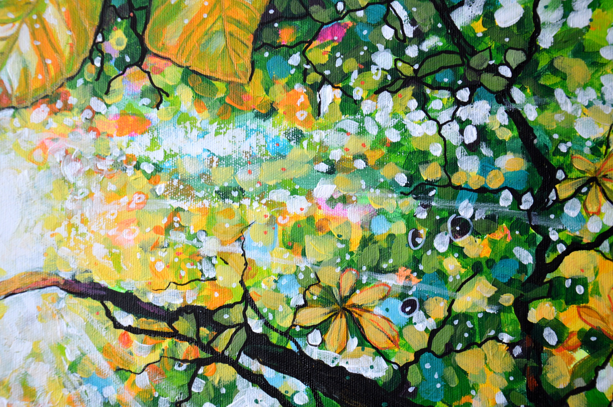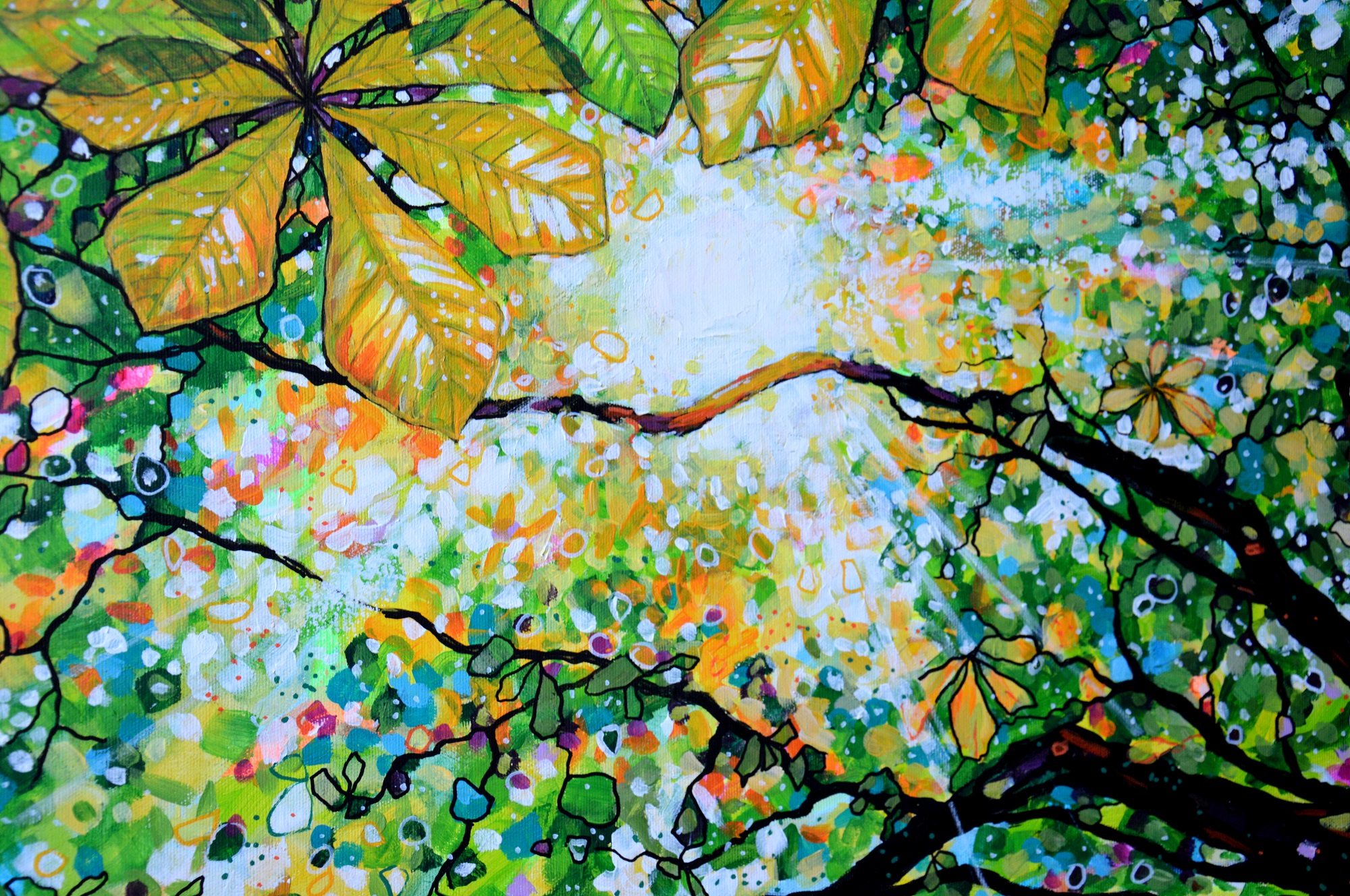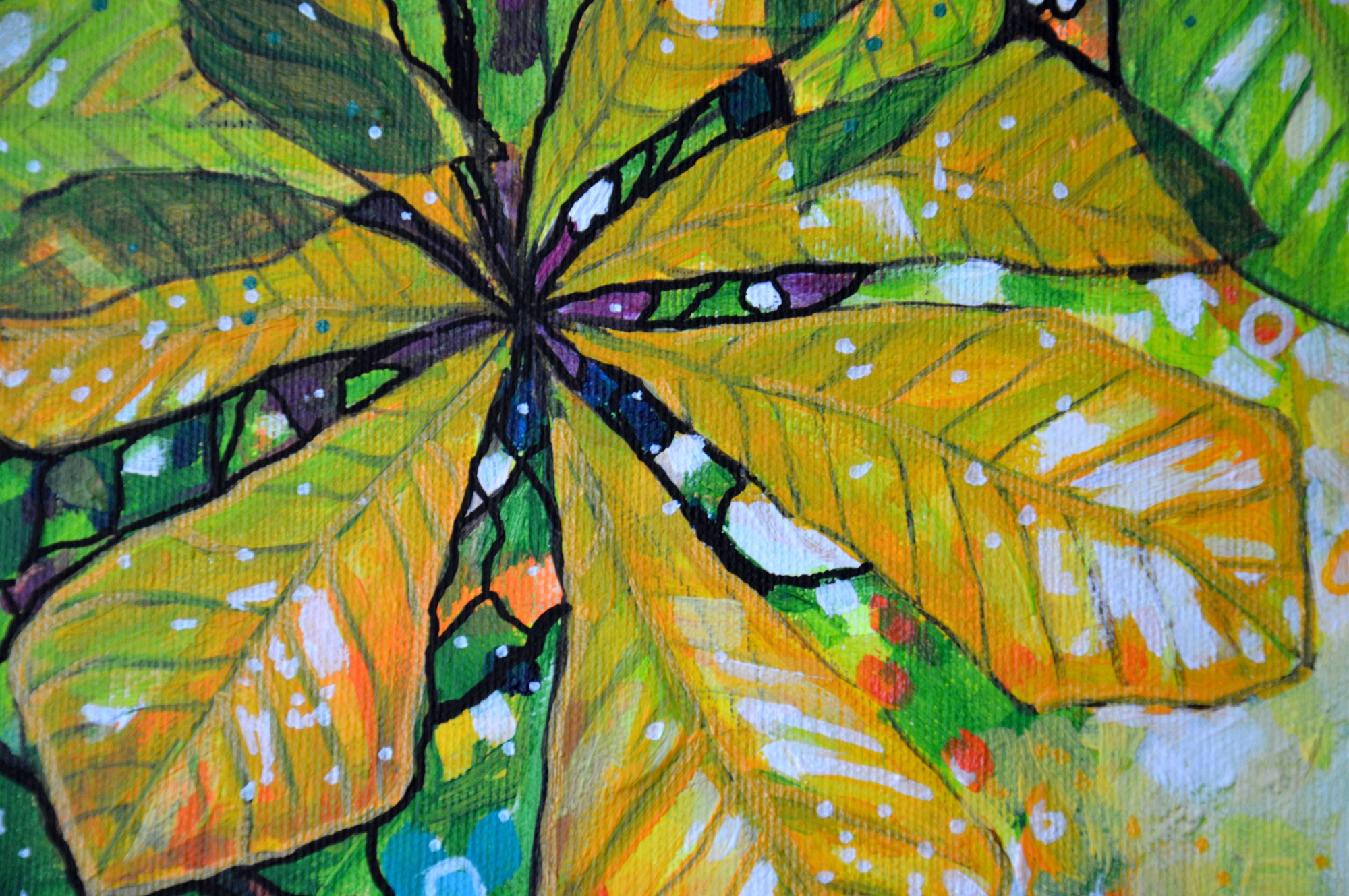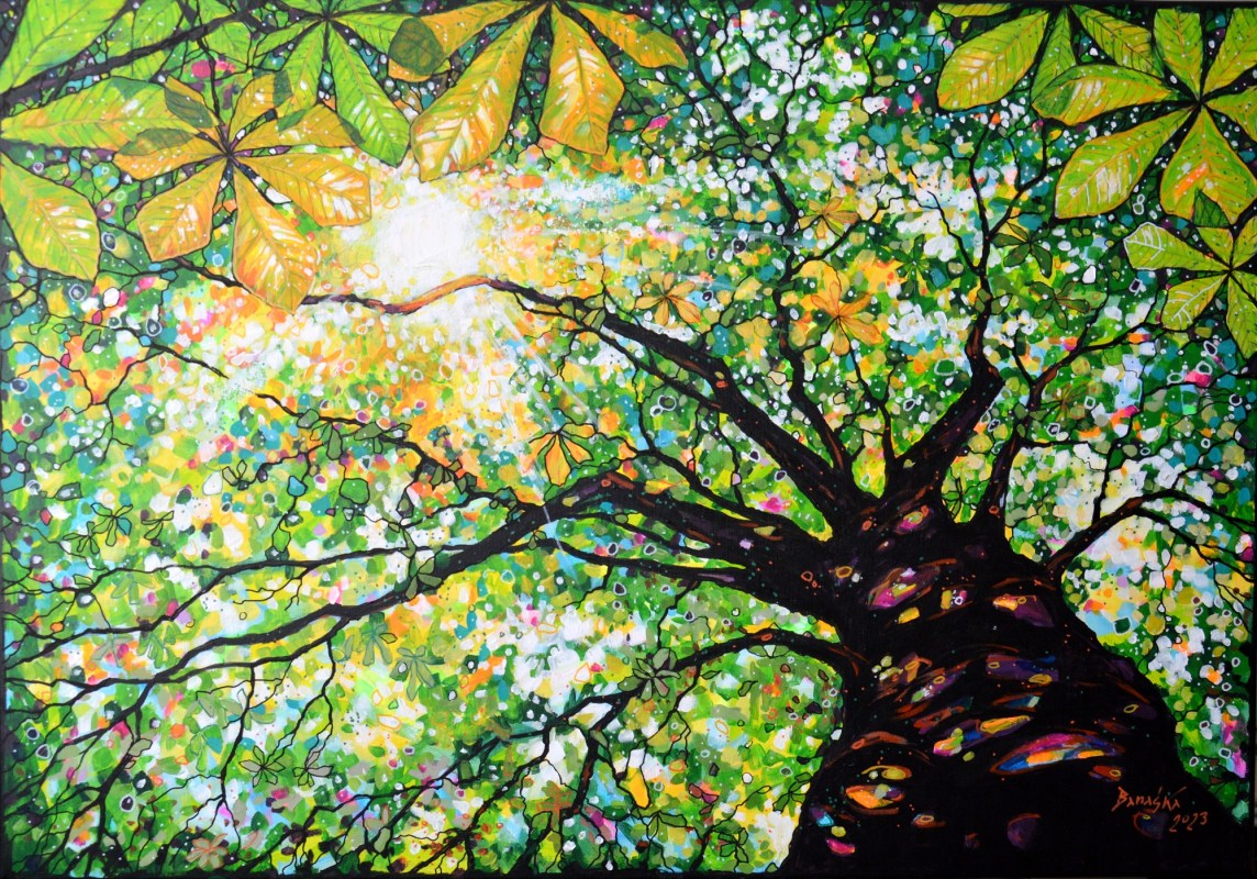 Kolosalne drzewo. Majestatyczne. Pokręcone konary zakończone wielkimi palczastymi liśćmi robią wrażenie. Ale, kiedy wczesna jesień lekko pozłoci koronę, a słoneczne promienie połaskoczą i rozświetlą wnętrze, grając „zajączkami” na korze, kasztanowiec zaraz się uśmiecha…
