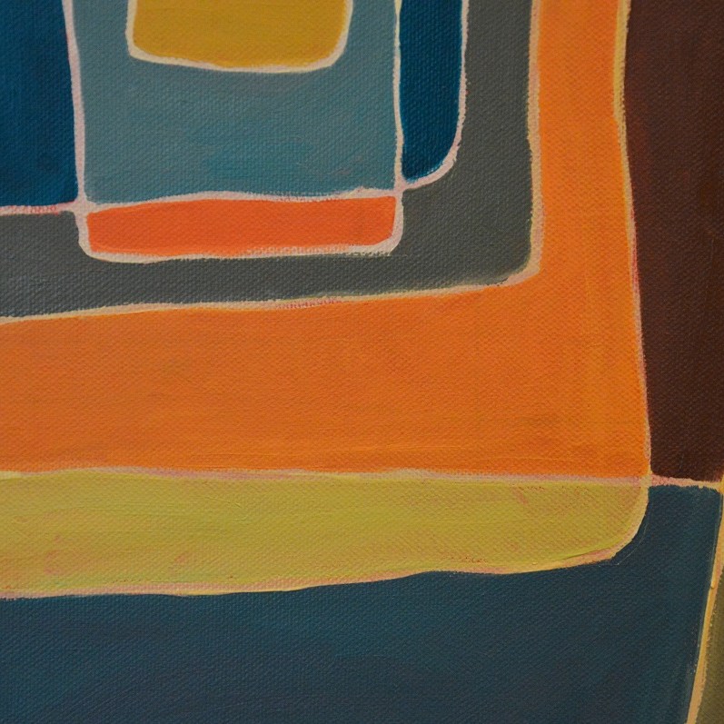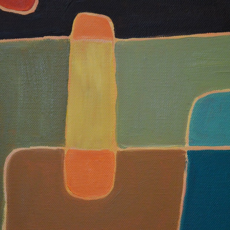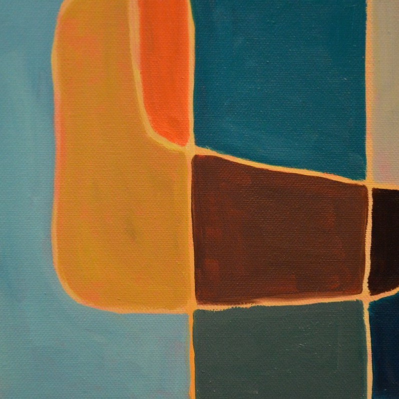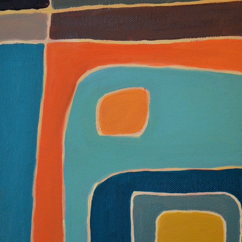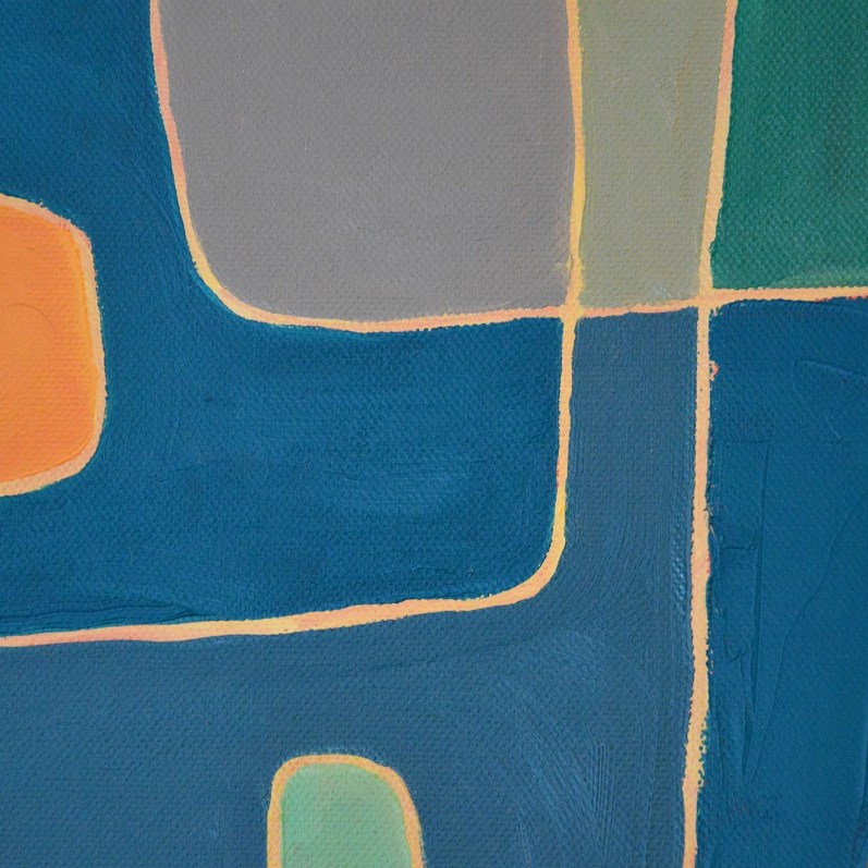 Barwna abstrakcja z przenikającymi się miękkimi kształtami. Można wieszać „na dowolnym boku”, nie ma wyznaczego układu góra-dół.