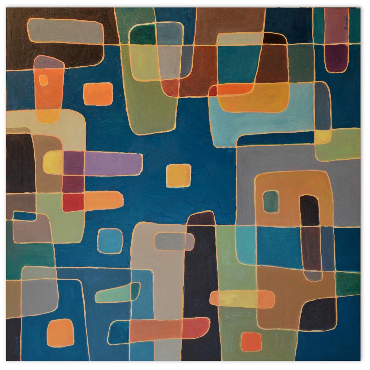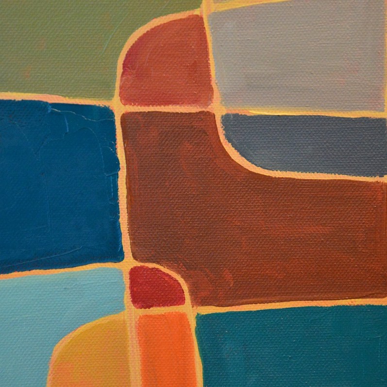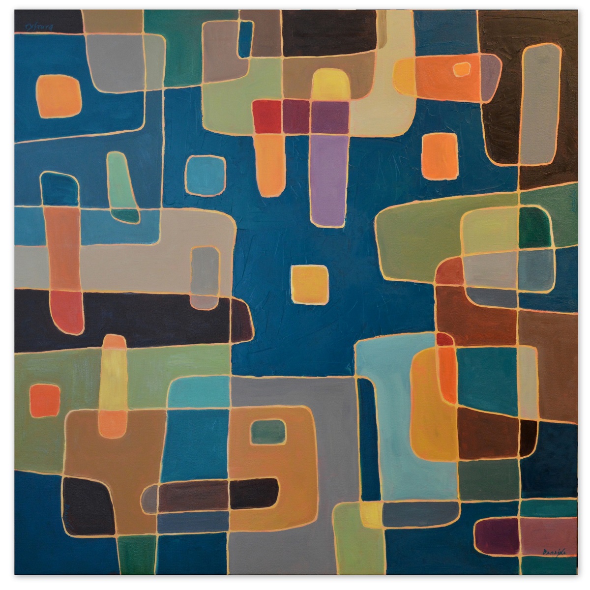 Barwna abstrakcja z przenikającymi się miękkimi kształtami. Można wieszać „na dowolnym boku”, nie ma wyznaczego układu góra-dół.