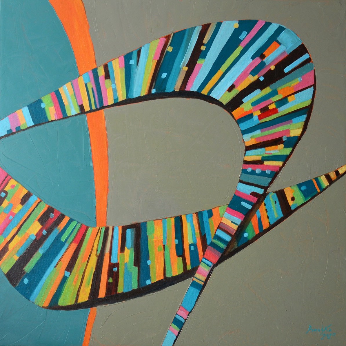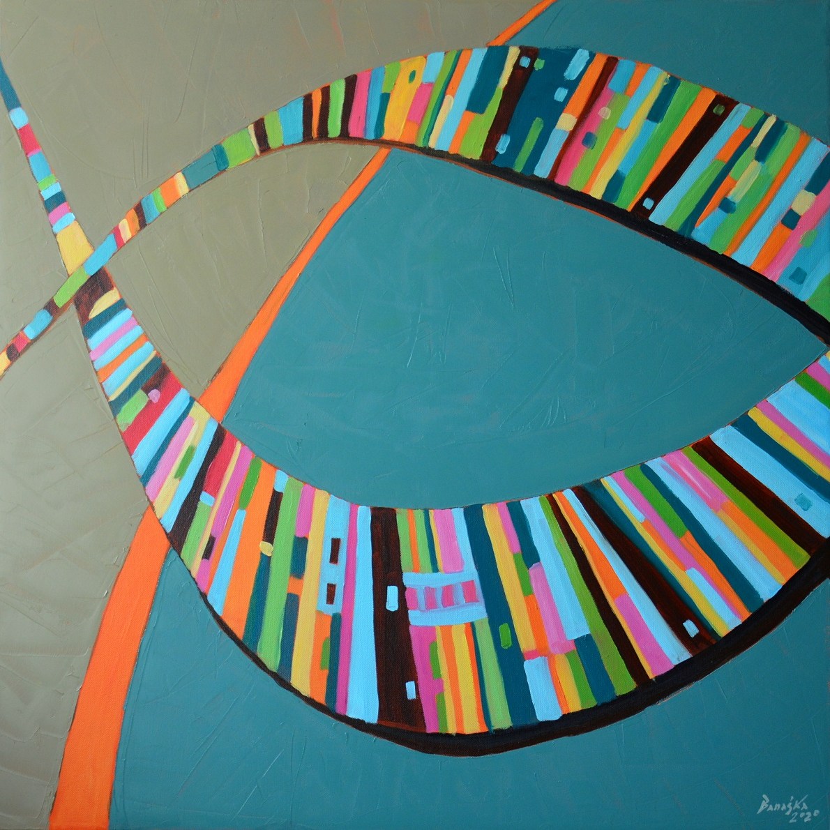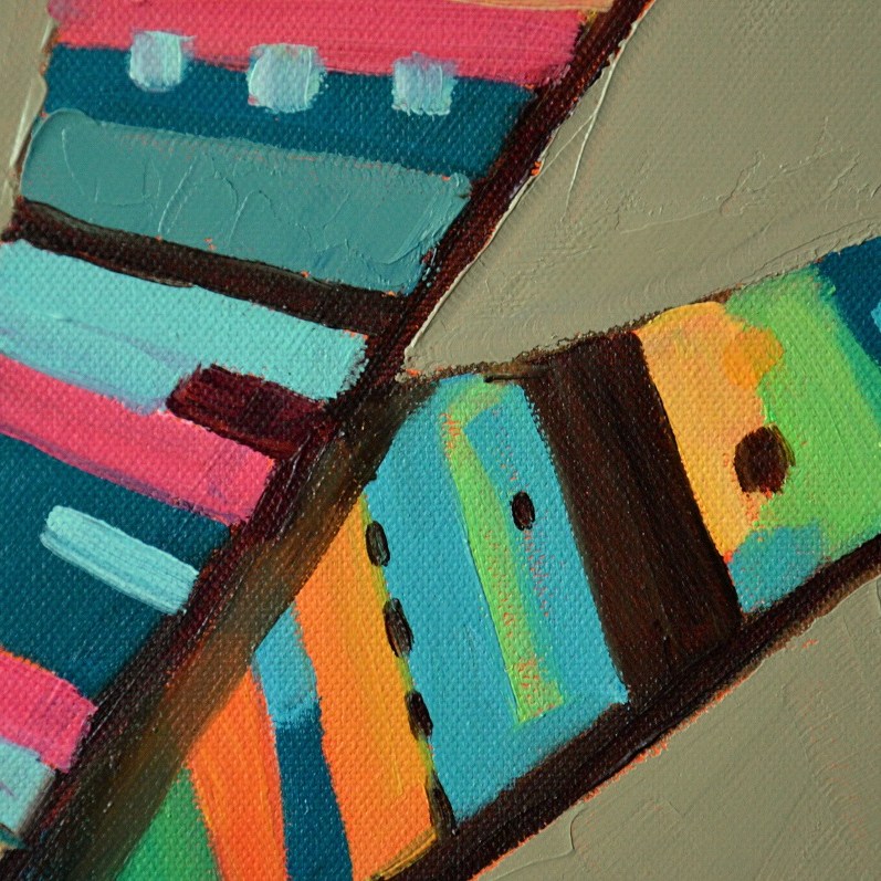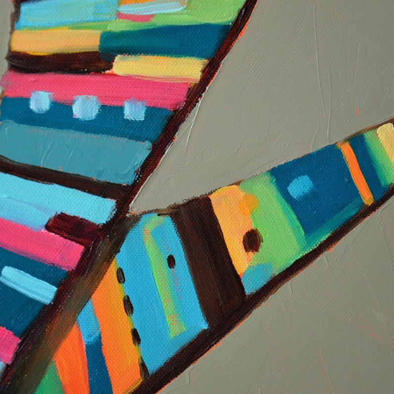 Barwna, dynamiczna kompazycja. Abstrakcyjne kształty wstęg pomalowane w nieregularne kolorowe desenie o lekko folkowym posmaku.